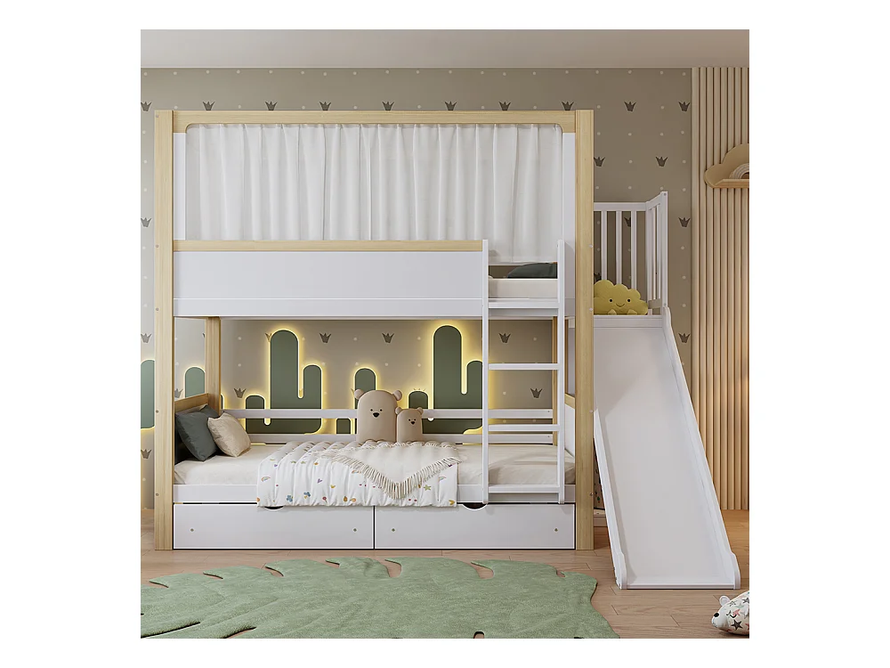 Lit pour enfants 90 x 200 cm, avec tiroirs, toboggan, rideaux en tissu pour le lit supérieur, blanc + couleur naturelle.