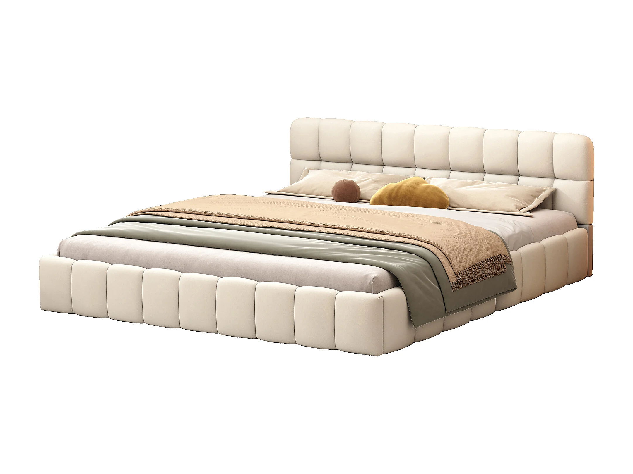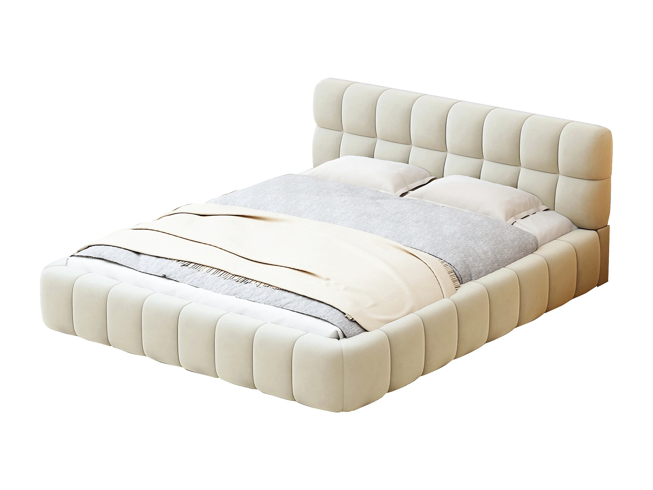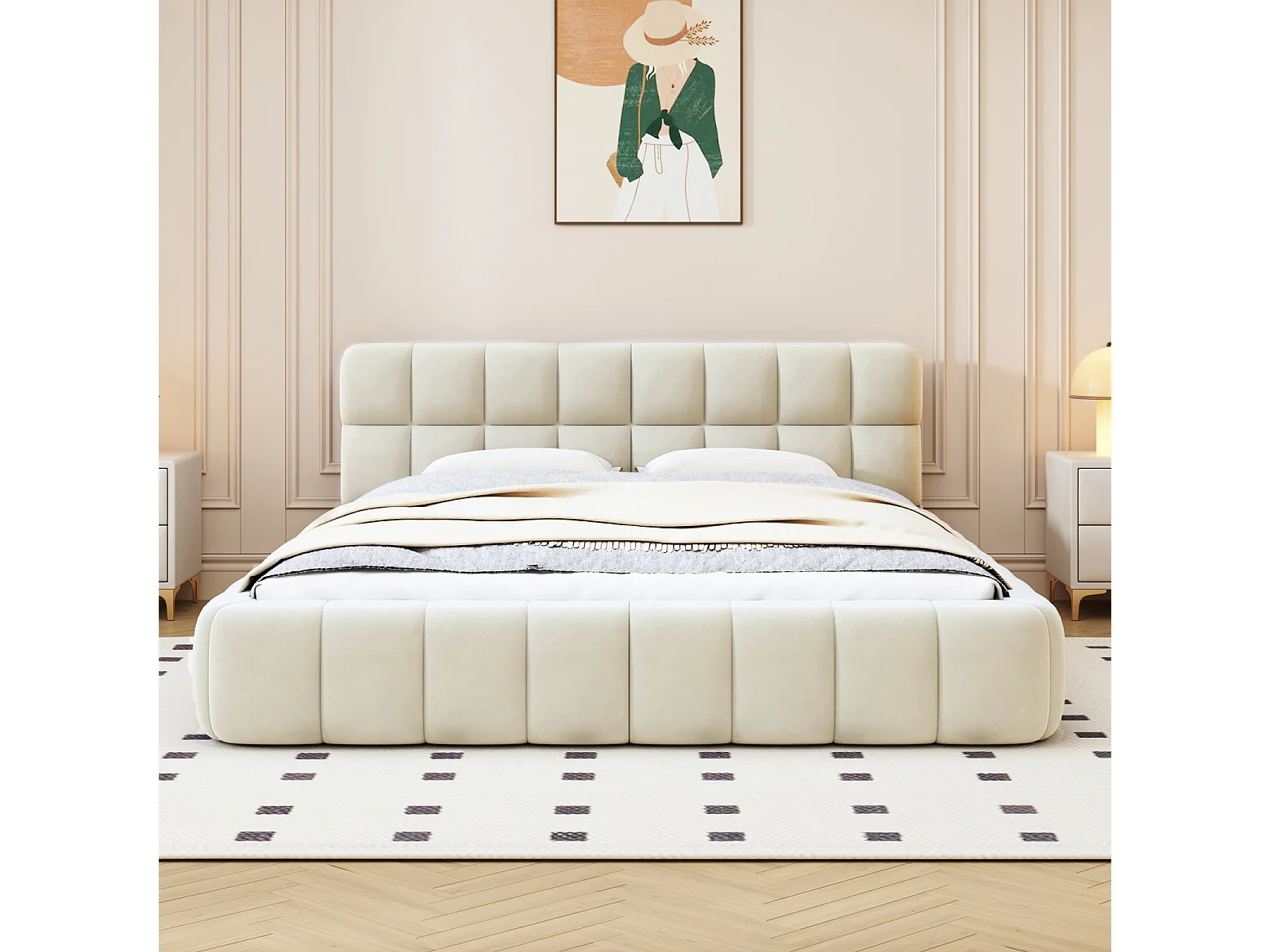 Lit rembourré 140 x 200 cm, lit double avec dossier moelleux, bordure rembourrée, sommier à lattes, lin, beige