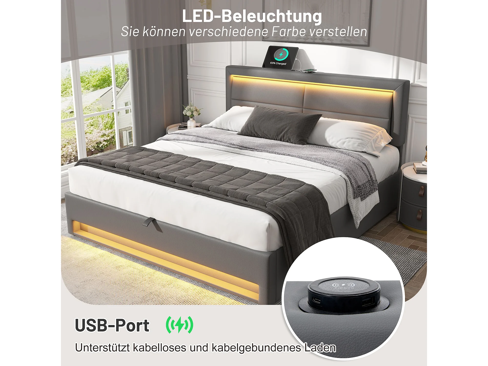 Lit rembourré 140x190 cm, avec port USB, LED et espace de rangement, PU-Litschi, gris (sans matelas)