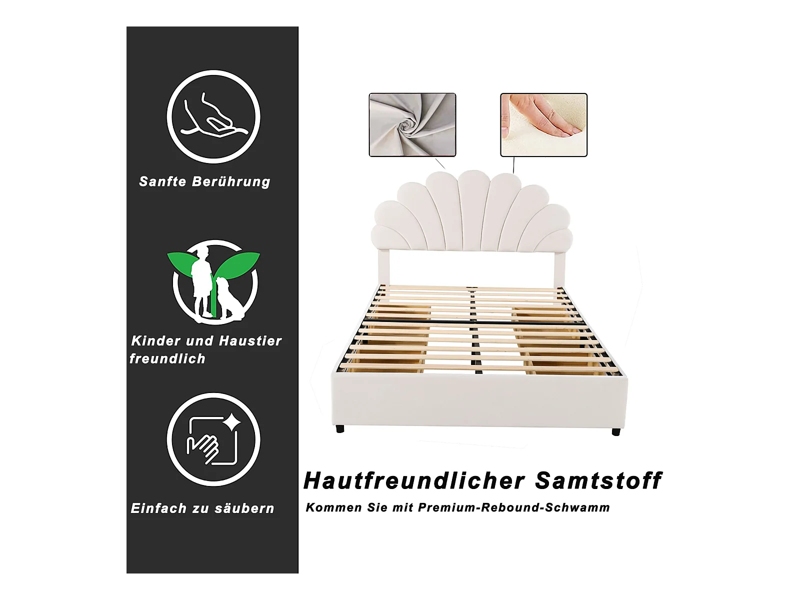 Lit rembourré 140x200 cm beige en velours – Tête de lit fleurie, sommier, rangement, lit ado/adulte