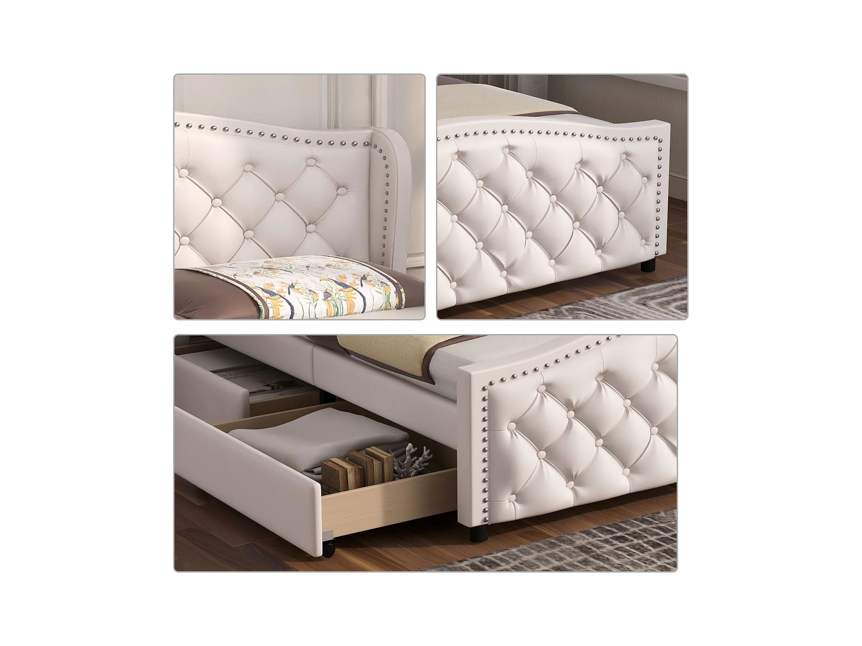 Lit adulte 140x200 cm lit double avec 2 tiroirs et tête de lit Riveté - cuir artificiel blanc - sans matelas