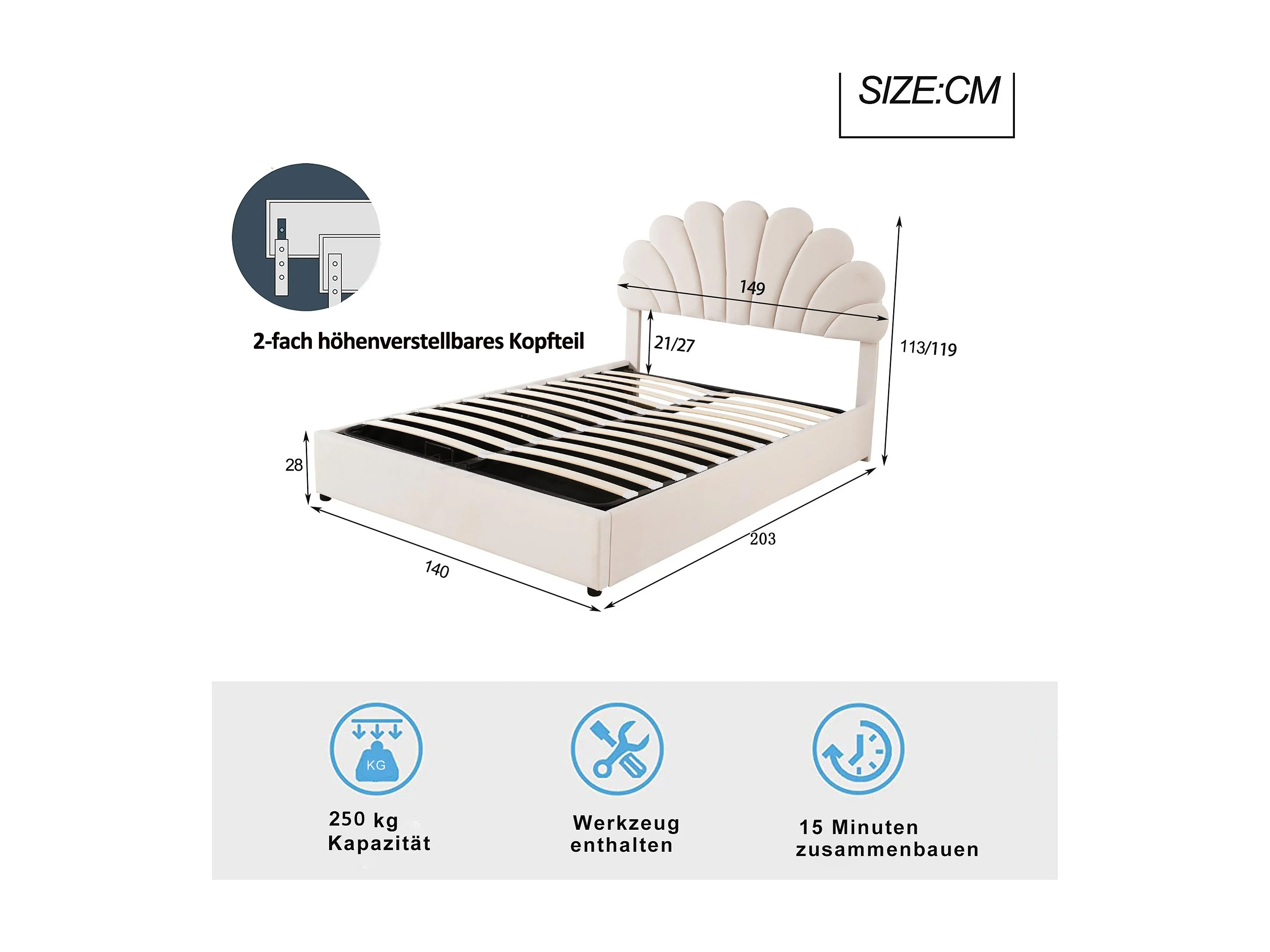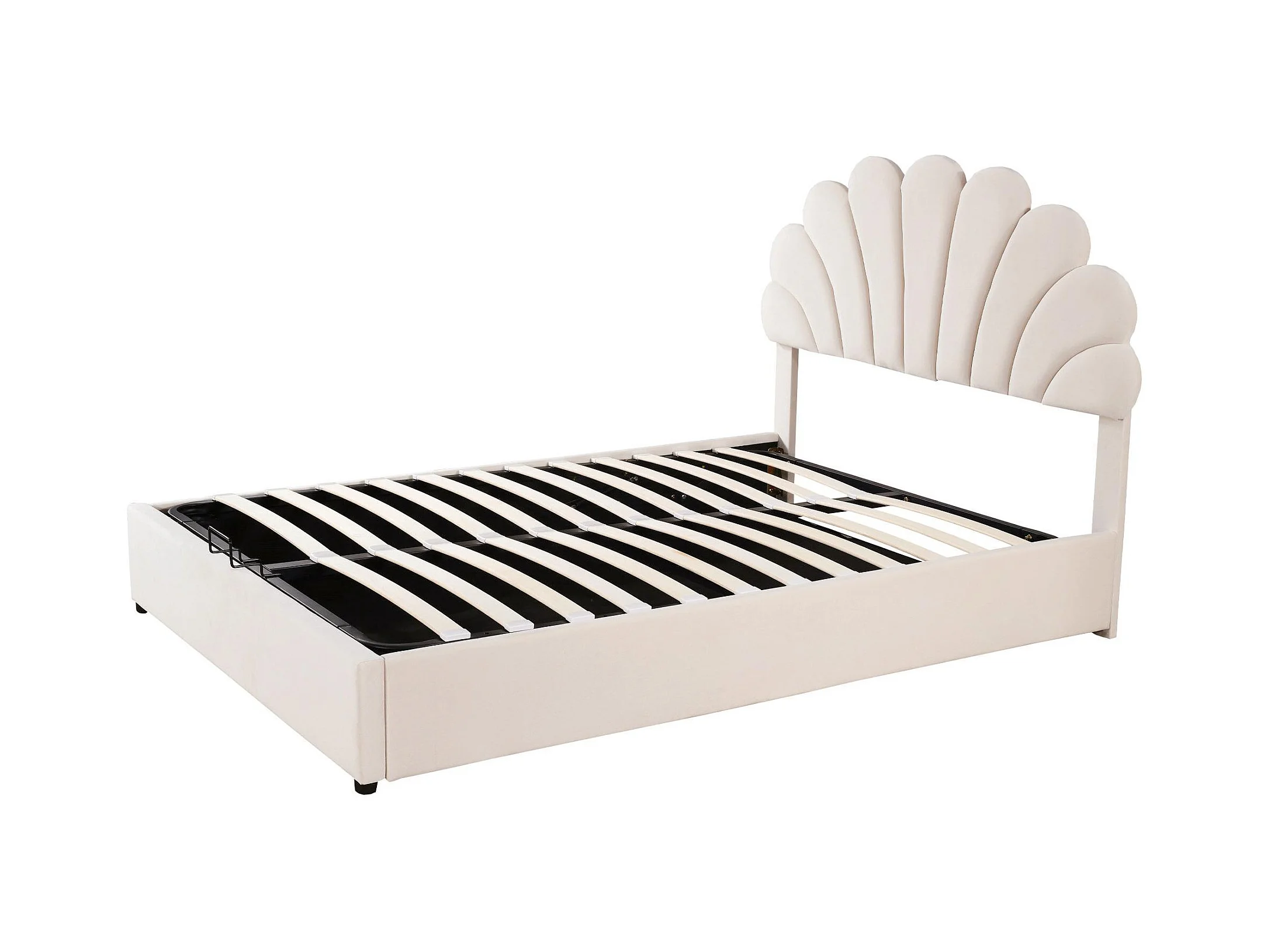 Lit rembourré 140x200 cm, tête fleurie, sommier, rangement hydraulique, velours beige, lit junior