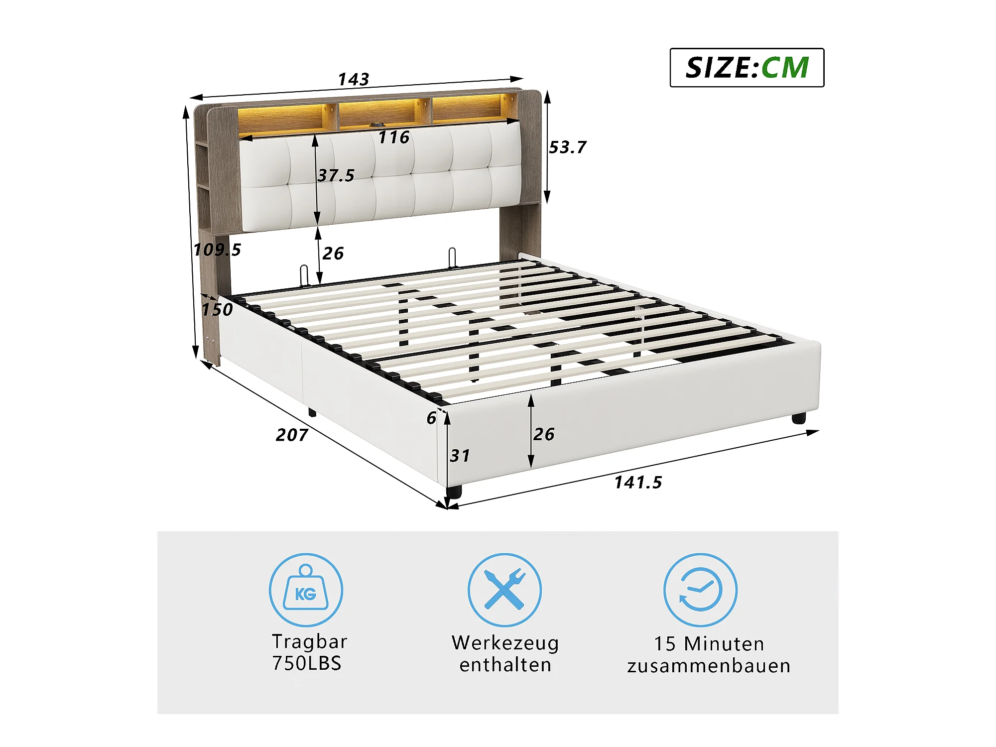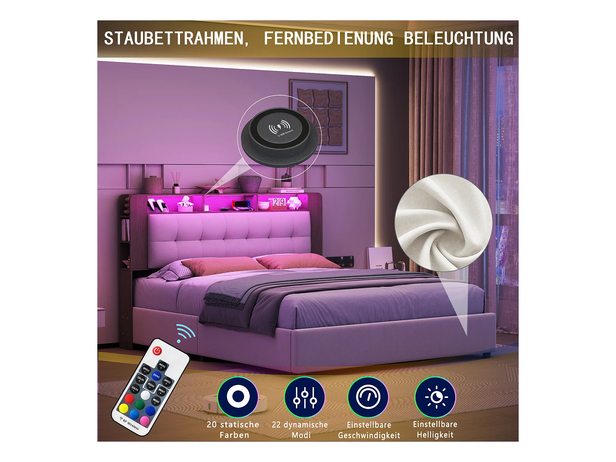 Lit Rembourré 140x200cm avec sommier à lattes, lit coffre et LED, velours, blanc