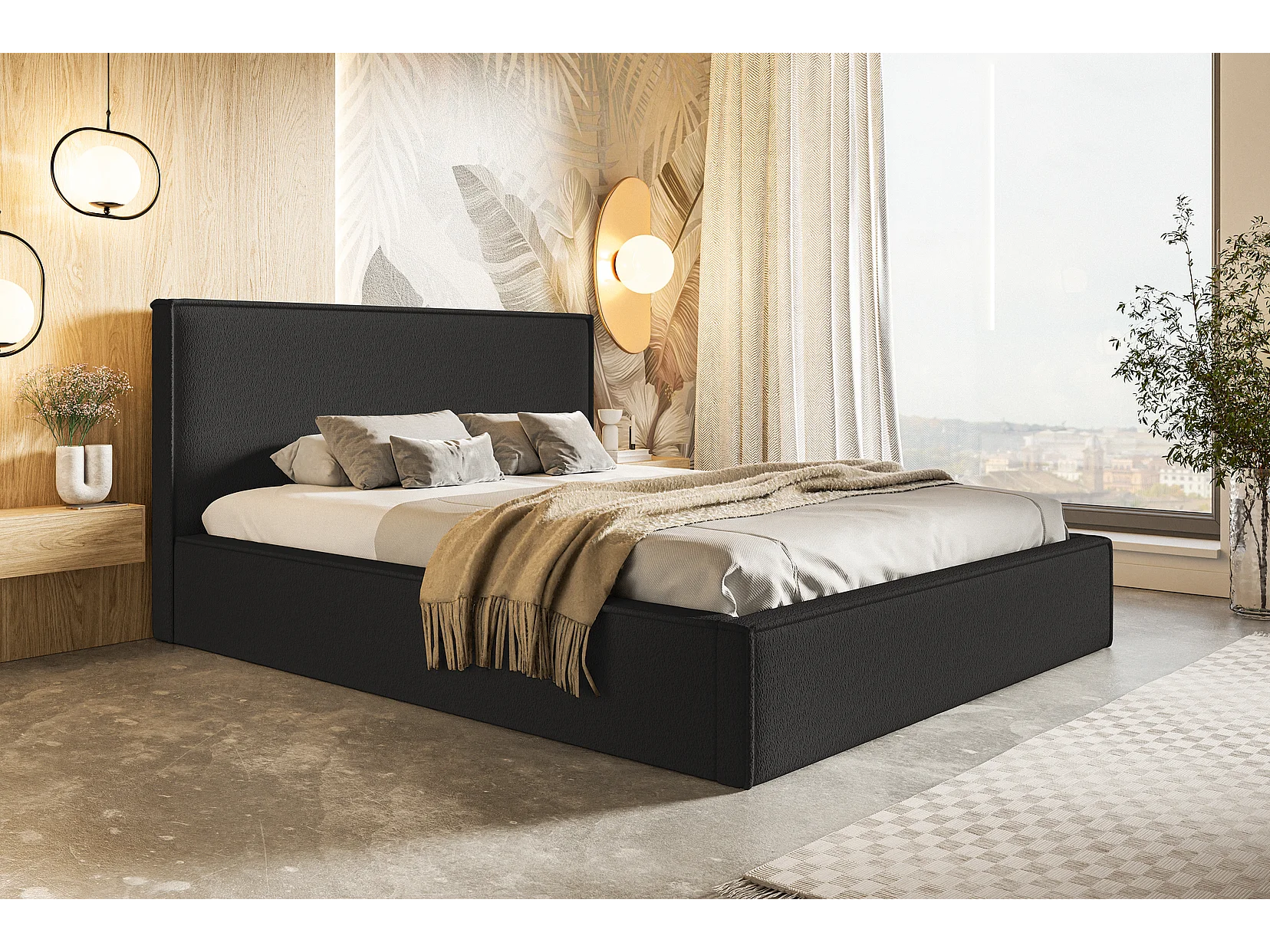 Lit rembourré 180x200 Kyoto avec rangement - sommier métallique, tissu bouclé Noir (Anthology 19)