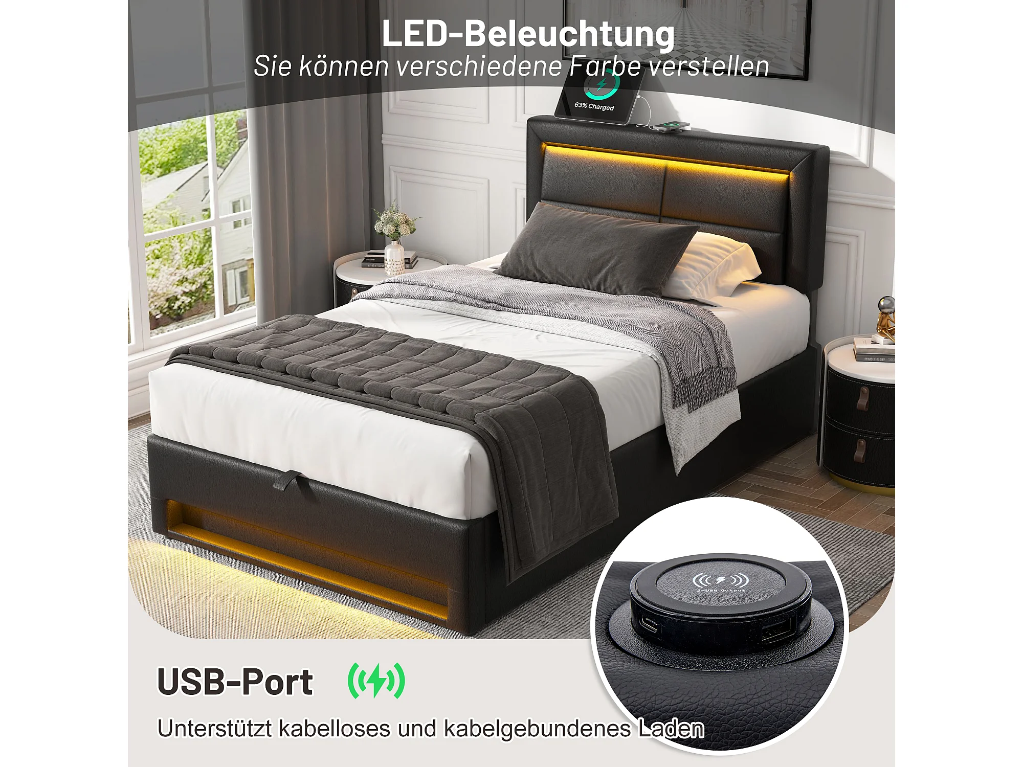 Lit rembourré 90 x 200 cm avec USB, LED et espace de rangement, PU lychee, noir (90x200 cm)