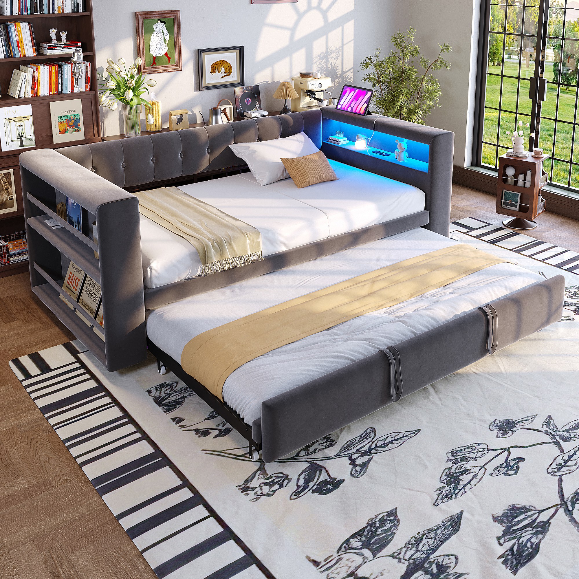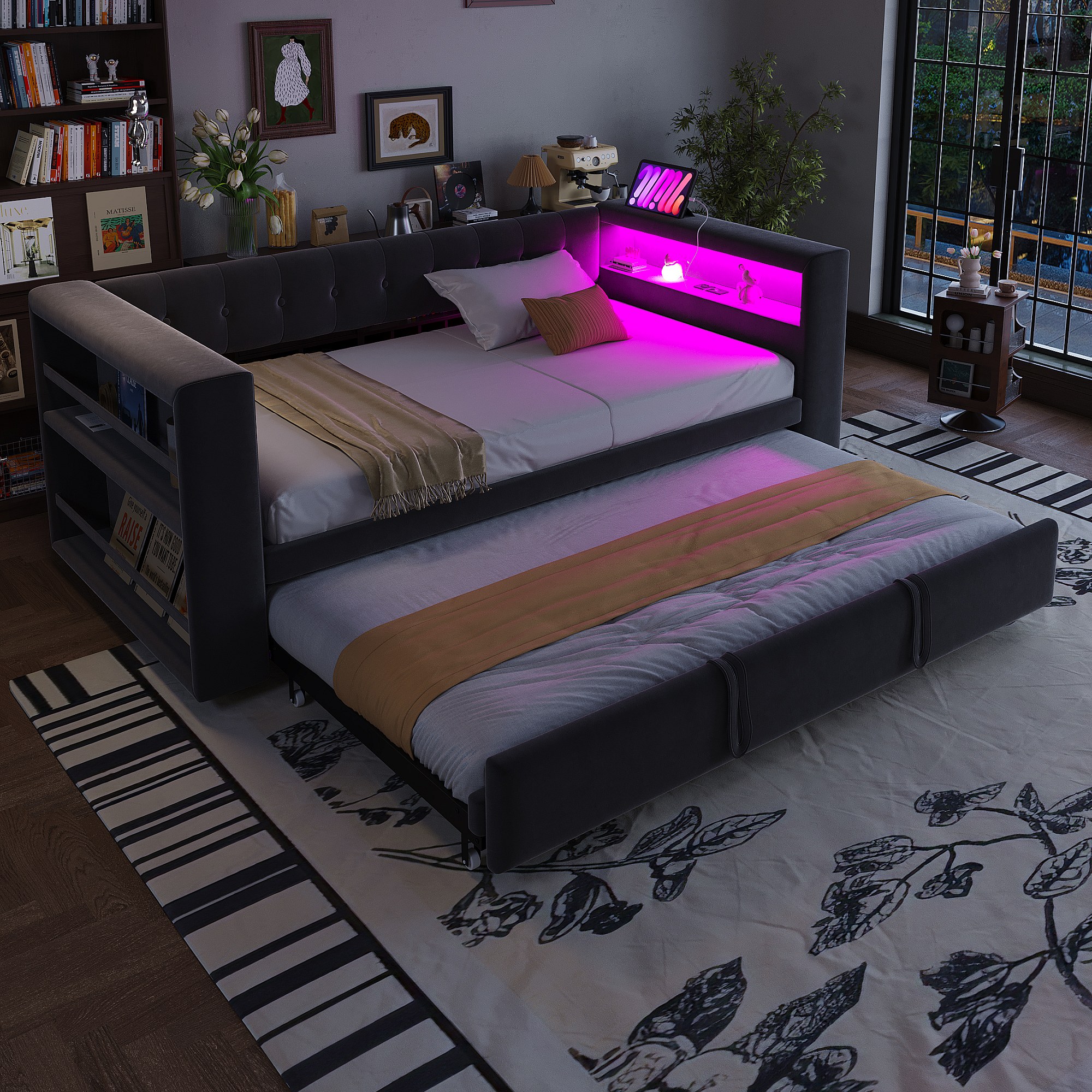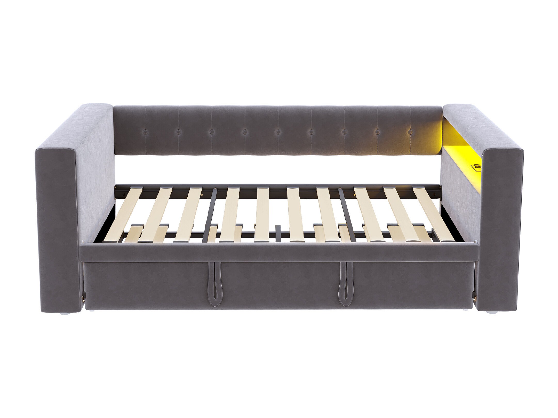 Lit rembourré 90x190 cm - avec éclairage LED - avec lit gigogne - avec prise de courant - gris foncé