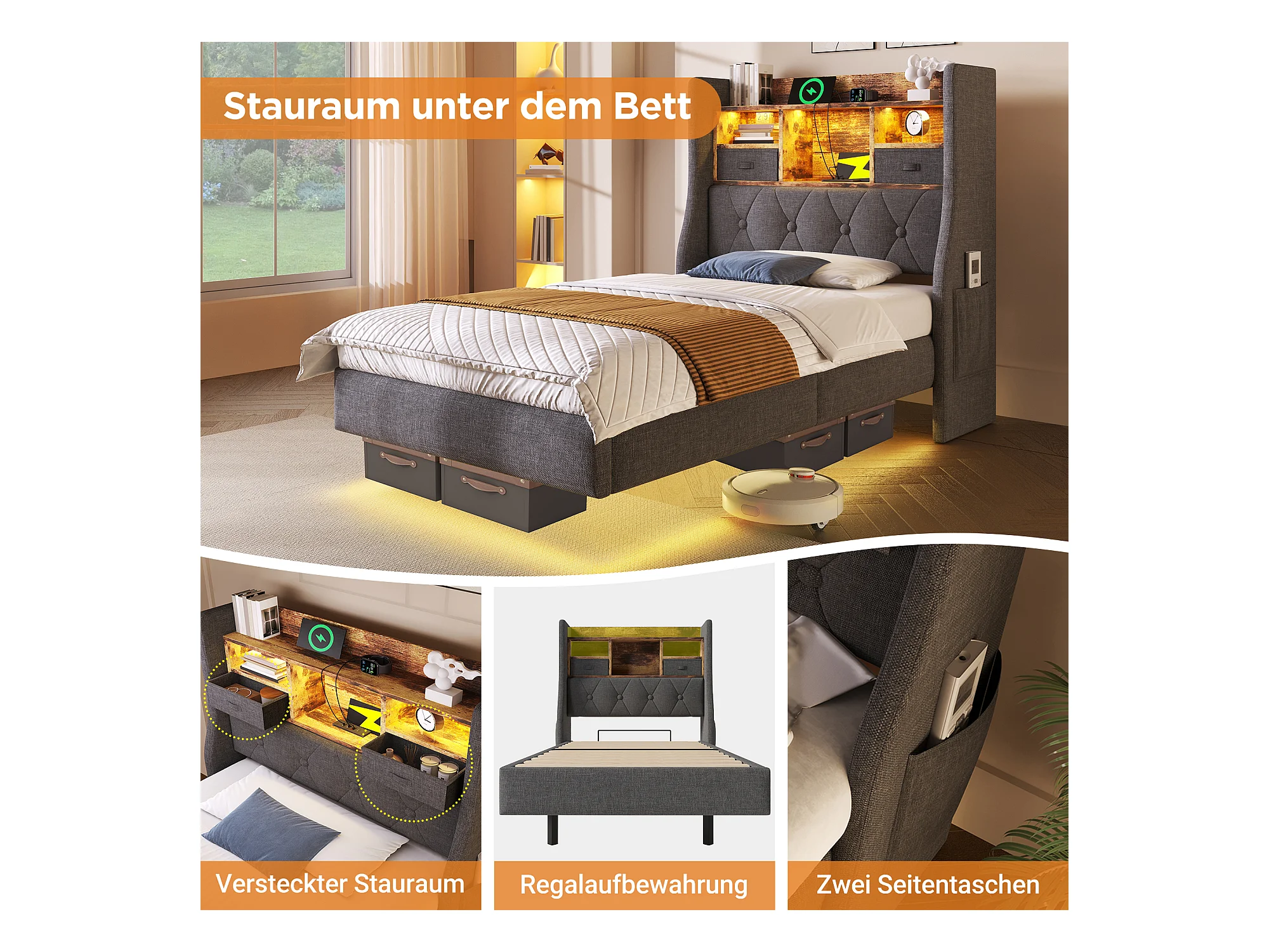 Lit 140x200 cm, Lit de rangement avec ports USB-C et sommier complet, Sans tête de lit, Coton, Gris (141x202x29 cm)
