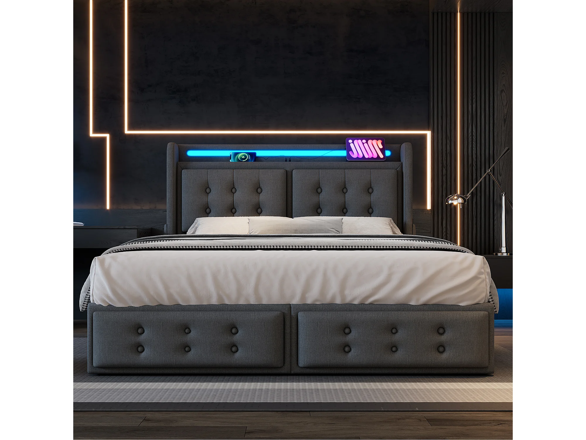 Lit rembourré double 140×200 avec tête LED et USB C, 4 tiroirs, sommier bois métal, coton gris, 300 kg (avec matelas)