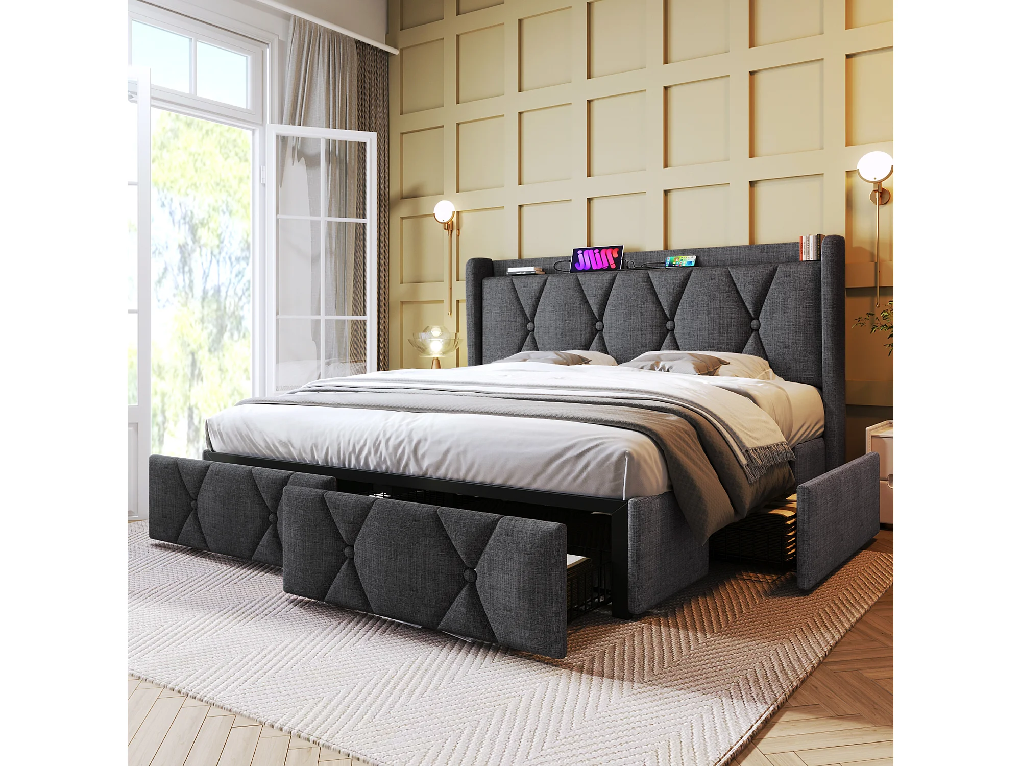 Lit rembourré double 140×200 avec tête USB et 4 tiroirs, rangement, sommier bois, gris, fonction de charge (avec matelas)