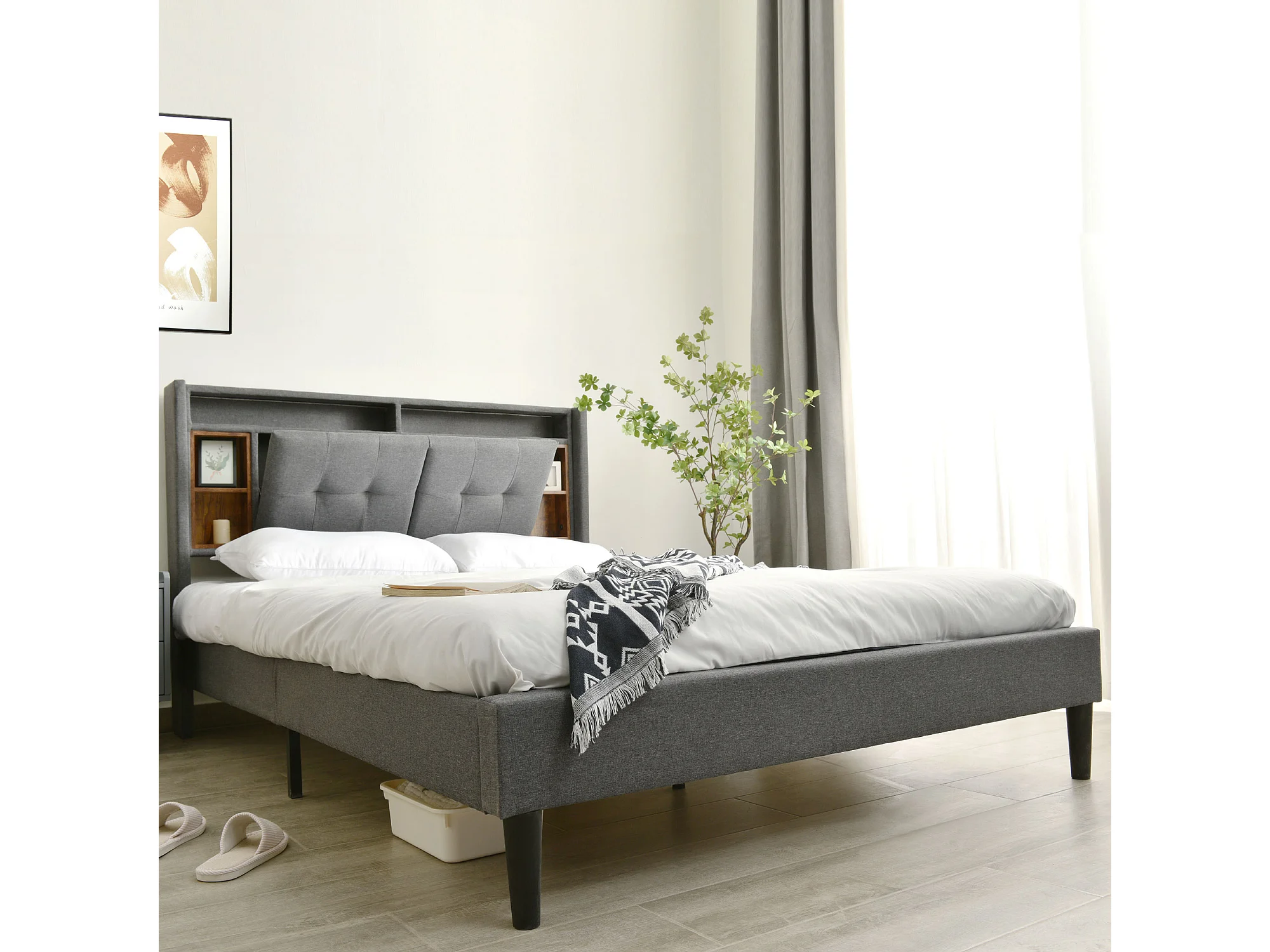 Lit rembourré double 160x200 cm, coffre et tête avec LED et USB, cadre avec sommier en bois, gris, avec matelas