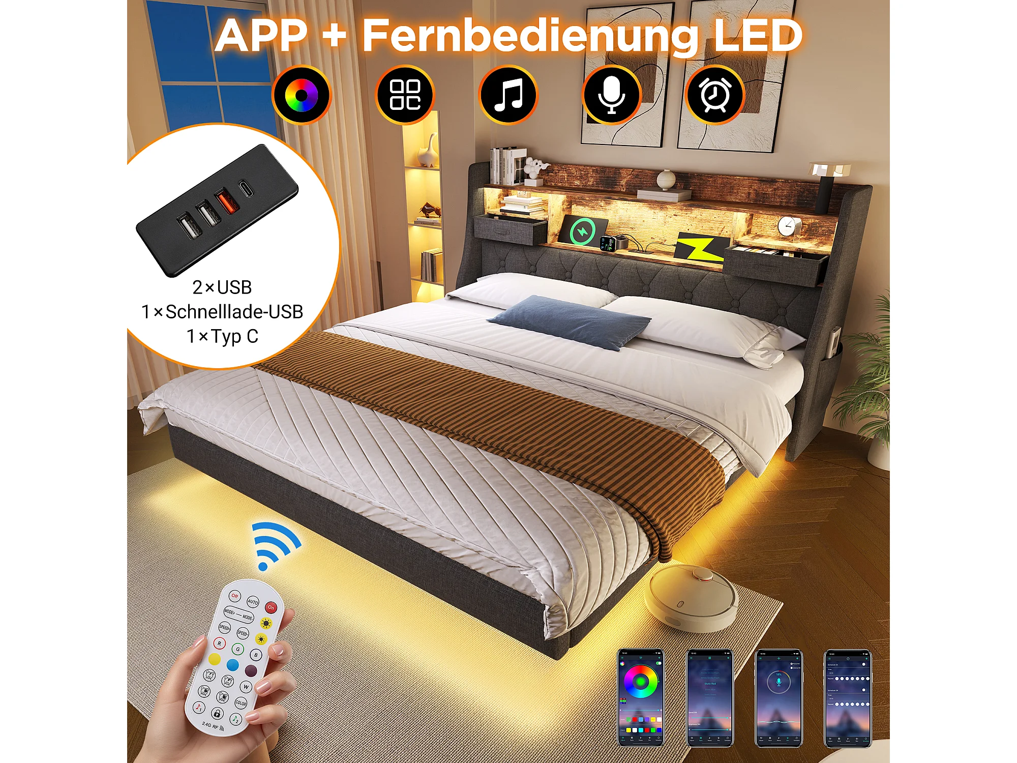 Lit rembourré double - 180 x 200 cm - avec Leds + station de charge + tête de lit de rangement - lin - gris