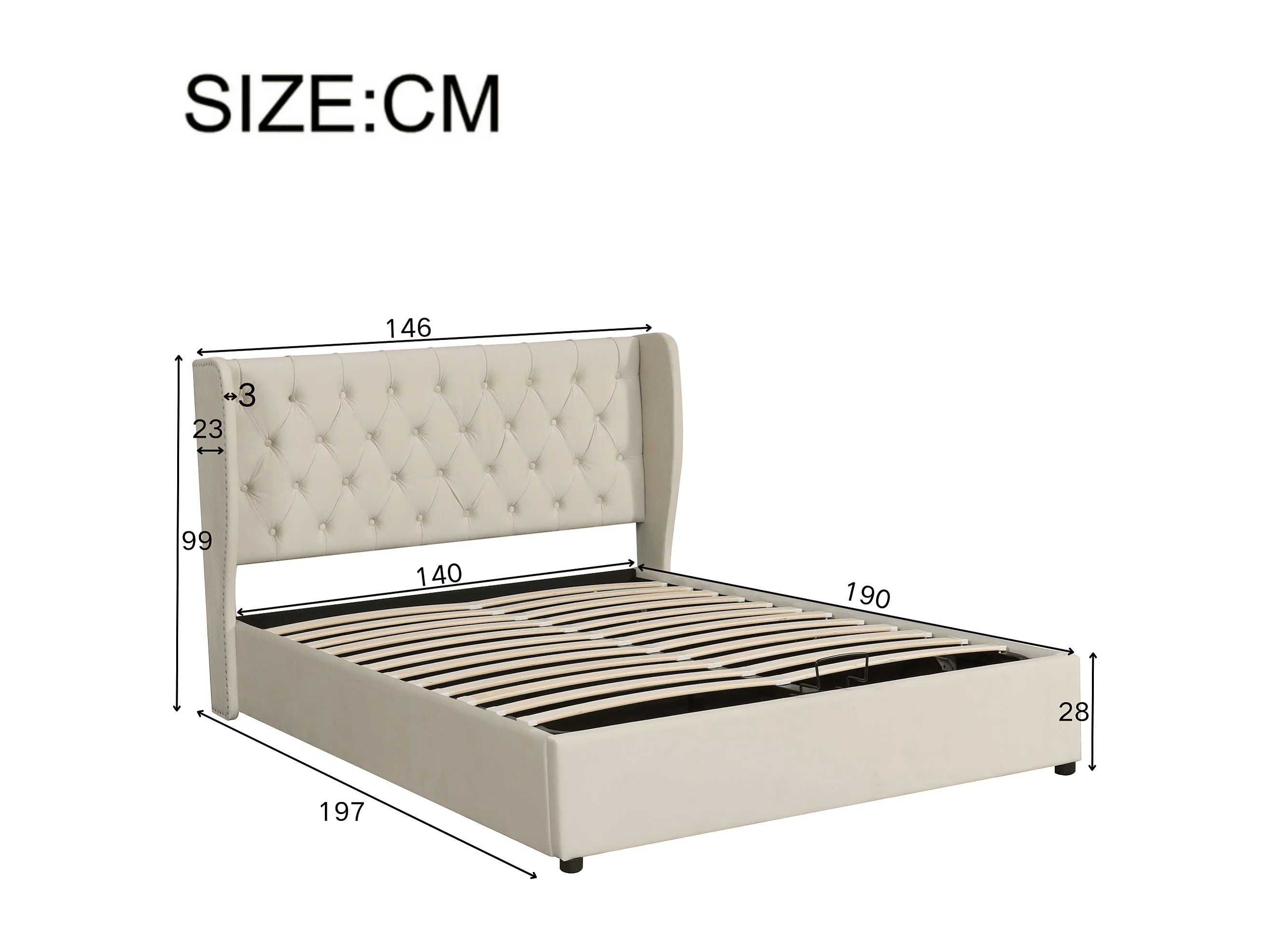 Lit rembourré en forme d'oreille,velours,Lit double,140*190,Lit fonctionnel hydraulique avec sommier à lattes et espace de rangement,beige