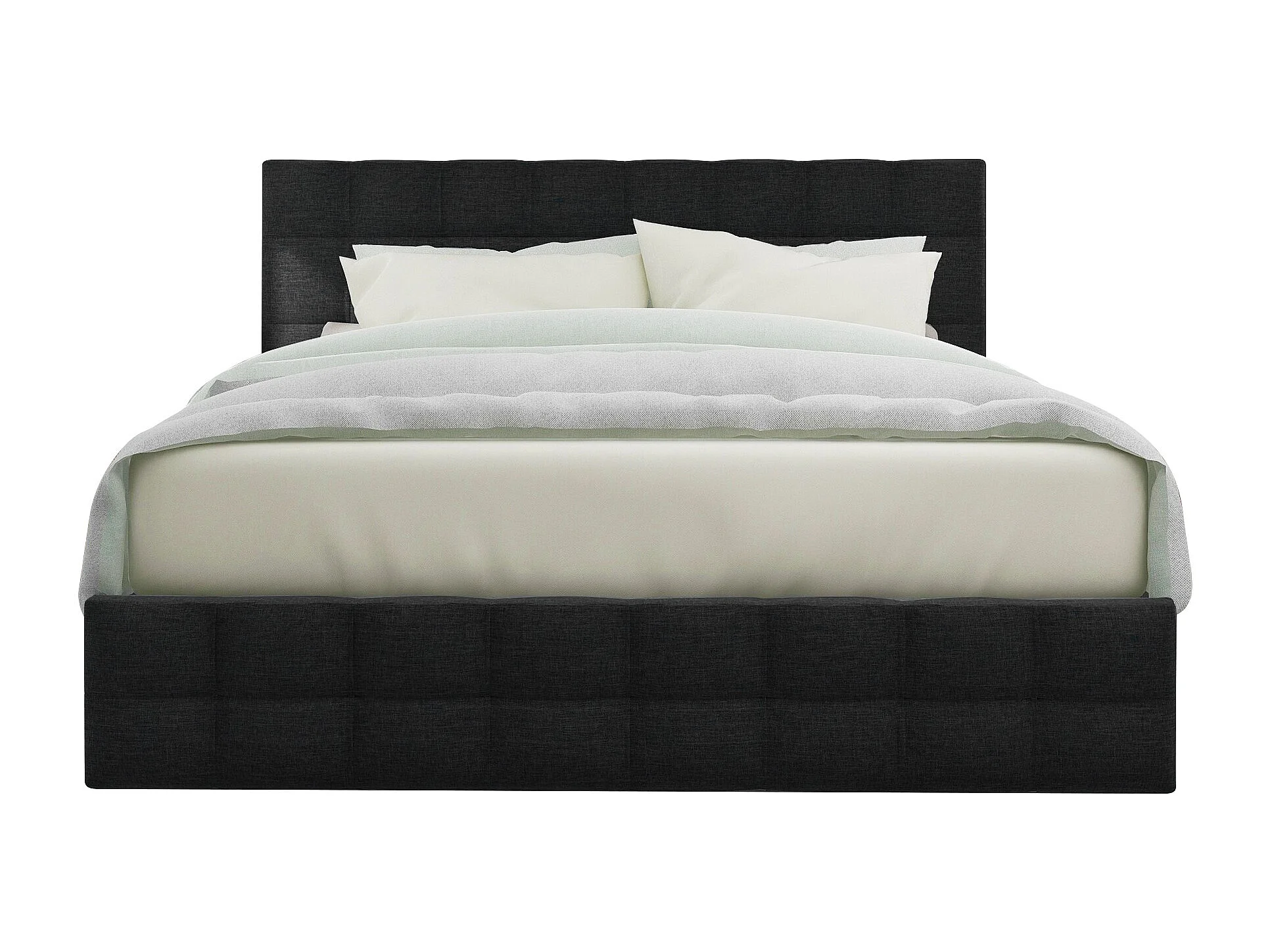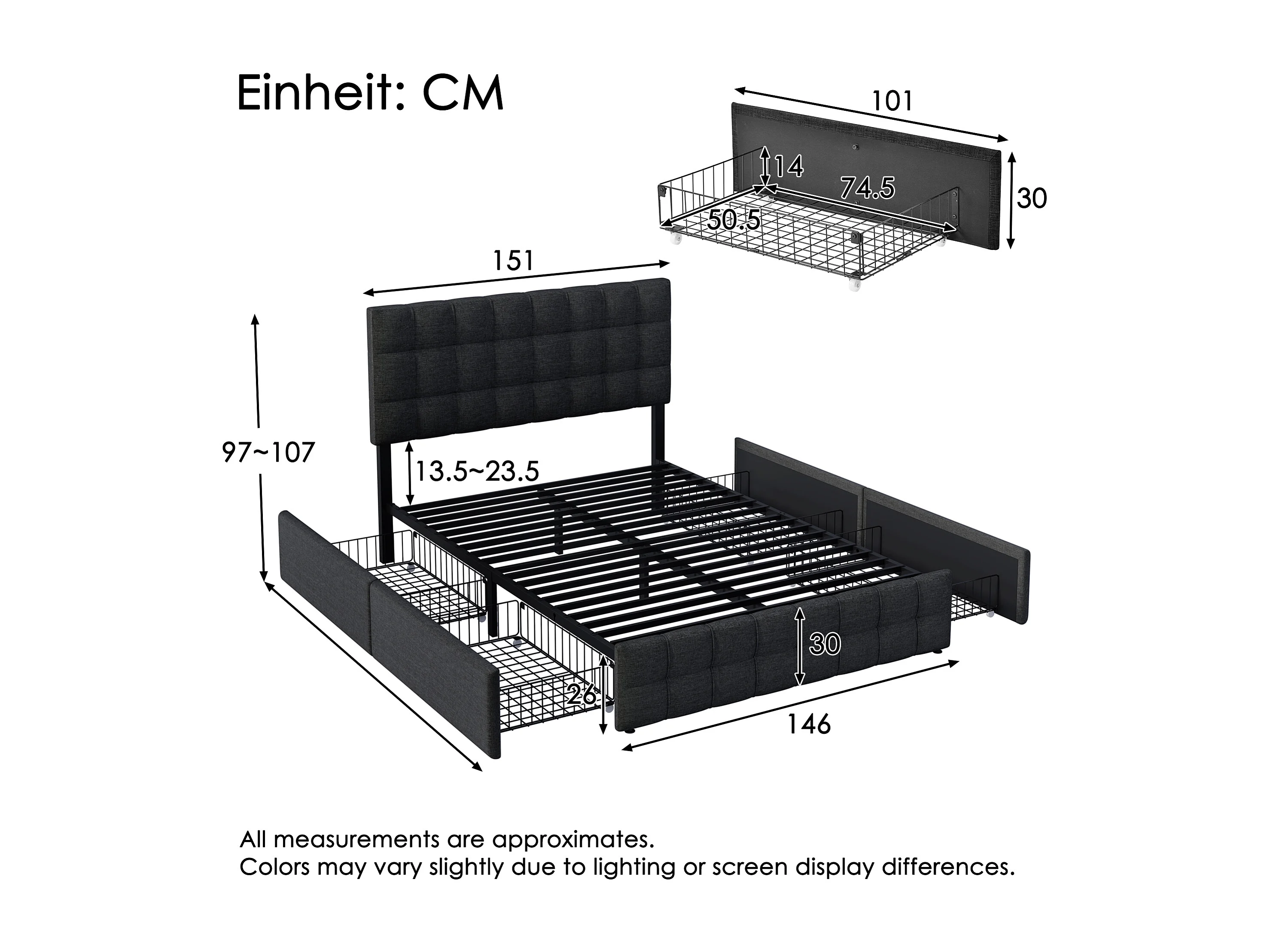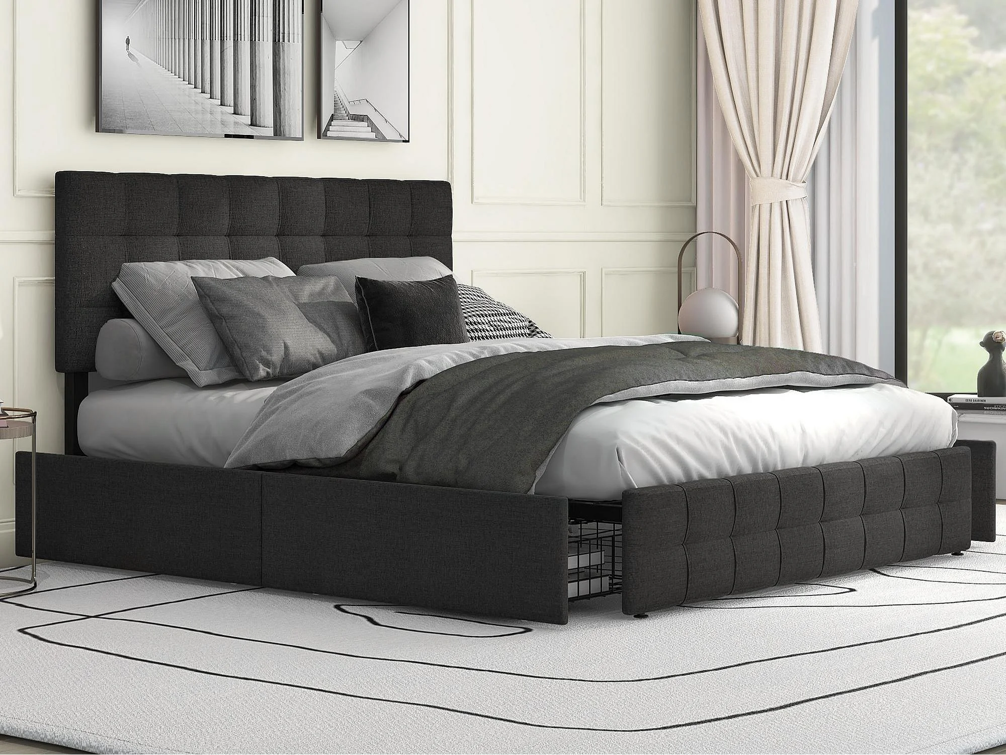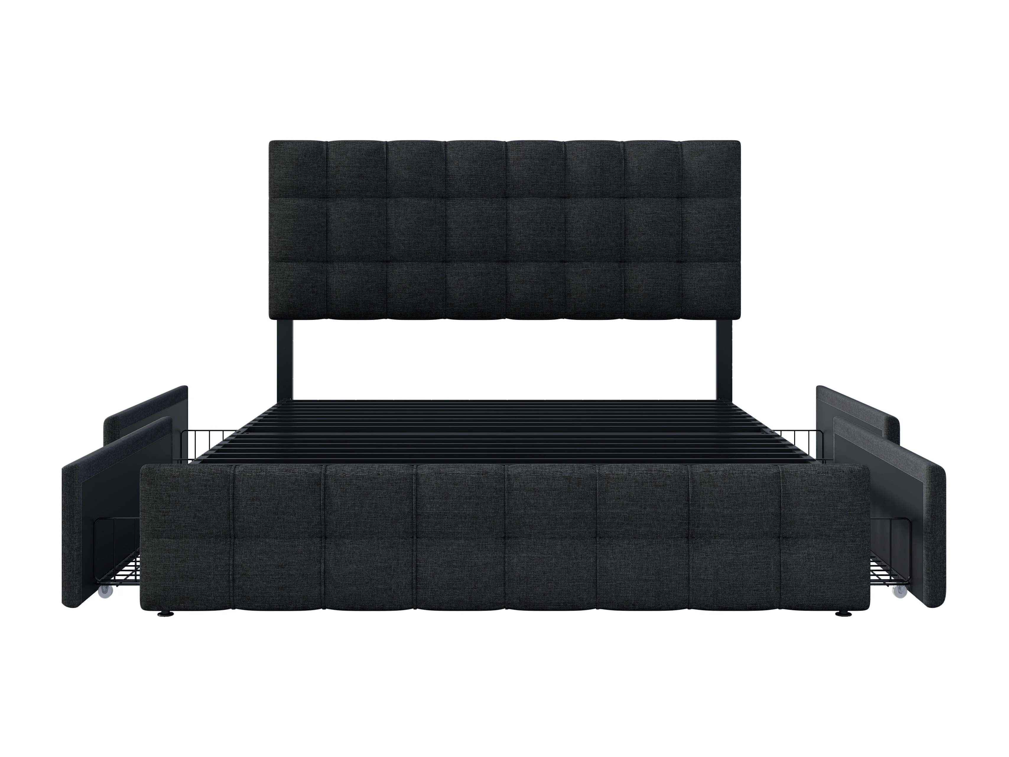 Lit capitonné en lin avec 4 tiroirs - tête de lit réglable + sommier métallique - 140x200cm - Noir