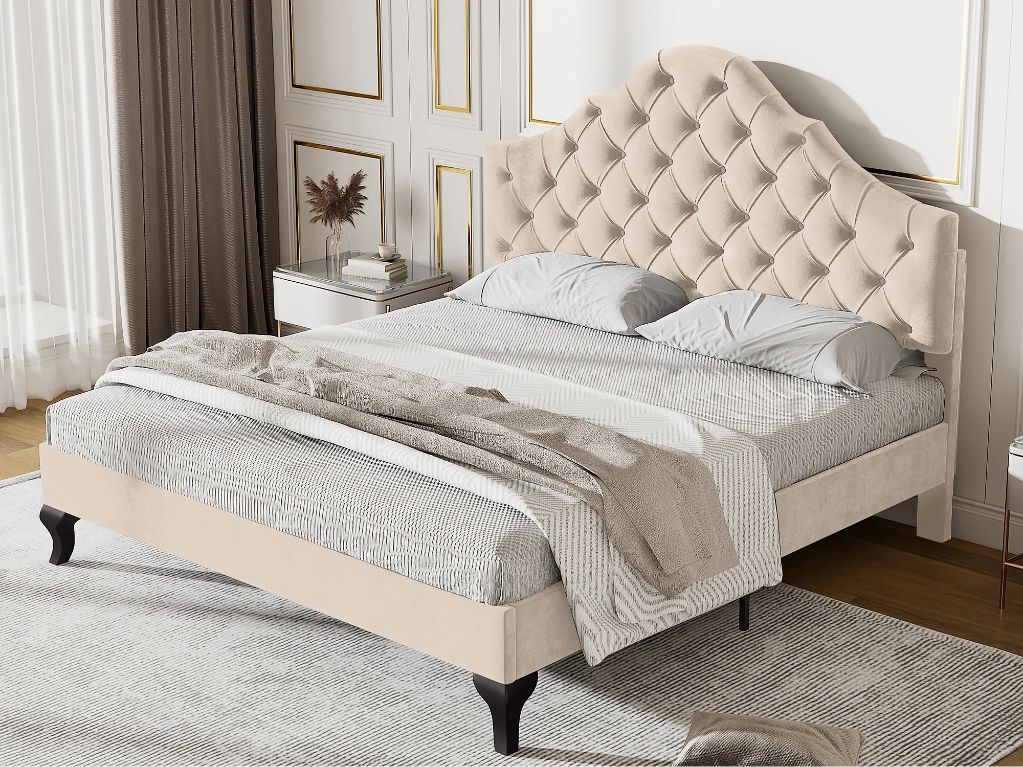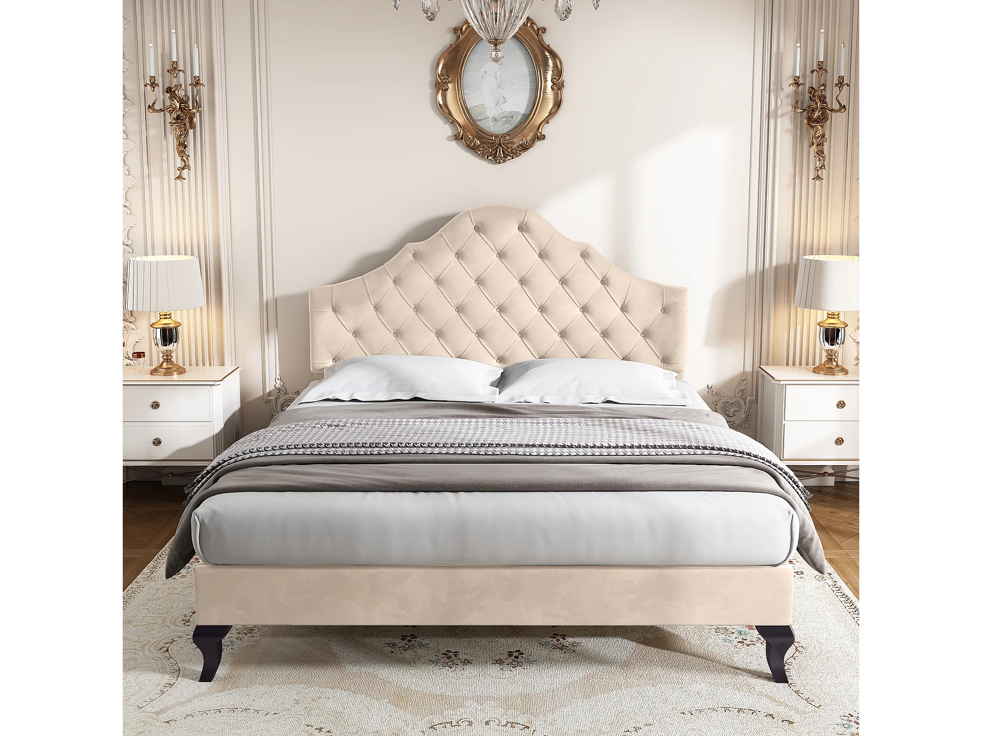 Lit rembourré 140x190cm en velours avec tête de lit réglable + sommier à lattes - Beige