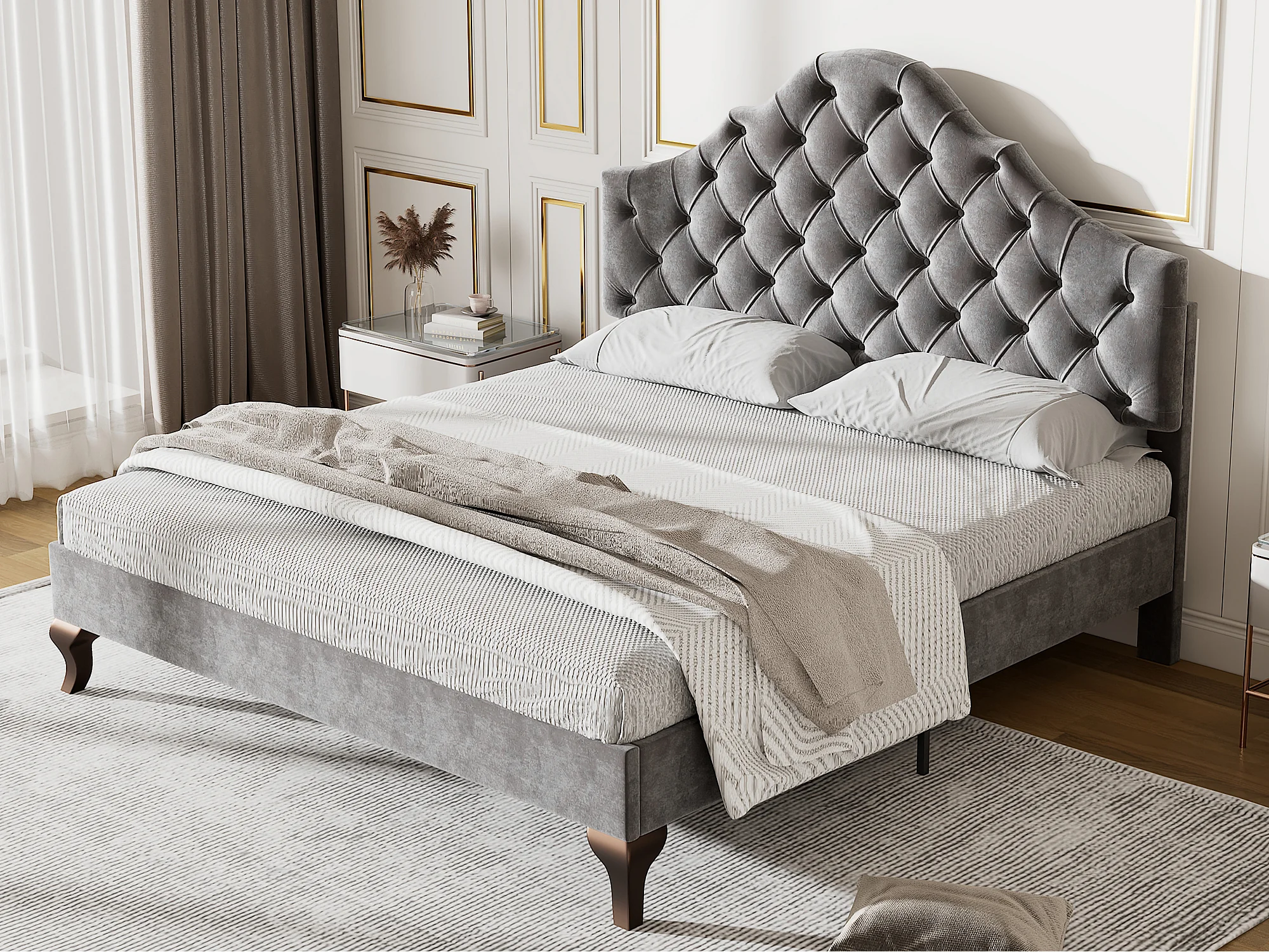 Lit rembourré 140x200cm en velours avec tête de lit réglable + sommier à lattes - Gris