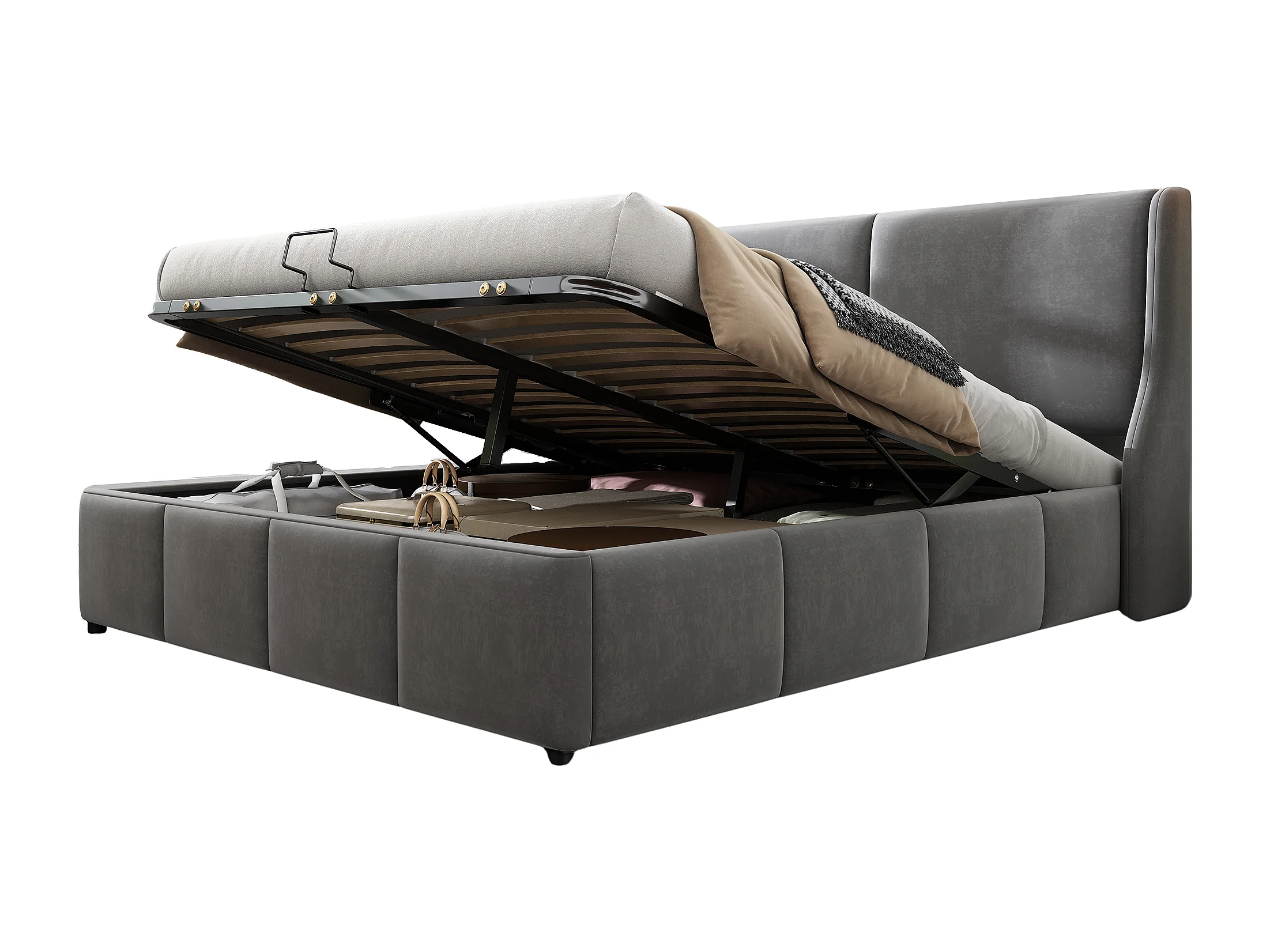 Lit rembourré gris 180x200 cm avec tête de lit en coussin et rangement spacieux, style moderne et élégant
