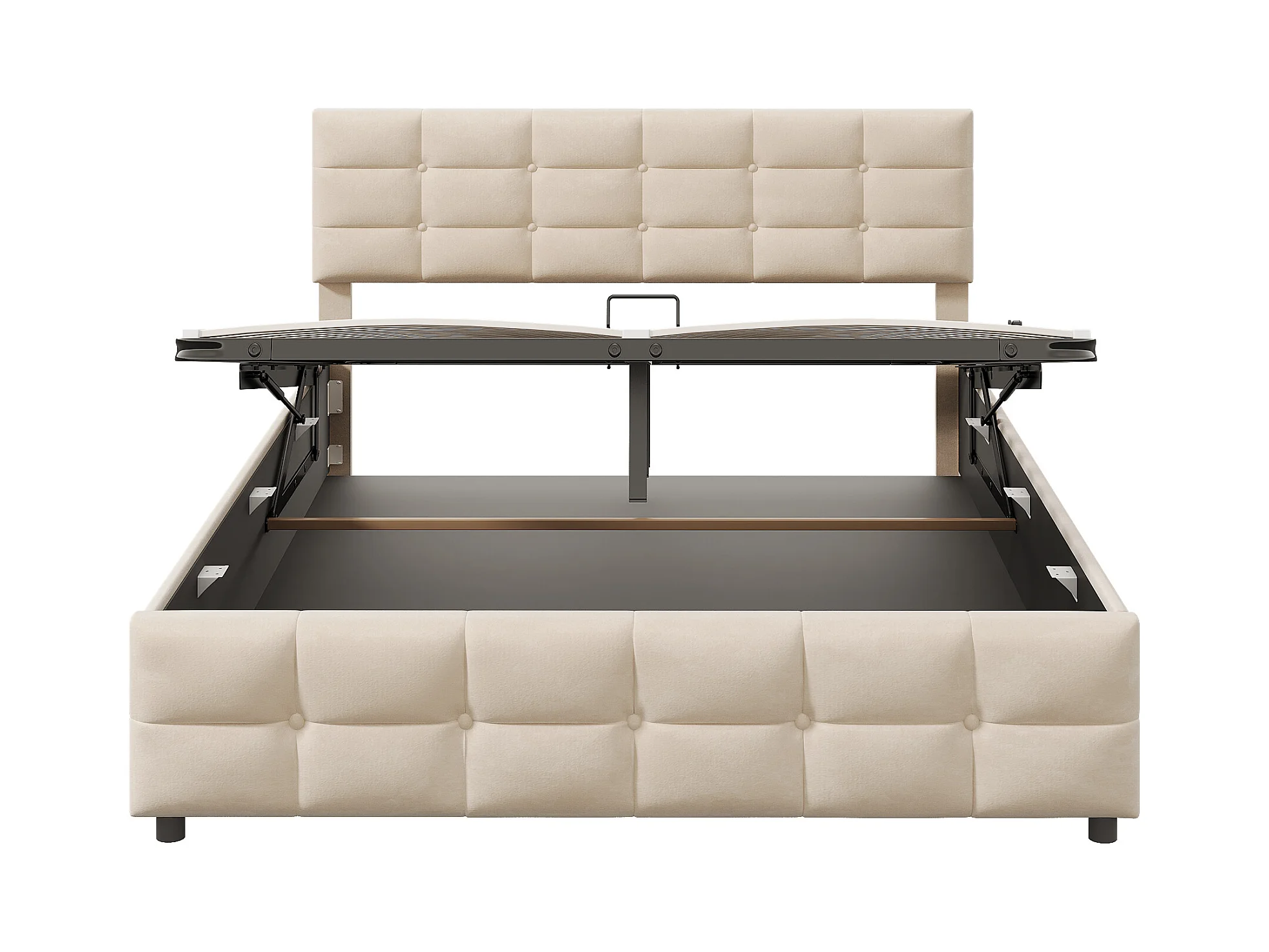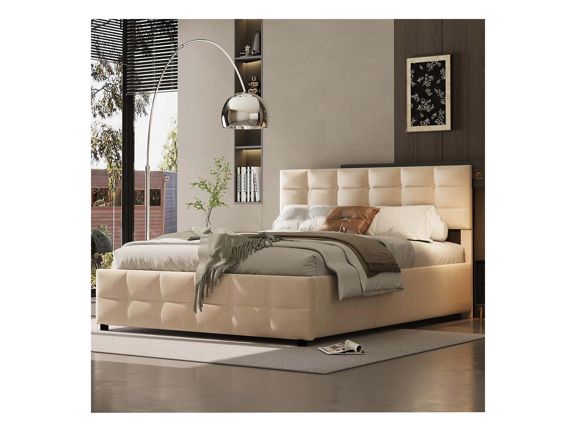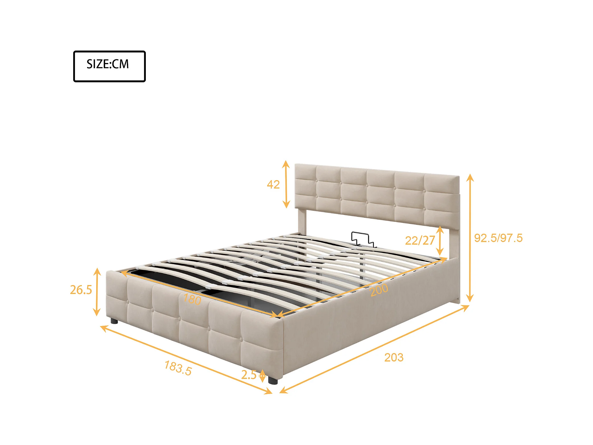 Lit rembourré hydraulique 180x200 cm avec Rangement sous, avec sommier à Lattes, Velours, beige