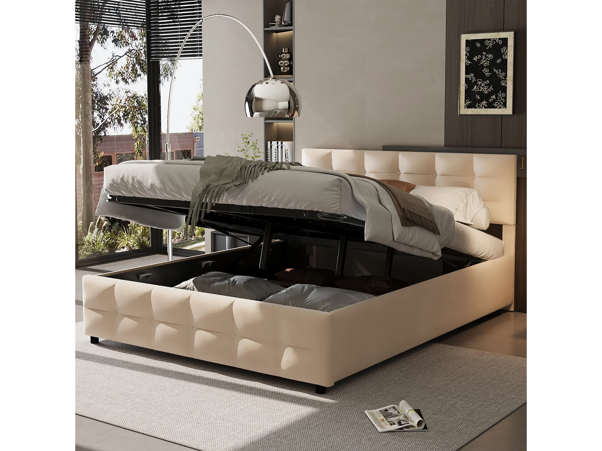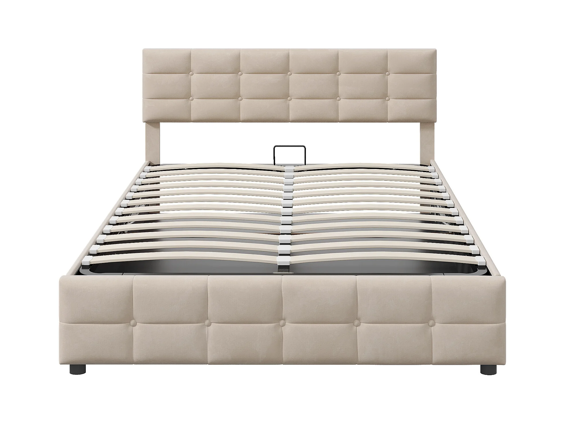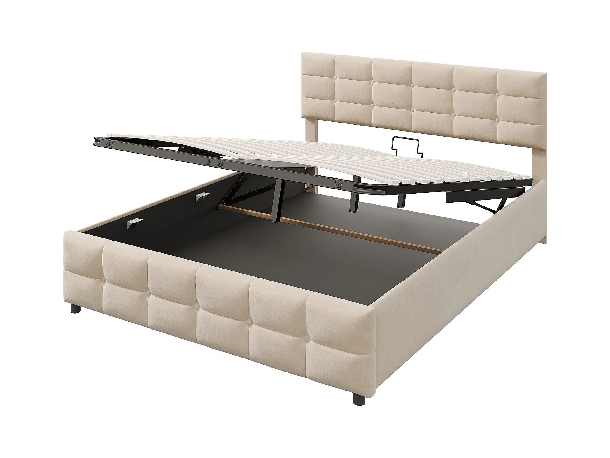 Lit rembourré hydraulique 180x200 cm avec Rangement sous, avec sommier à Lattes, Velours, beige