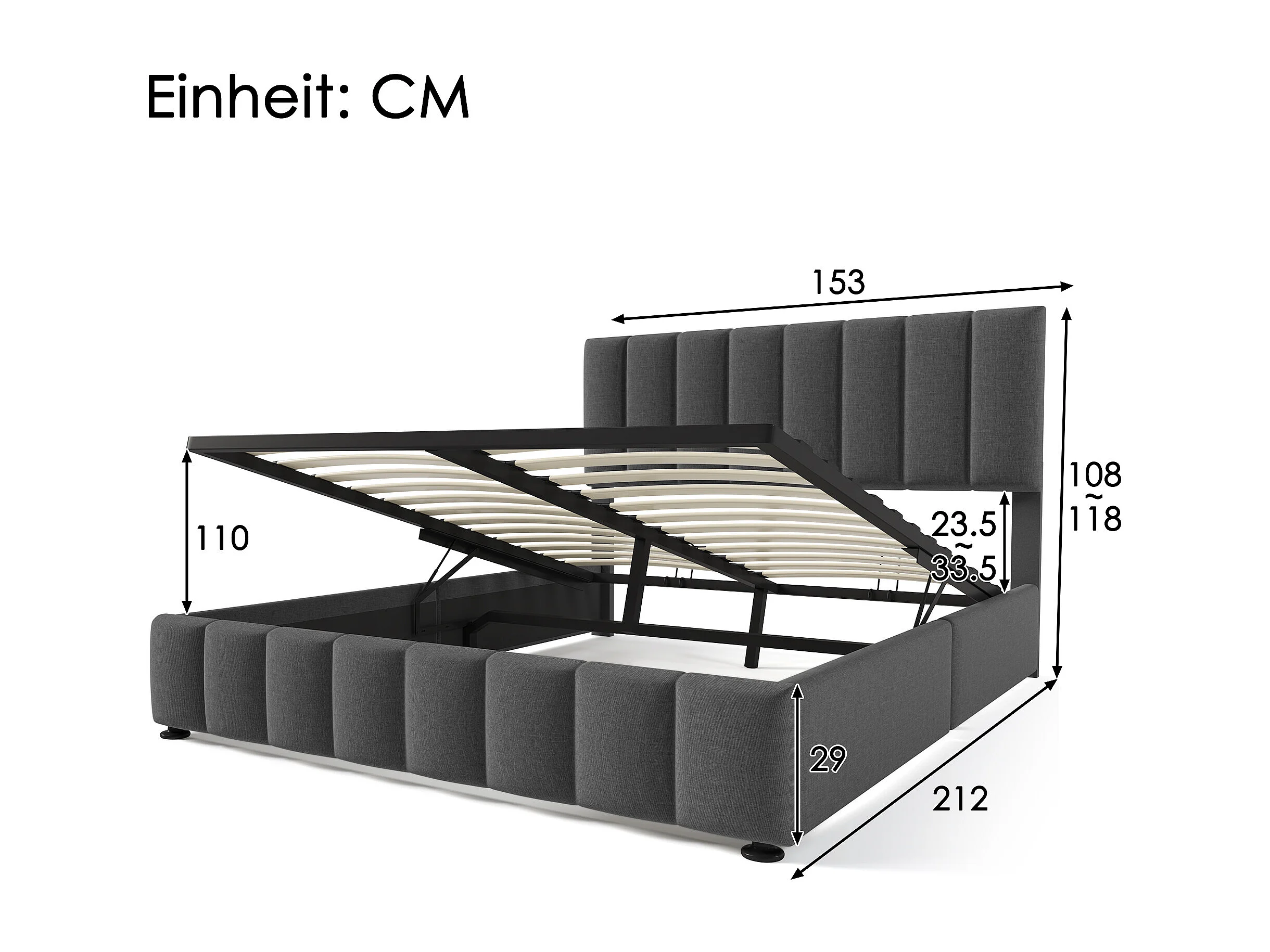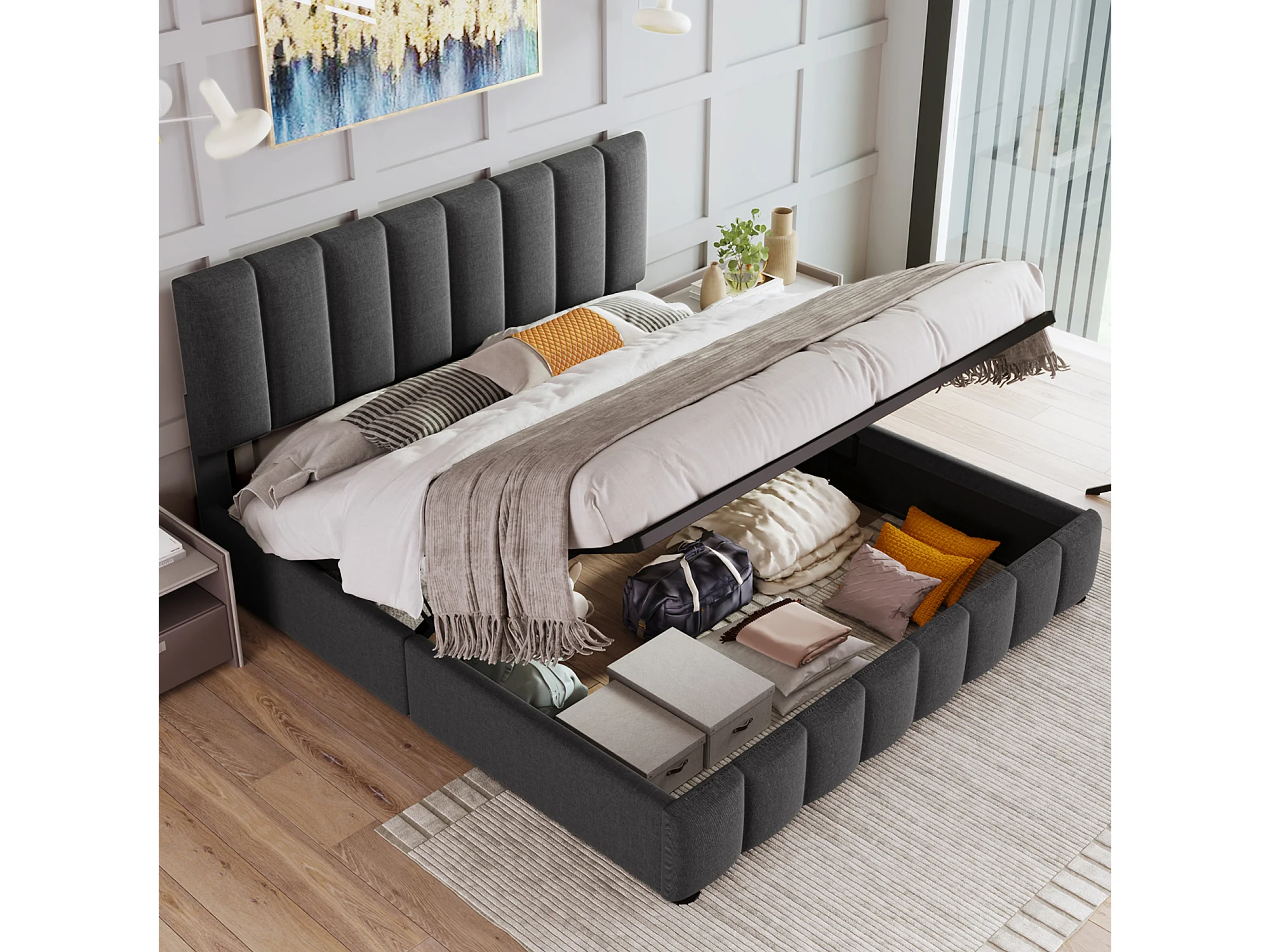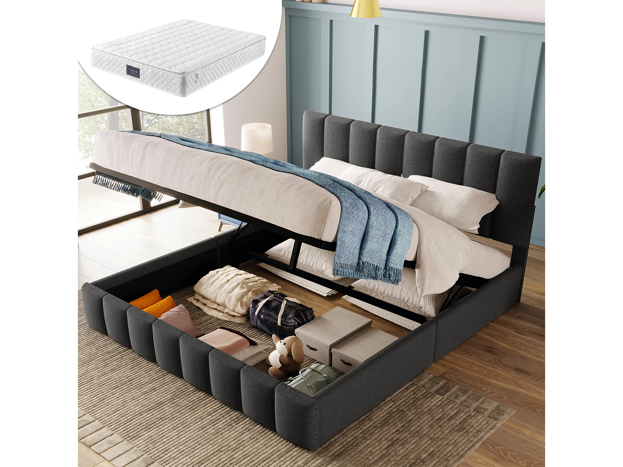 Lit rembourré hydraulique double 140x200 cm, tête réglable, cadre métal avec sommier, lin gris, rangement, avec matelas