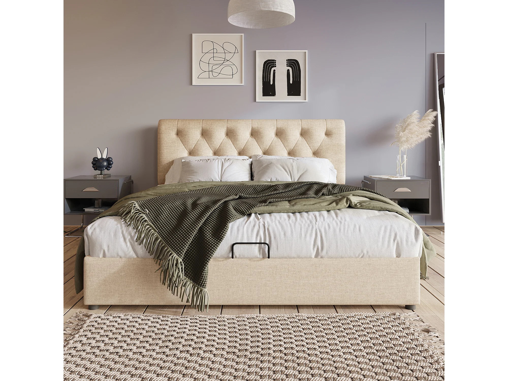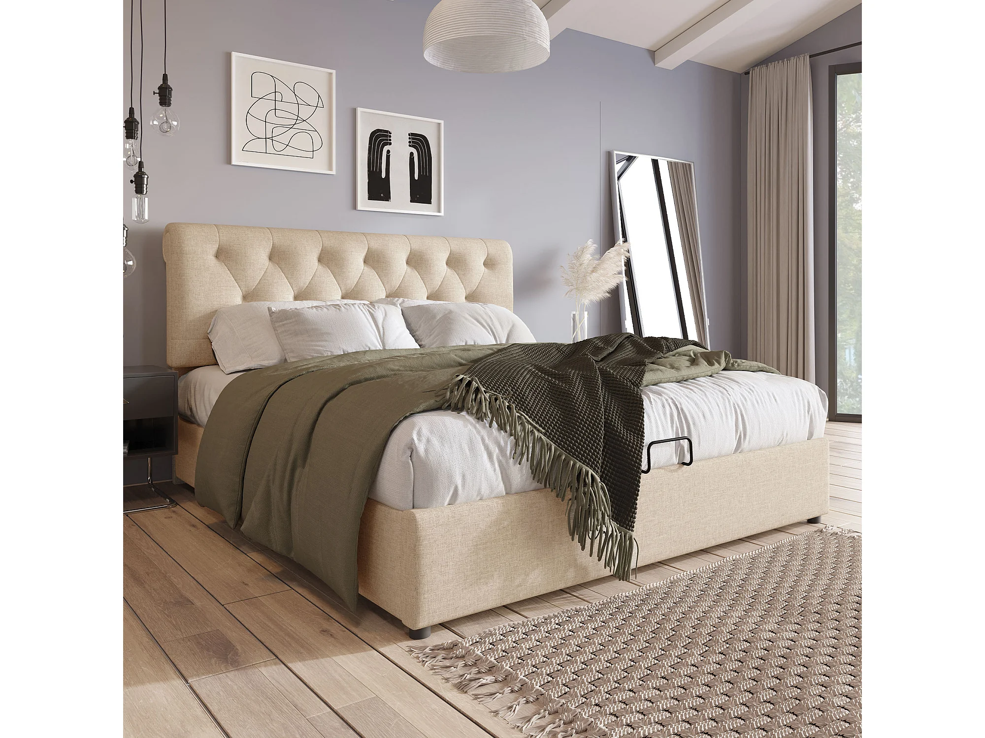 Lit rembourré hydraulique double 160x200 cm, tête réglable, cadre métal avec sommier, lin naturel, rangement, avec matelas