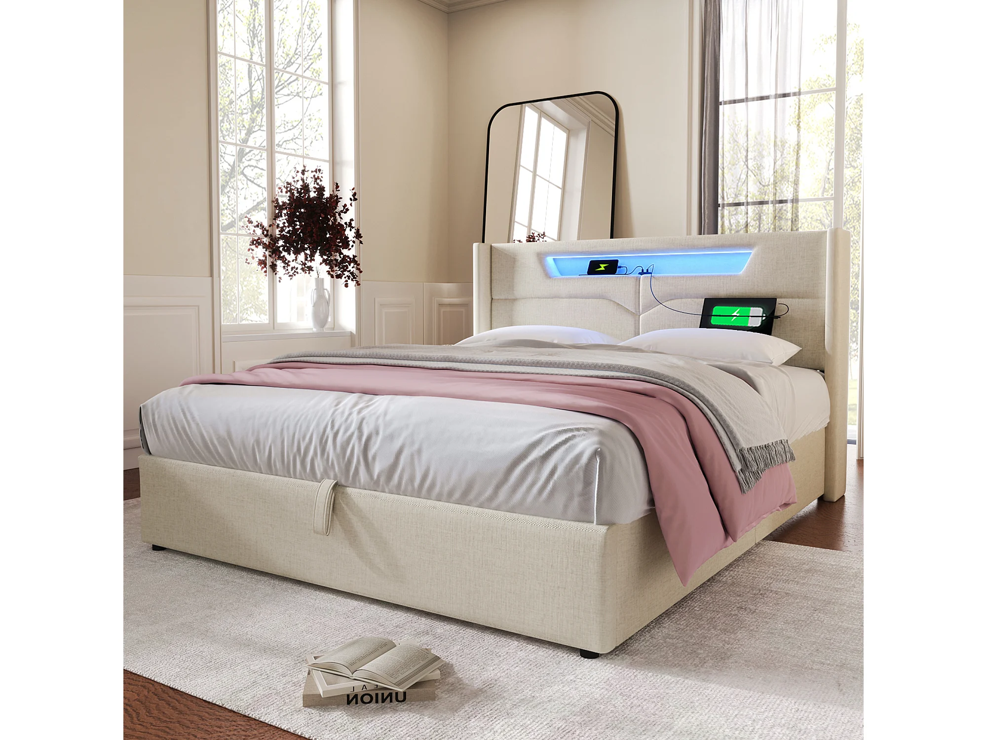 Lit rembourré LED 140x200 cm, lit double avec port USB-C, tête de lit lumineuse et espace de rangement, tissu lin avec matelas