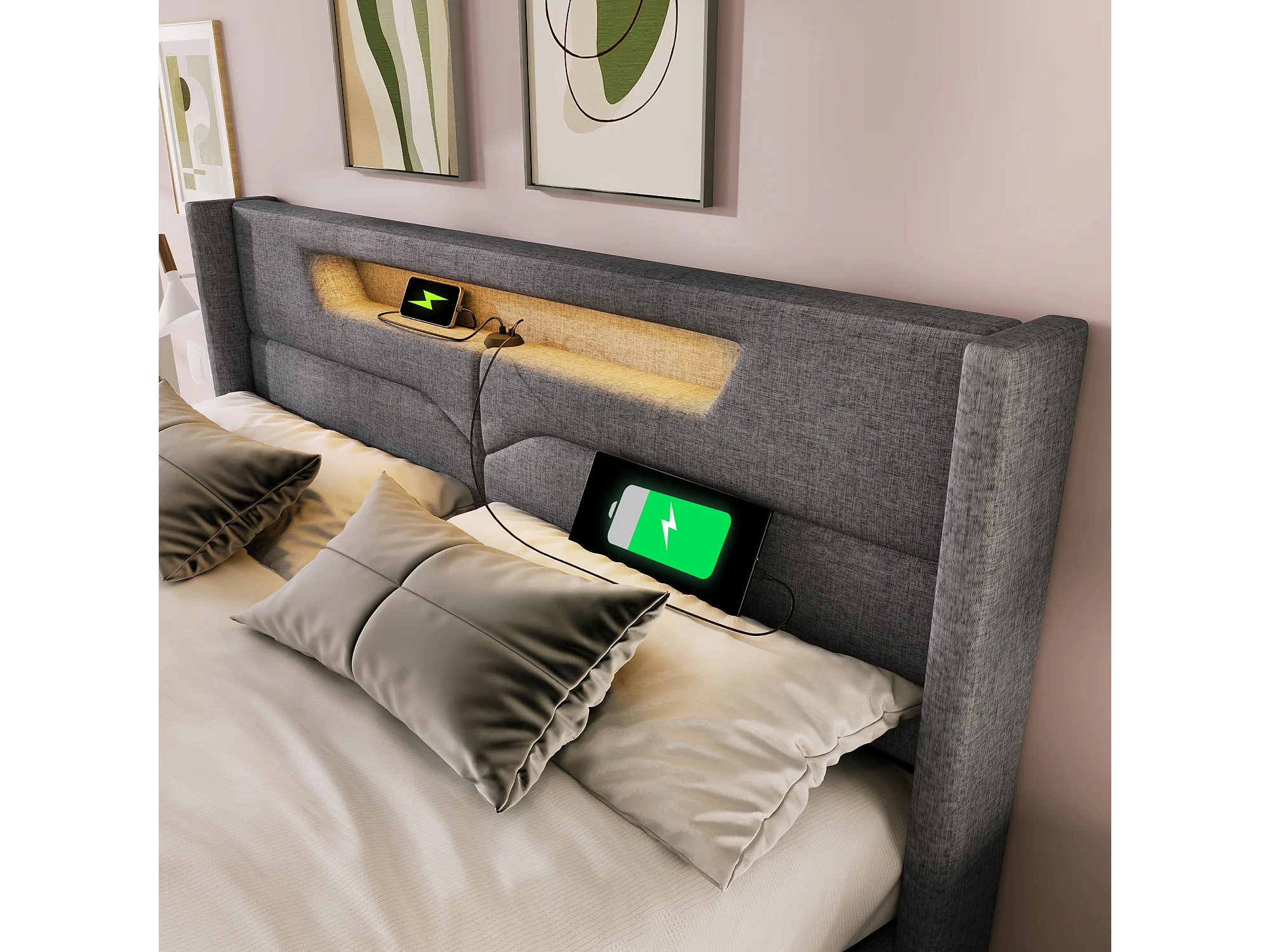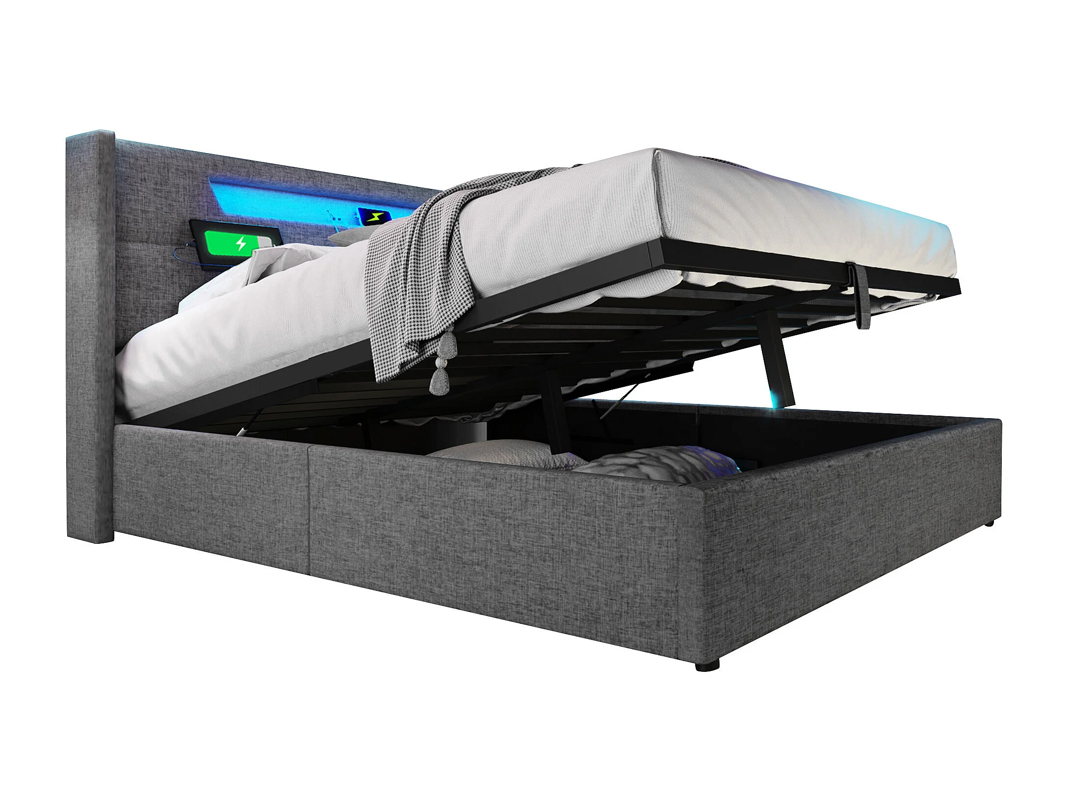 Lit rembourré LED 160x200 cm, lit double avec port USB-C, tête de lit éclairée, tissu lin et rangement intégré, matelas inclus