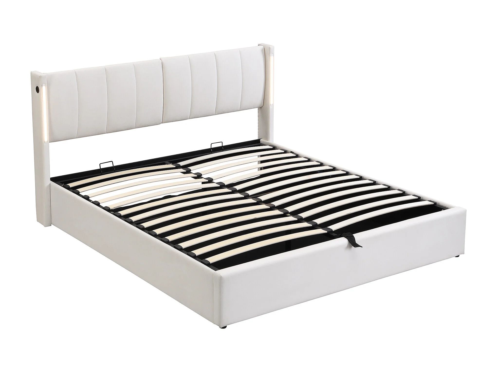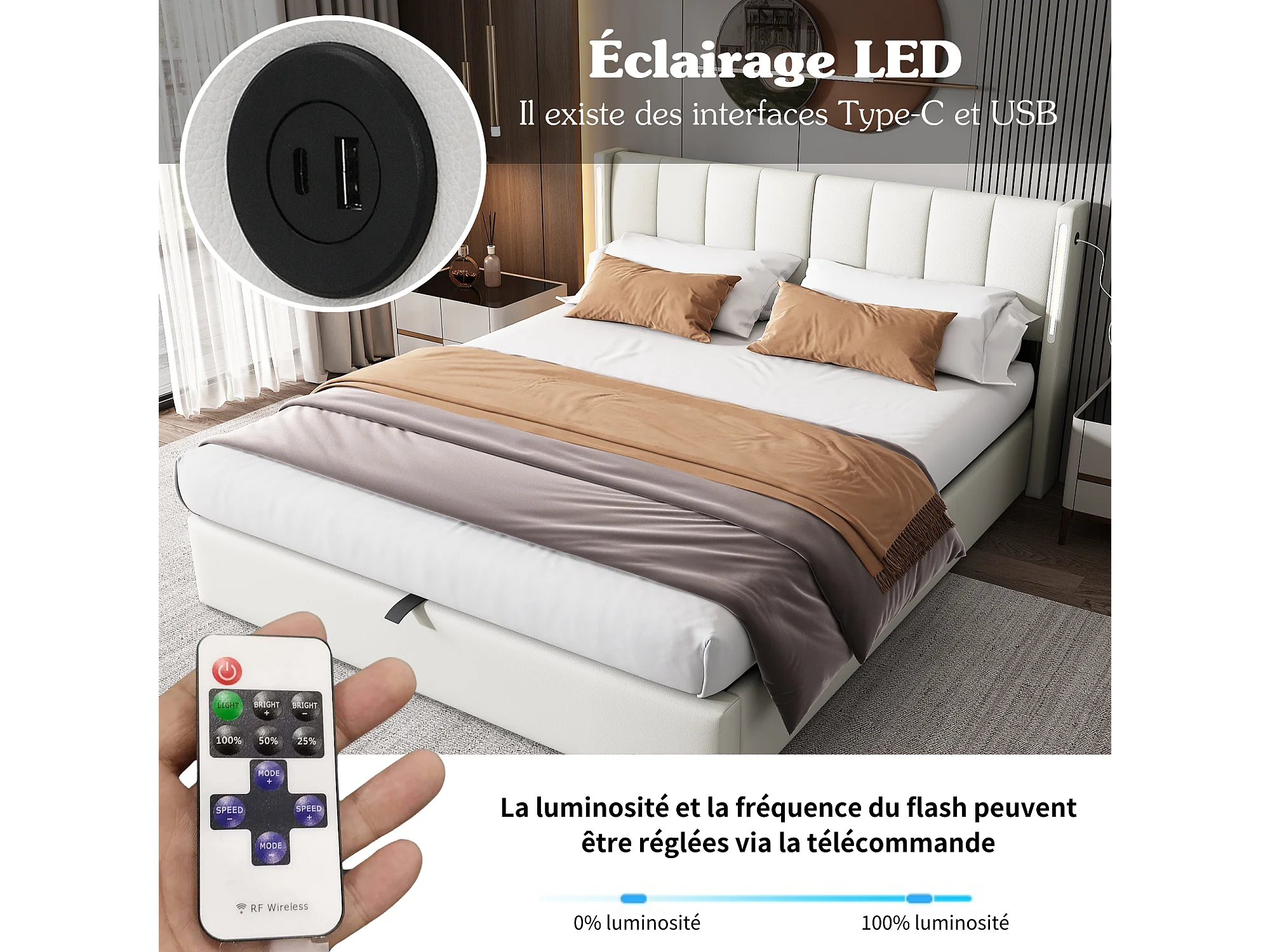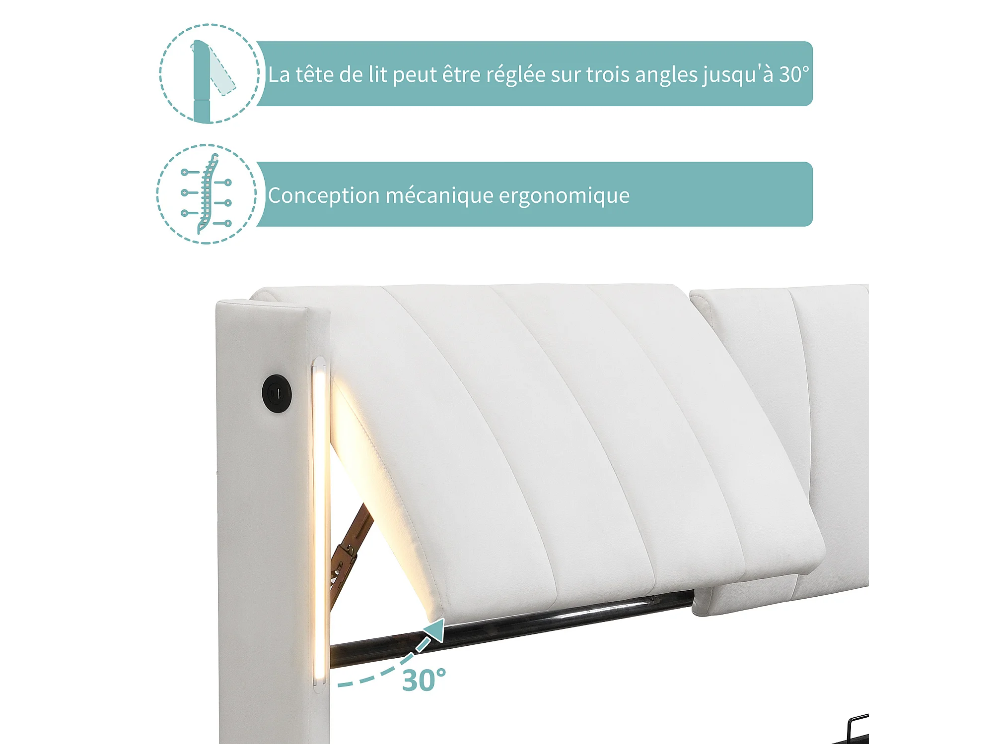 Lit rembourré LED avec port USB, éclairage LED, rangement, tête de lit réglable, PU blanc (140x190 cm)