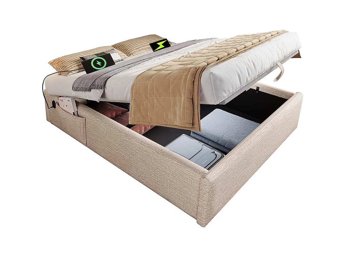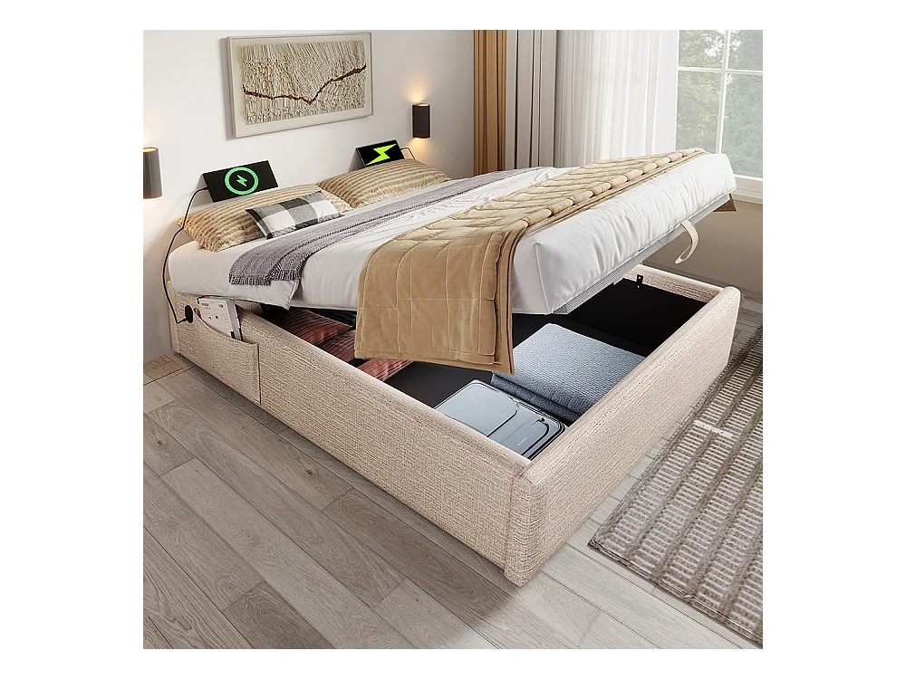 Lit rembourré Lit double 160×200 cm, Lit à barreaux Cadre de lit avec USB- C et sommier à lattes sur toute la surface, Sans tête de lit, Coton, Gris,Sans matelas