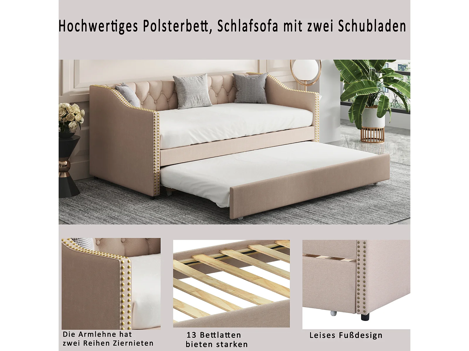 Lit gigogne 90x200cm - Canapé-lit rembourré, tissu en lin, avec sommier à lattes, sans matelas - Beige