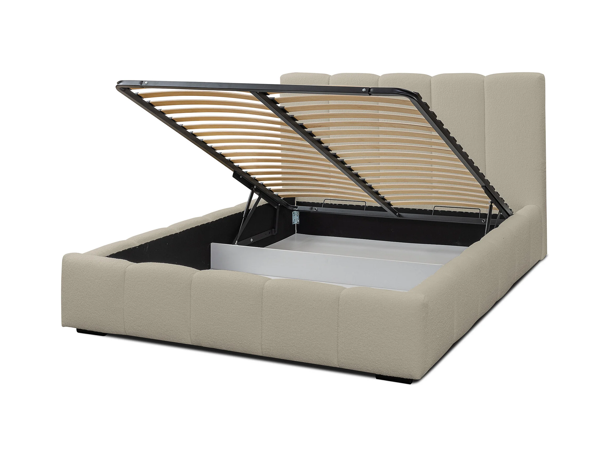 Lit rembourré Marco avec tête de lit, 140 x 200 cm, lit double avec coffre de rangement et sommier à lattes en métal, tissu bouclé, couleur : marron clair
