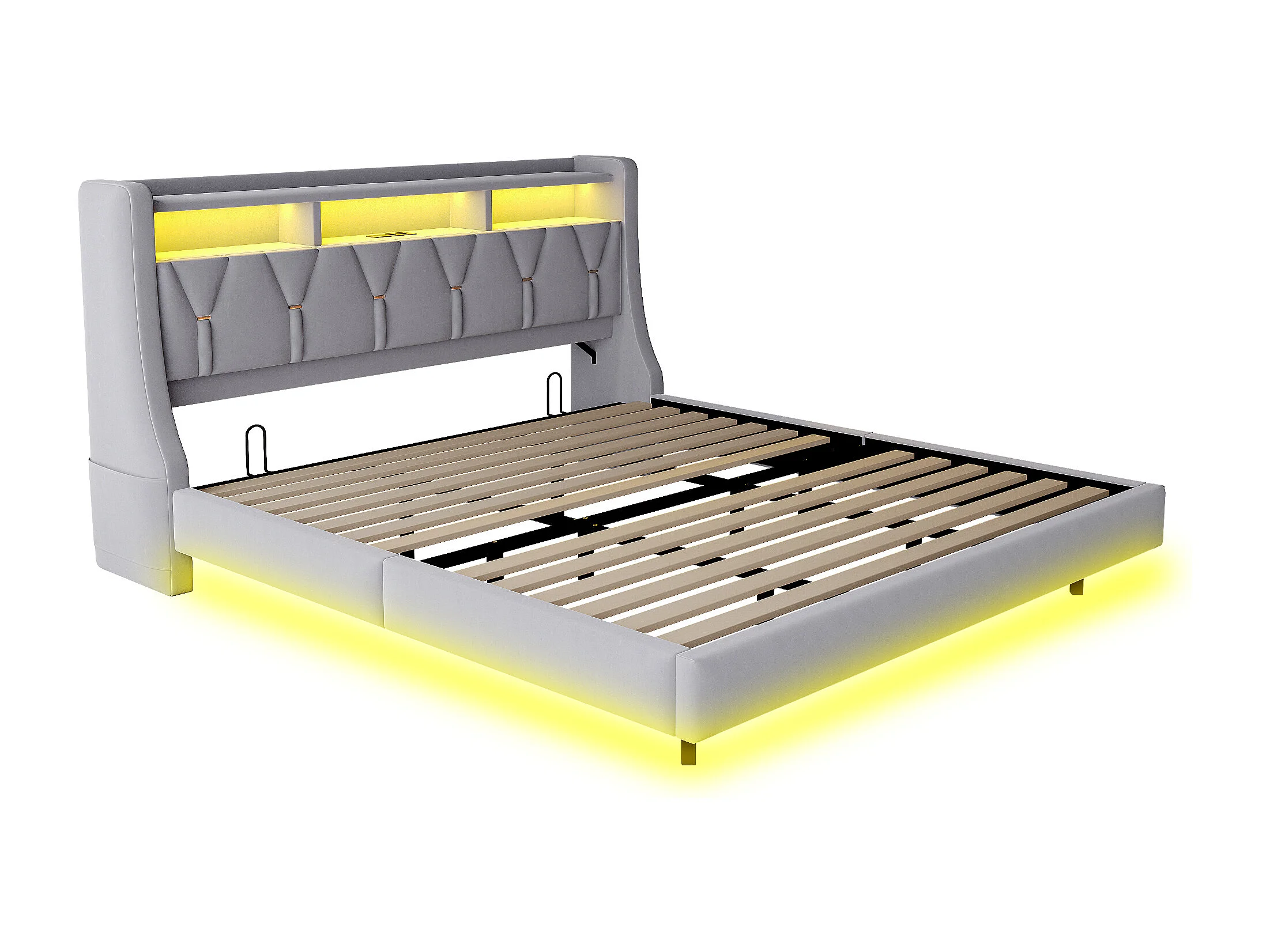 Lit rembourré pour adulte 180x200 cm - Tête de lit pliable - Prise électrique - Éclairage LED - Tissu velours - Gris (matelas non inclus)