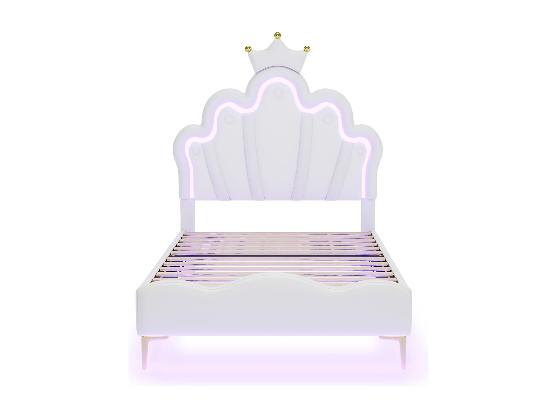 Lit capitonné 140 x 200 cm,avec tête de lit LED réglable et sommier à Lattes, lit Fille, Design Forme Couronne pour Enfants et Adolescents, PU, ​​Blanc
