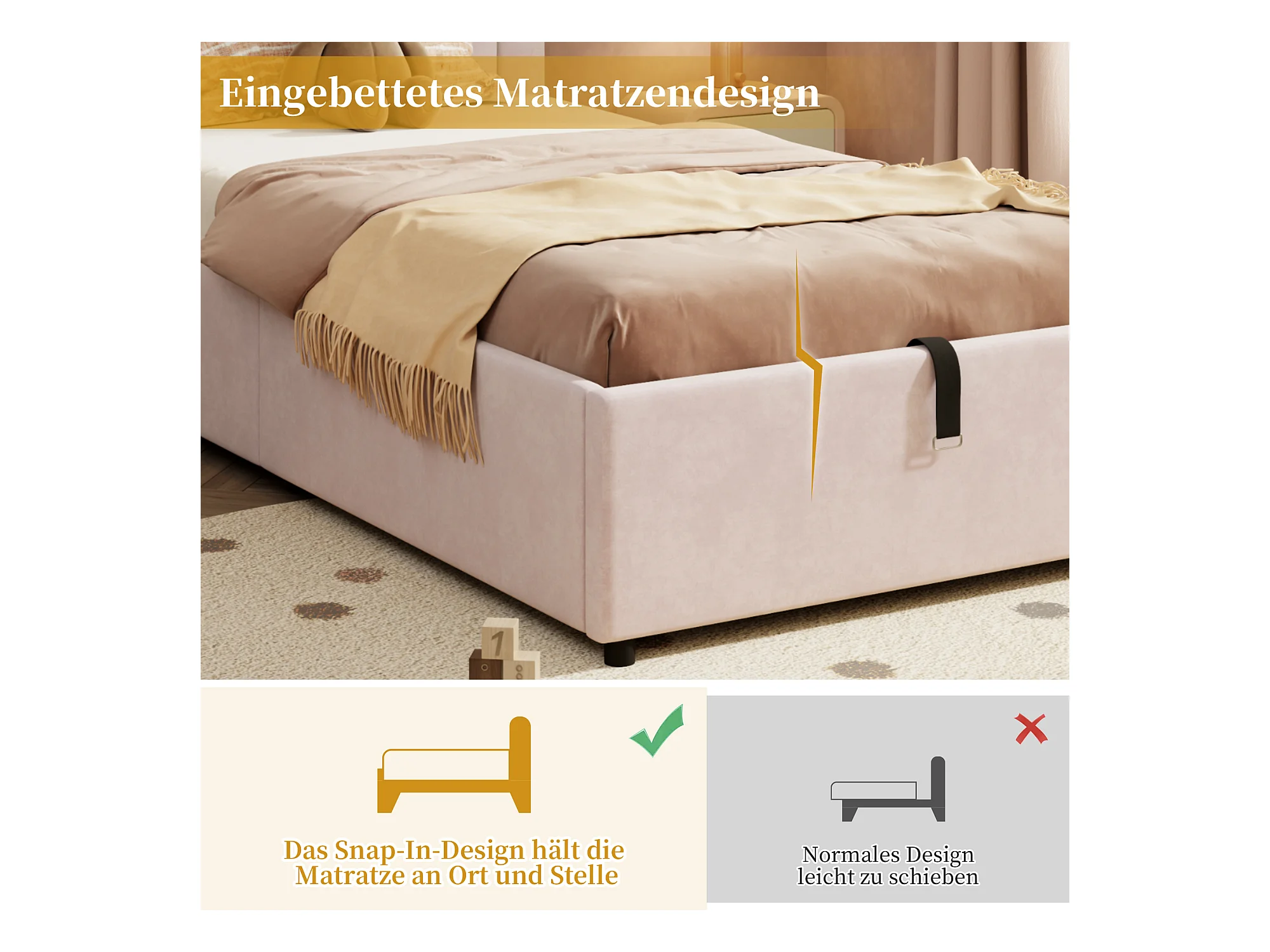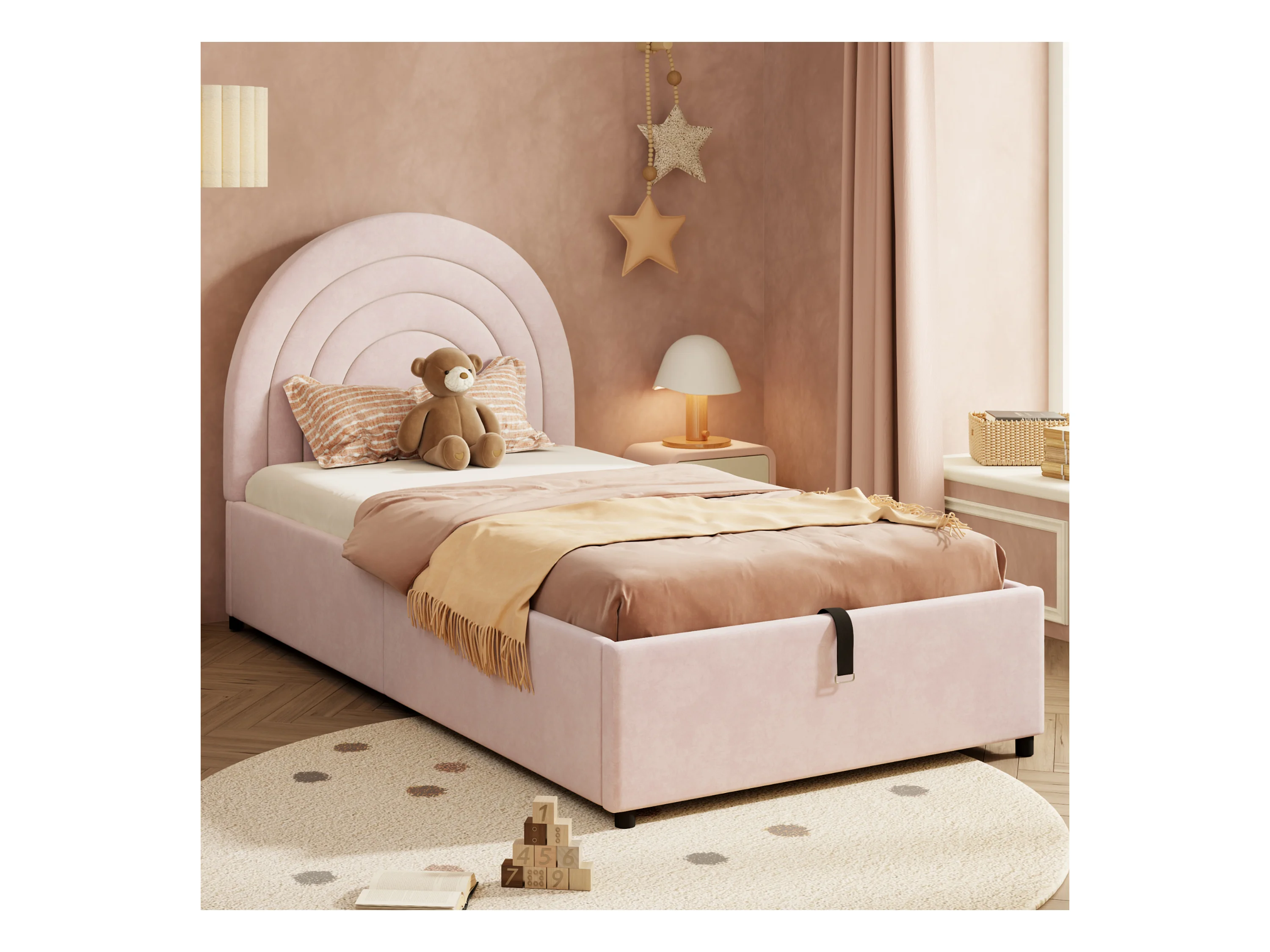 Lit rembourré pour enfant - 90 x 200 cm - avec rangement hydraulique + tête de lit - velours - rose
