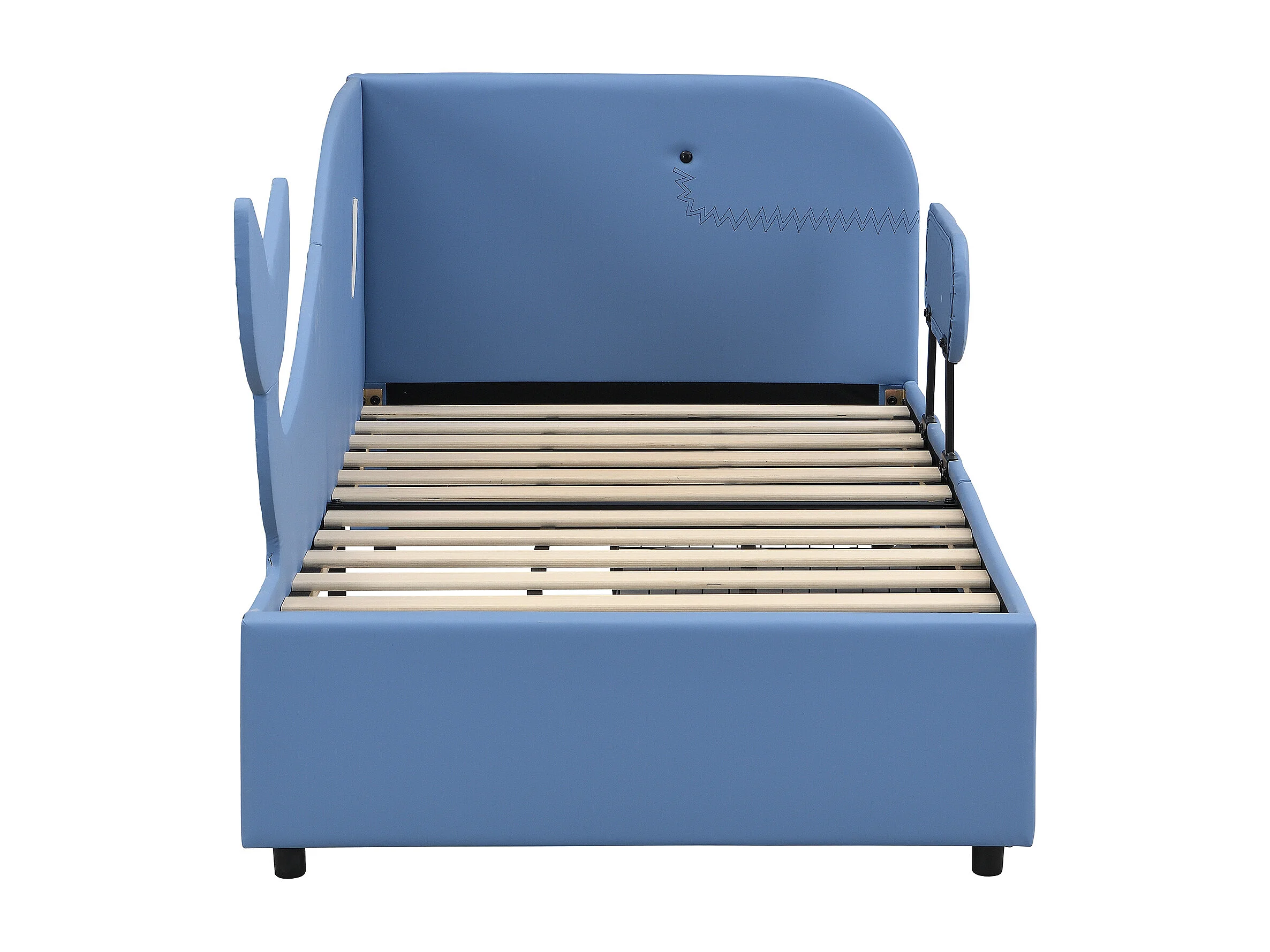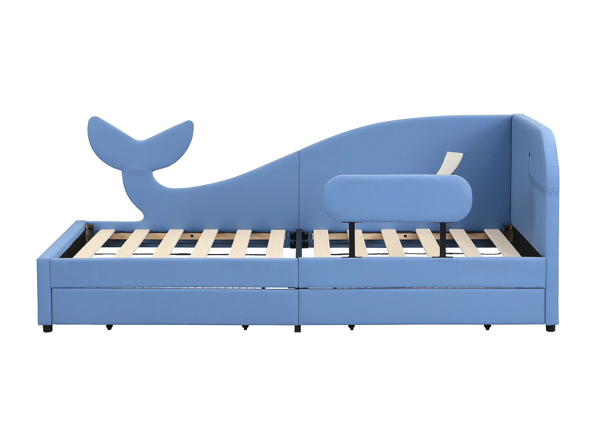 Lit rembourré pour enfant, lit de repos, baleine, canapé-lit (métal), 2 tiroirs, roulettes, PU+MDF+contreplaqué, bleu, 90x200cm