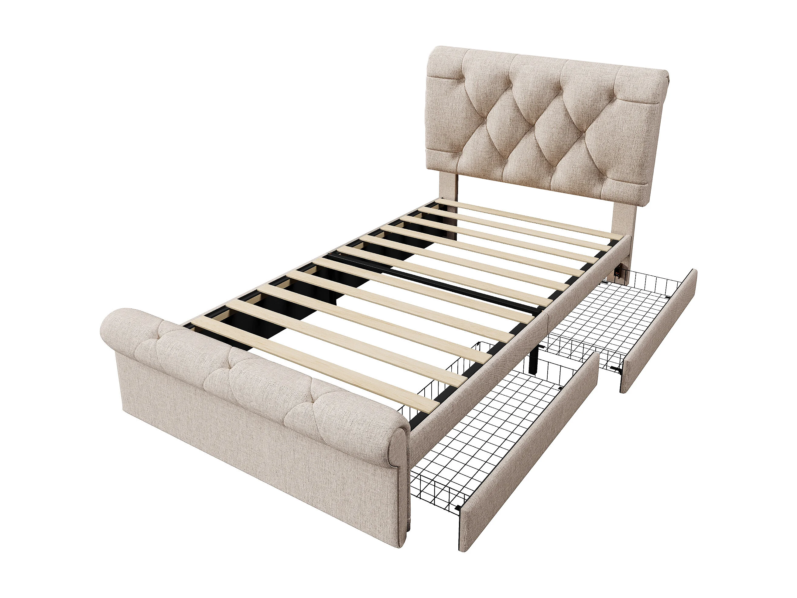 Lit rembourré simple 90x200 cm, 2 tiroirs, tête réglable, style Chesterfield, cadre lin naturel, avec matelas
