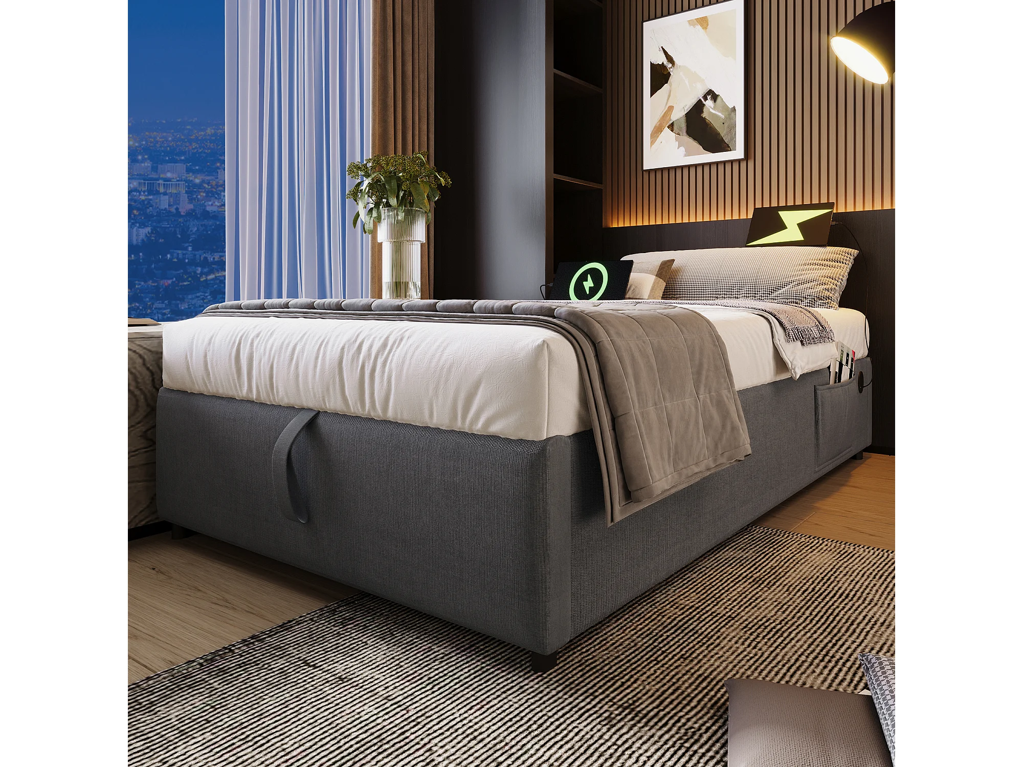 Canapé-lit 90*200, lit escamotable 90*190 avec éclairage LED, prises de courant et multiples compartiments de rangement, flanelle, gris foncé