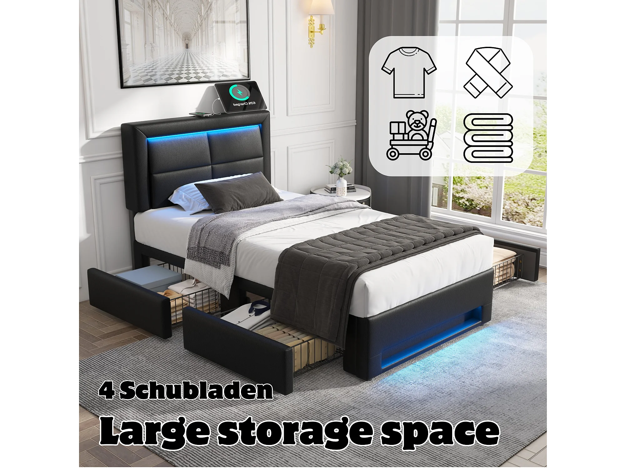 Lit simple 90x200 cm avec 4 tiroirs, éclairage LED et port USB - en PU noir(sans matelas)