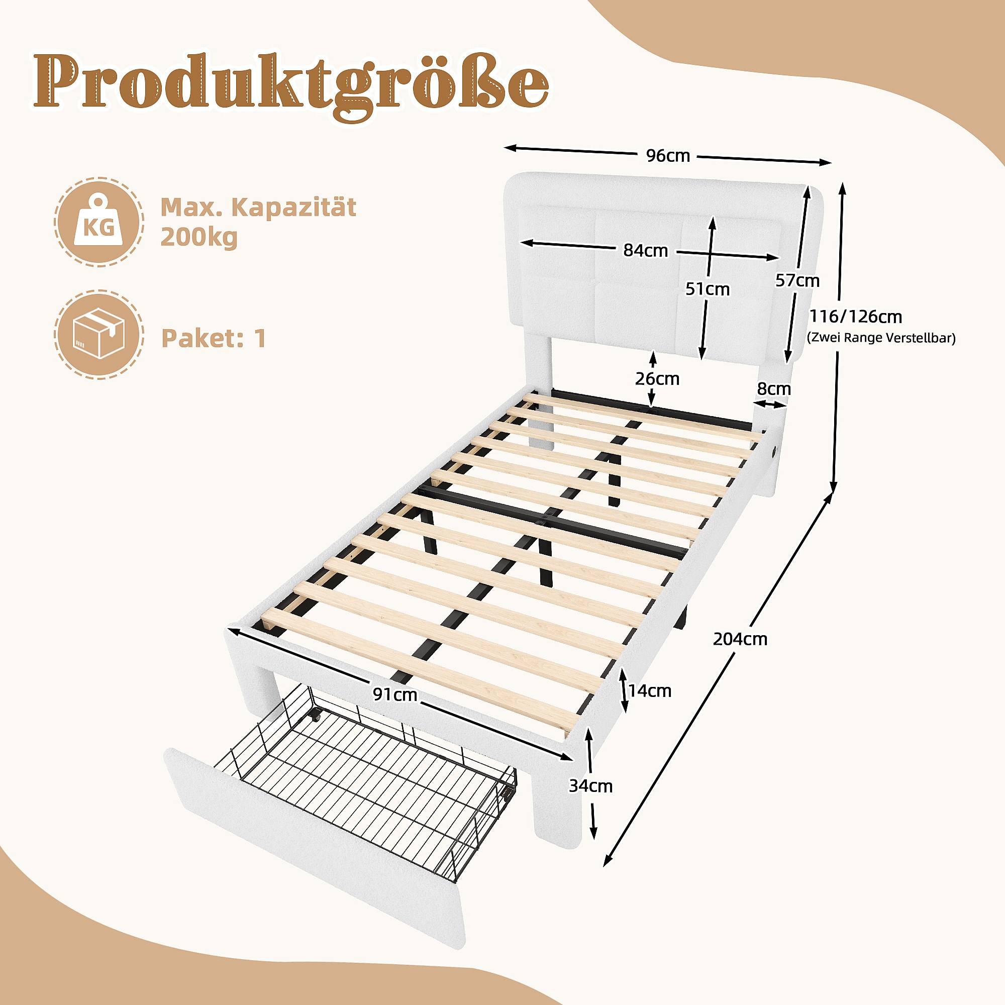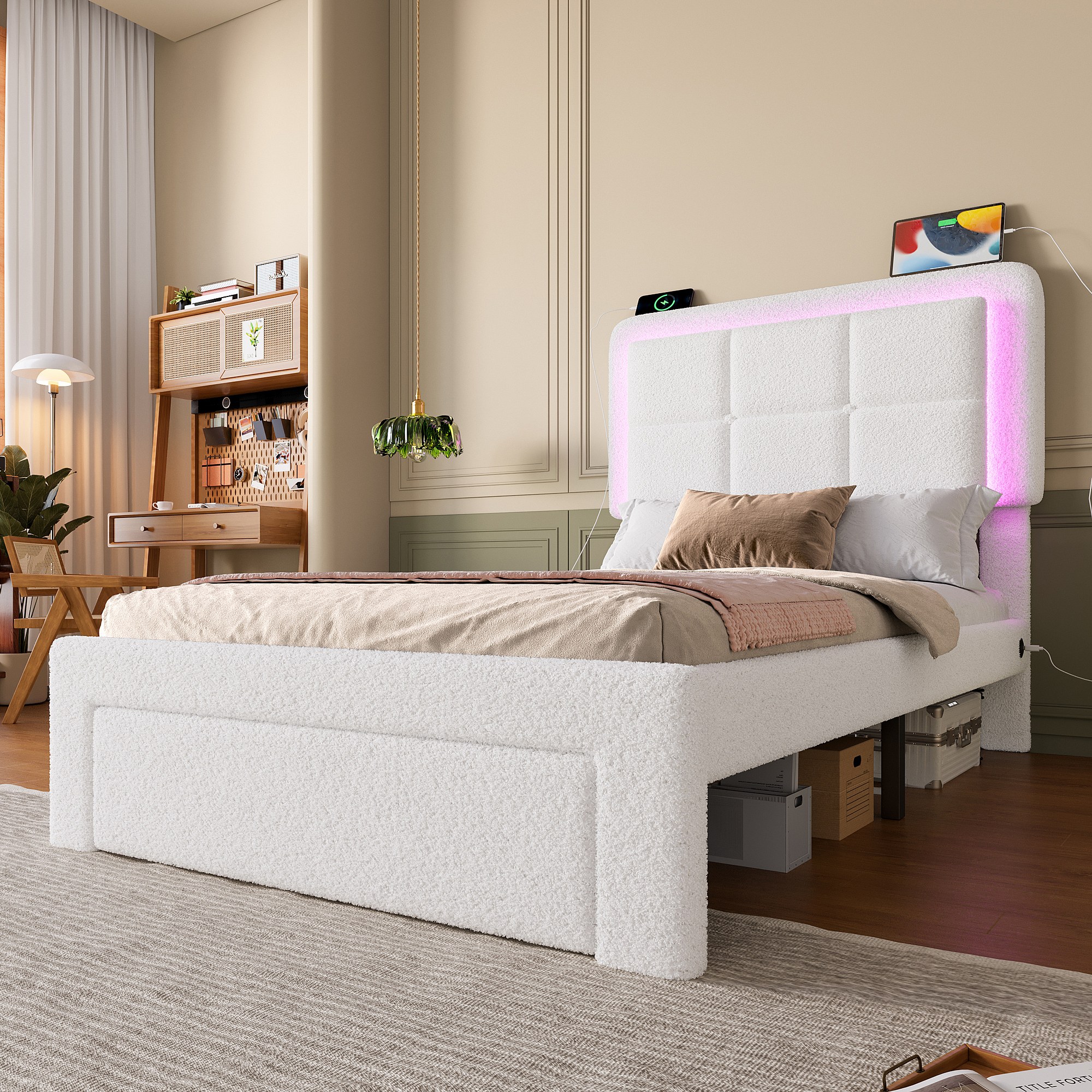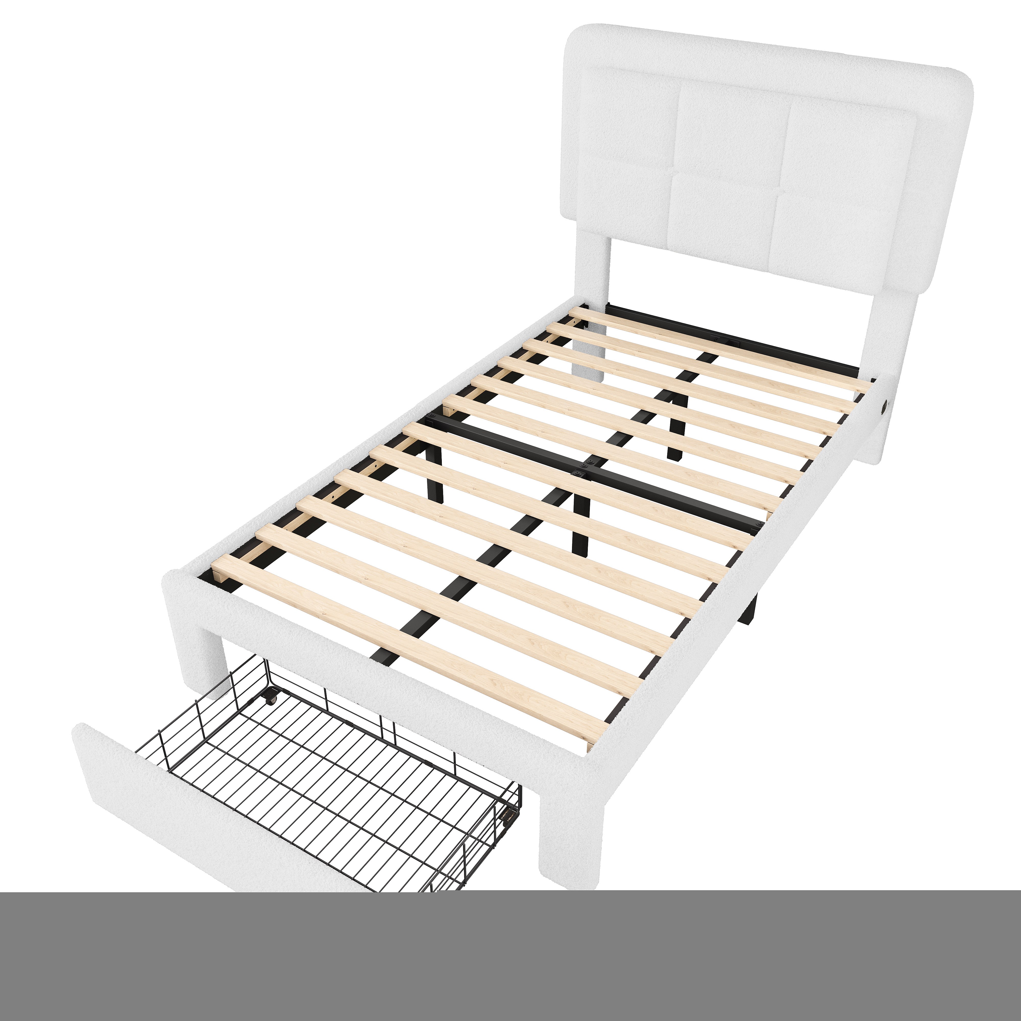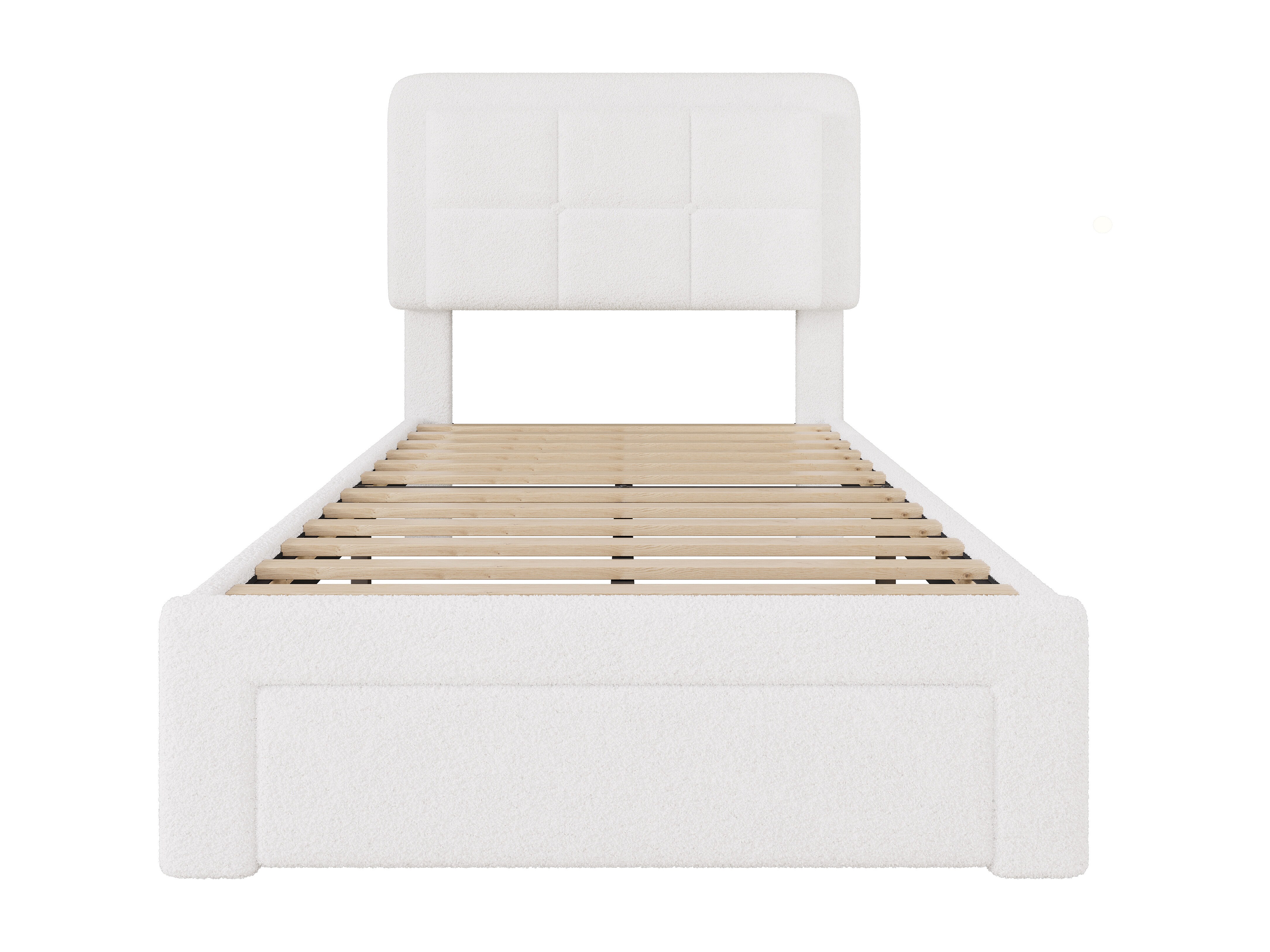 Lit simple 90x200 cm avec LED et USB, 1 tiroir de rangement - peluche blanche (sans matelas)
