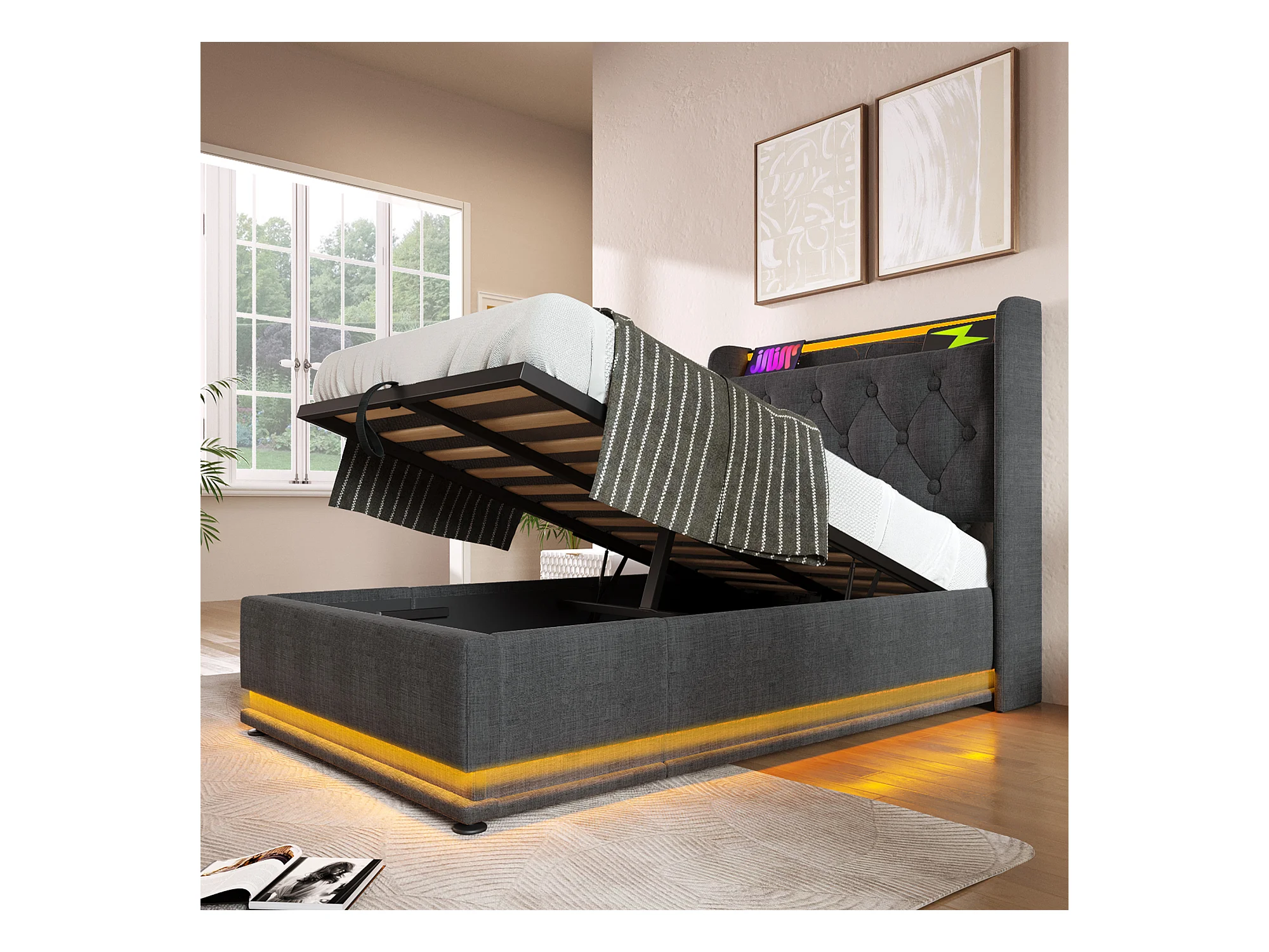 Lit adulte 90x200cm en lin avec LED + USB Type-C, éclairage, avec tiroirs de rangement, gris, sans matelas