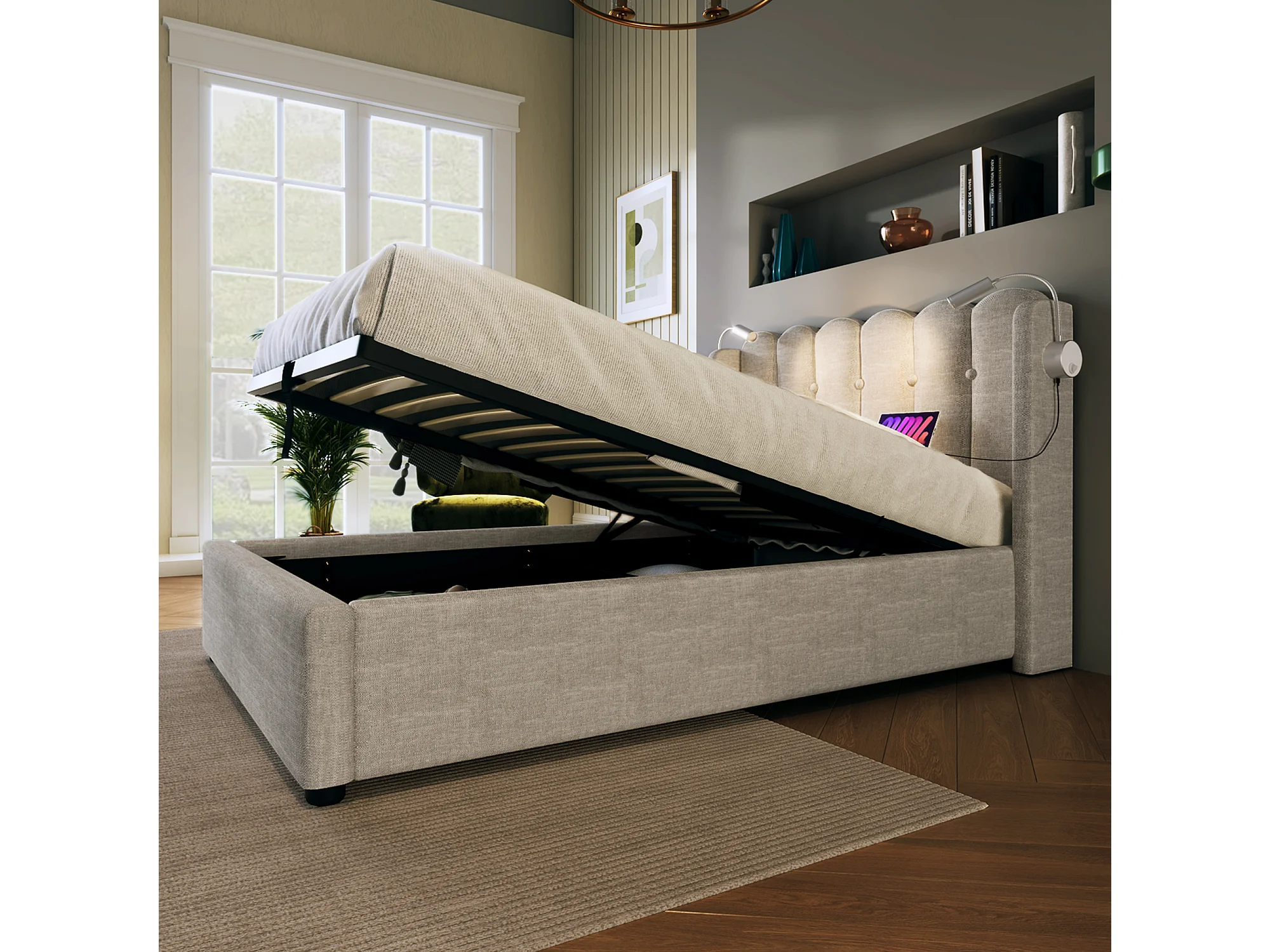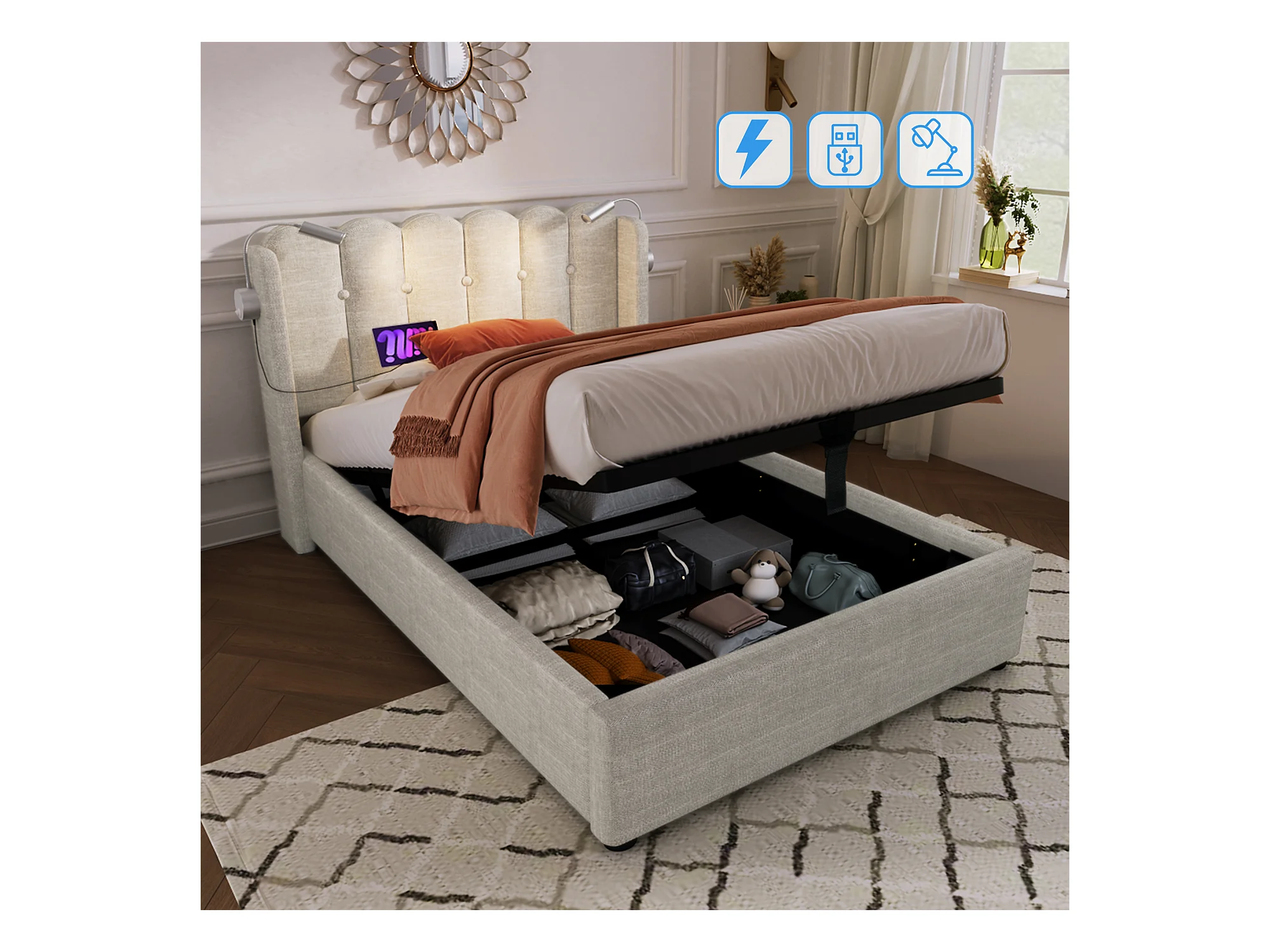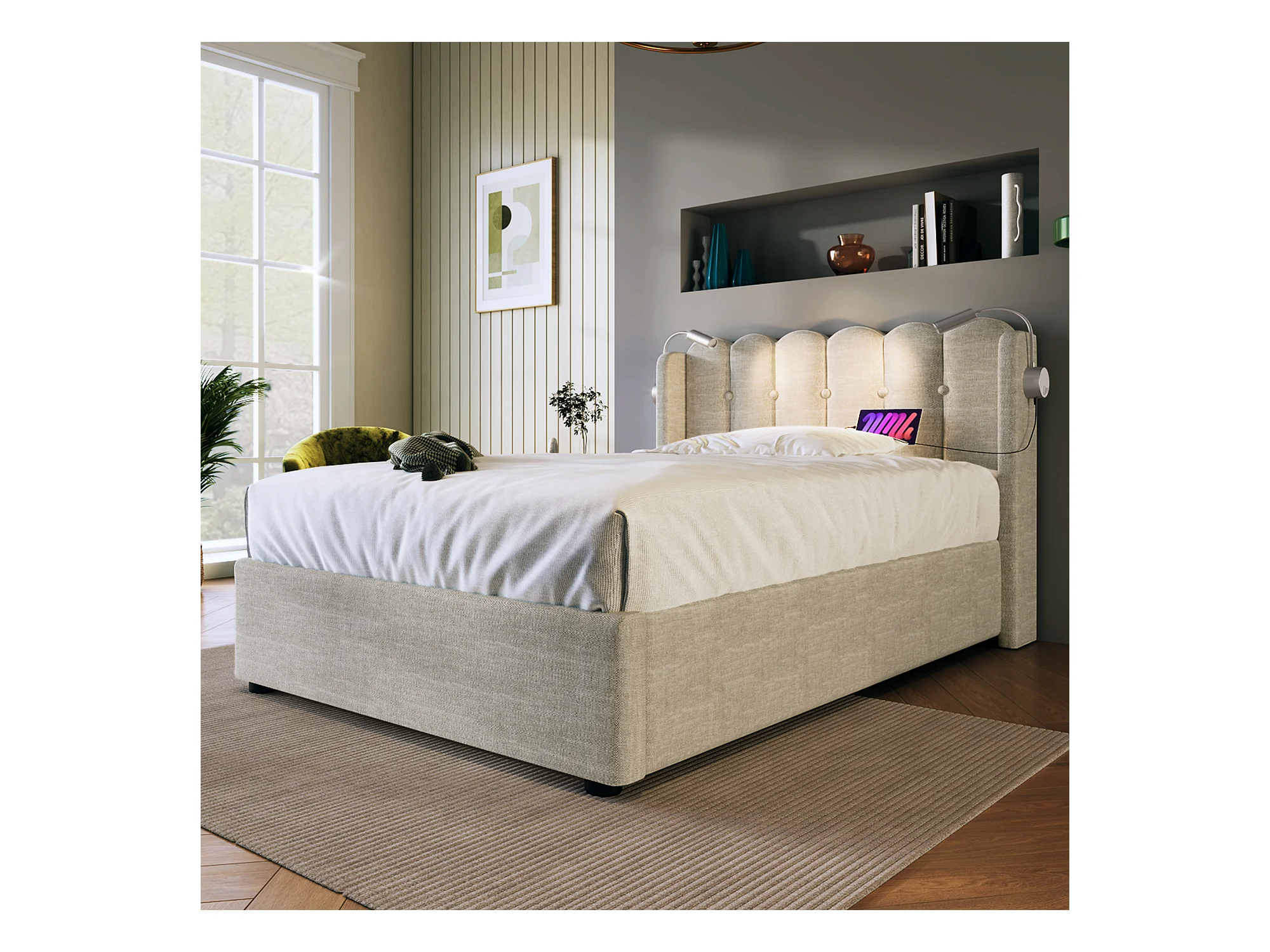 Lit simple avec liseuse et fonction chargeur, structure en lin naturel, rangement intégré, 90x200x95cm