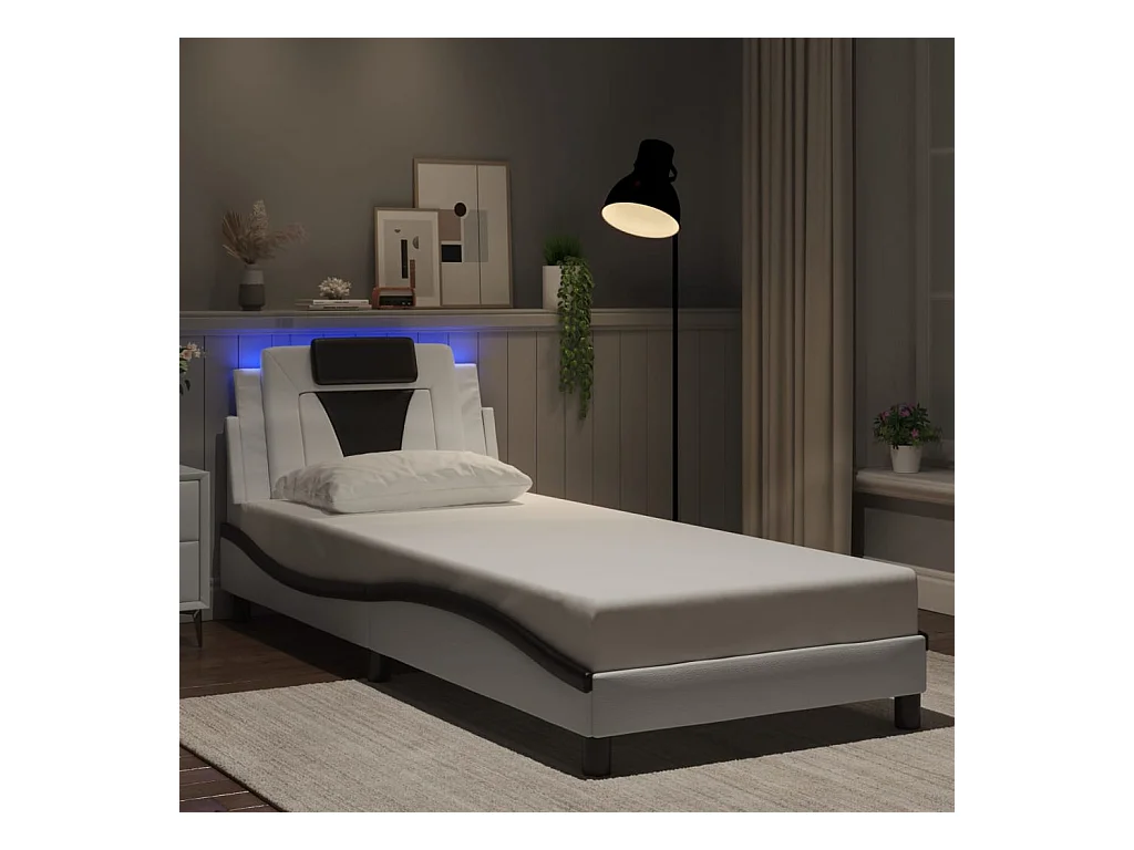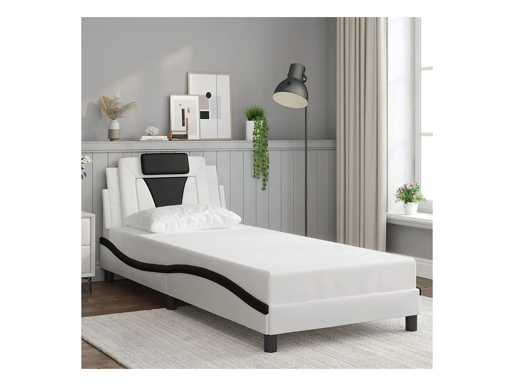 Lit simple + tête de lit blanc et noir 90x200cm similicuir FR83427