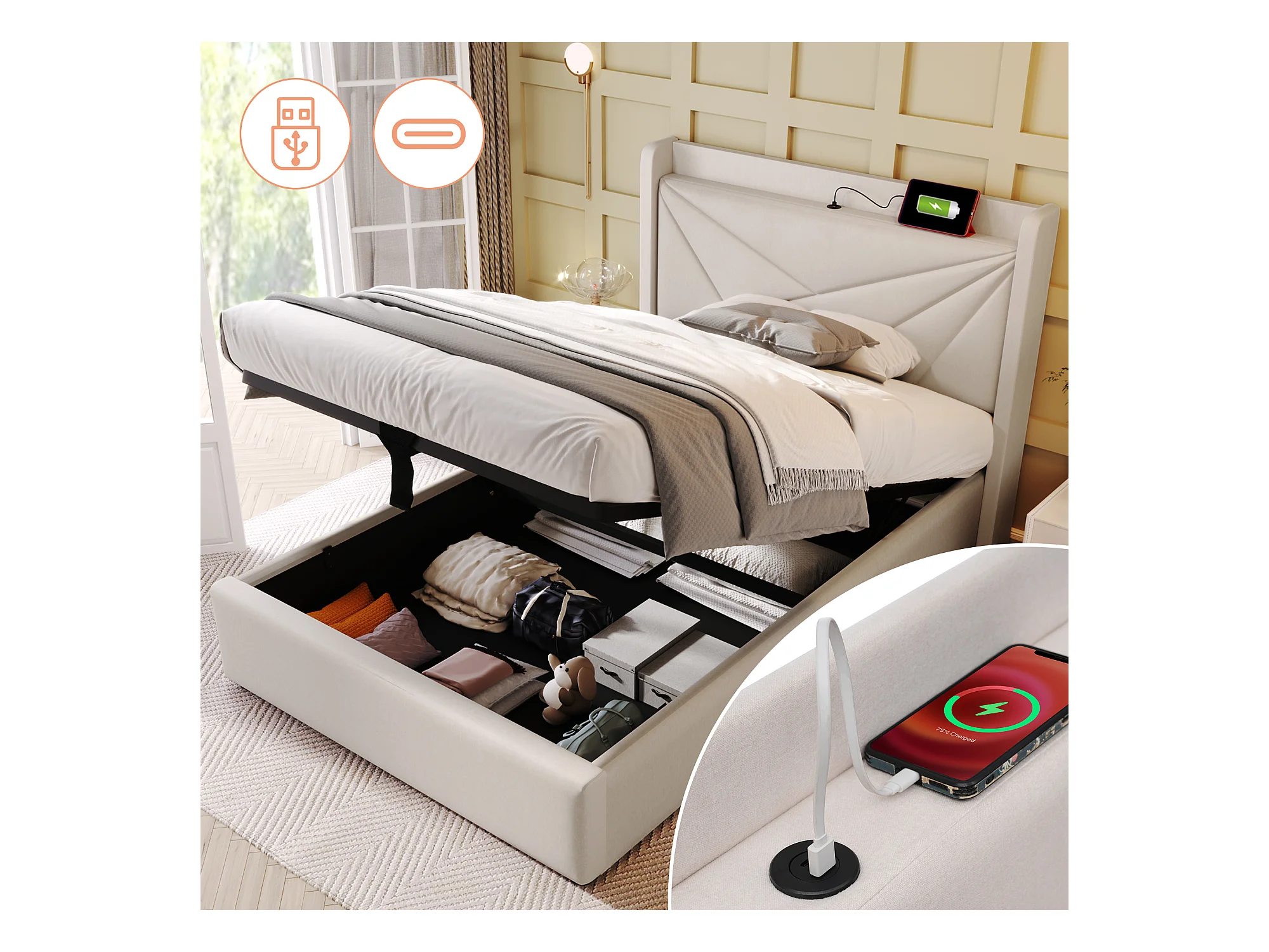 Lit simple coffre avec tête de lit USB Type C, structure en lin beige (96x208x107cm)