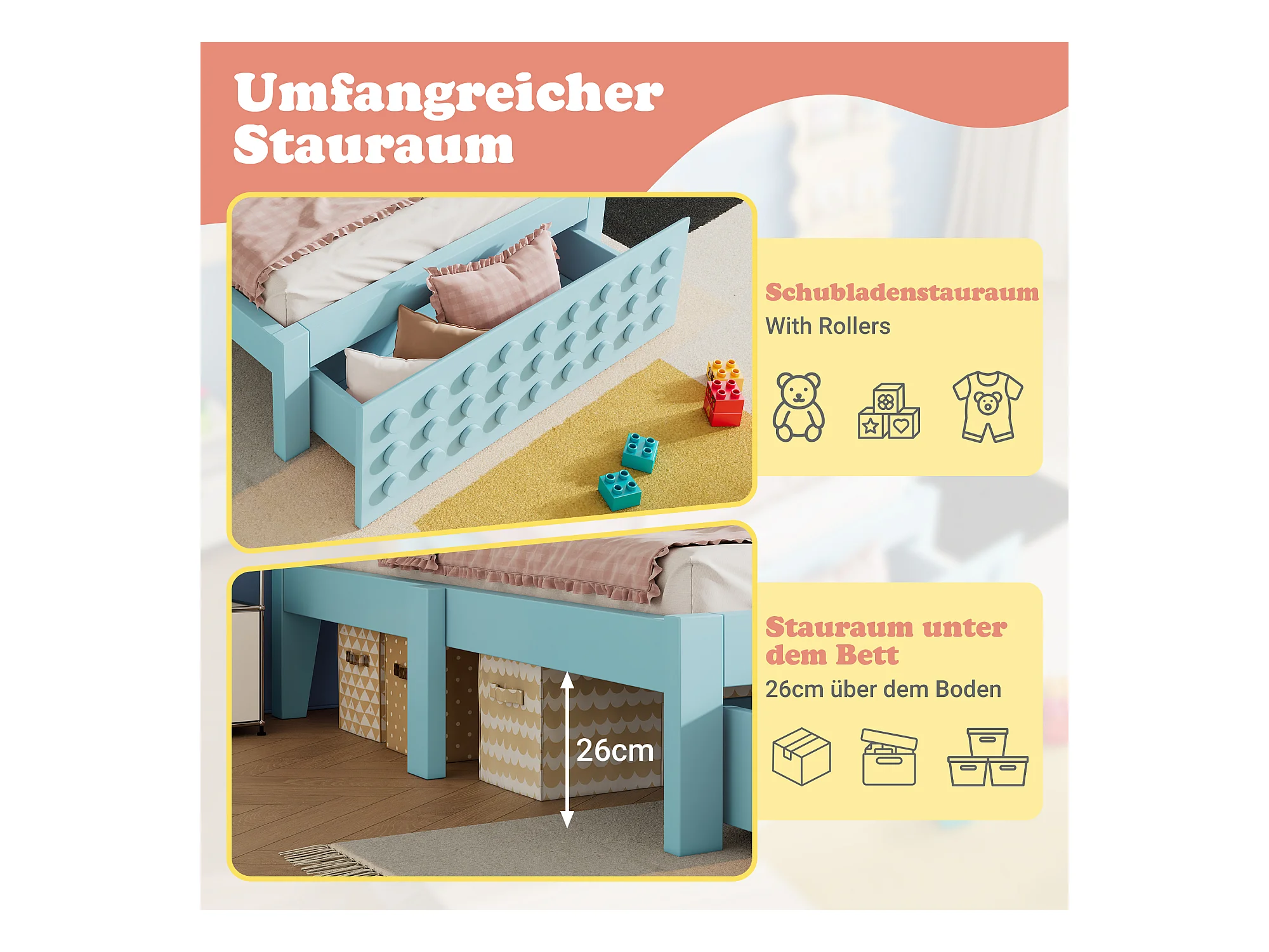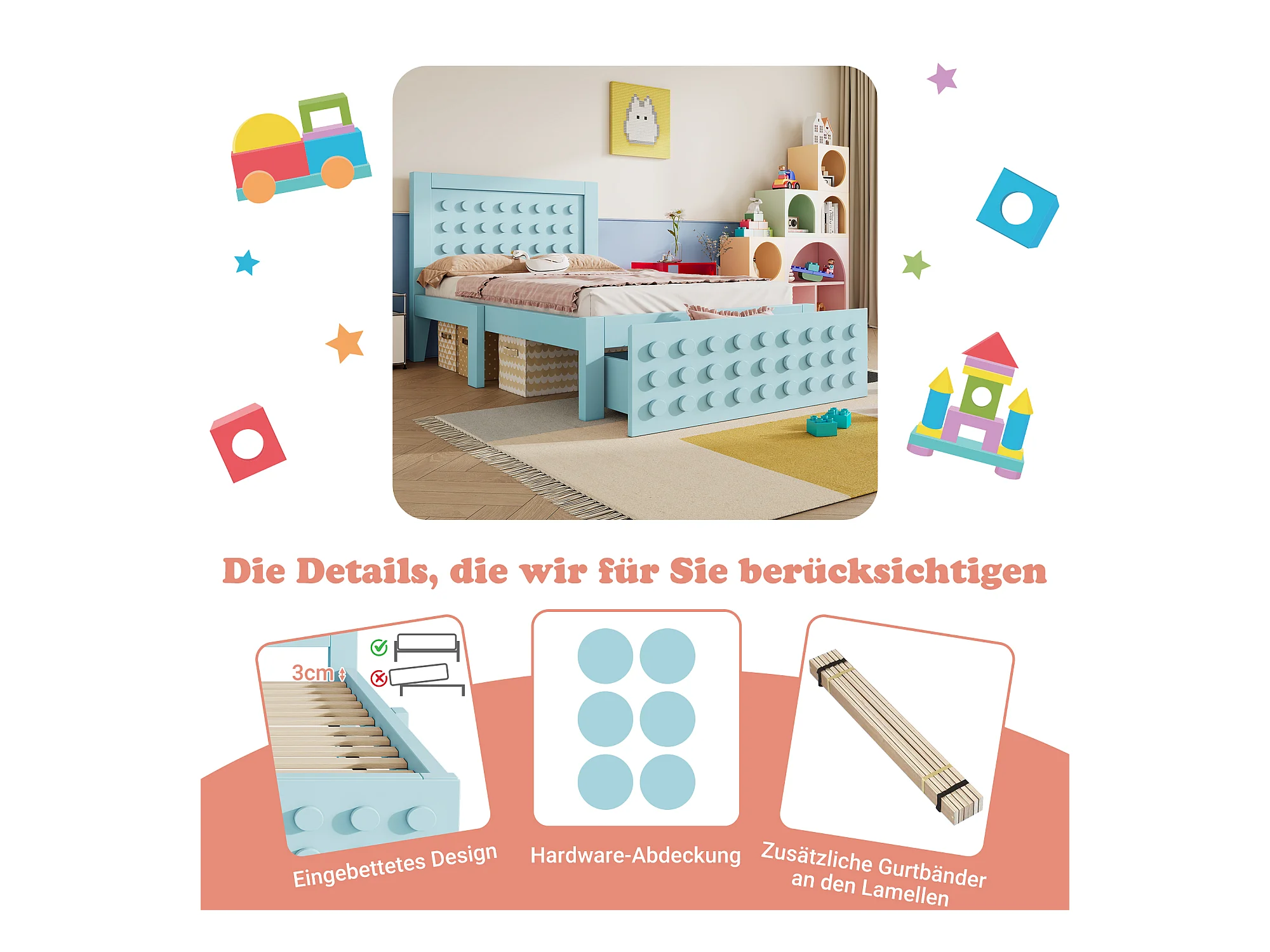 Lit simple 90x200 cm avec 1 tiroir et sommier à lattes, design bloc créatif bleu - sans matelas