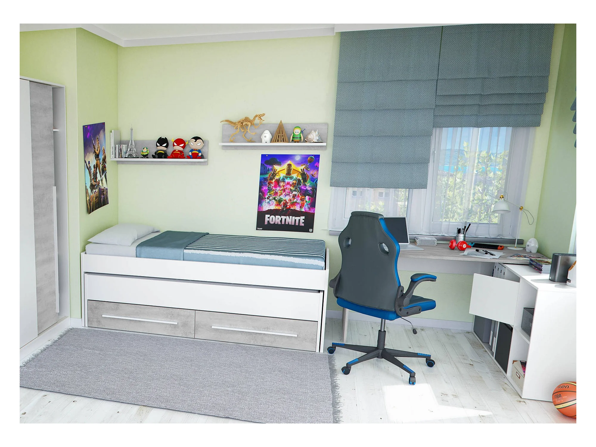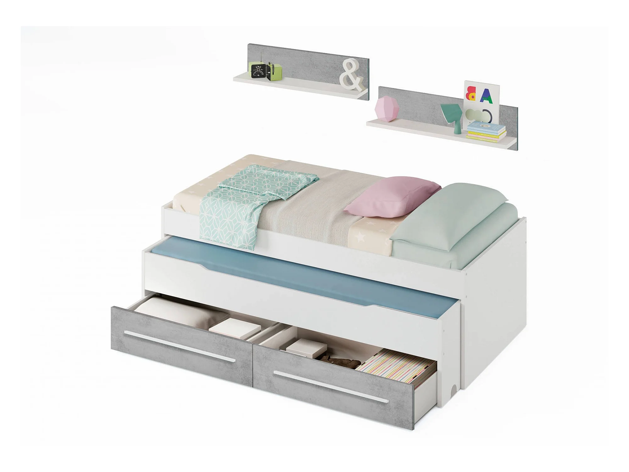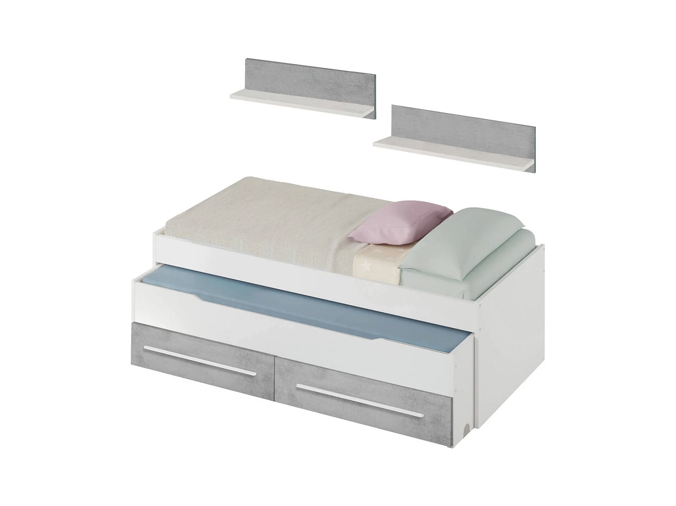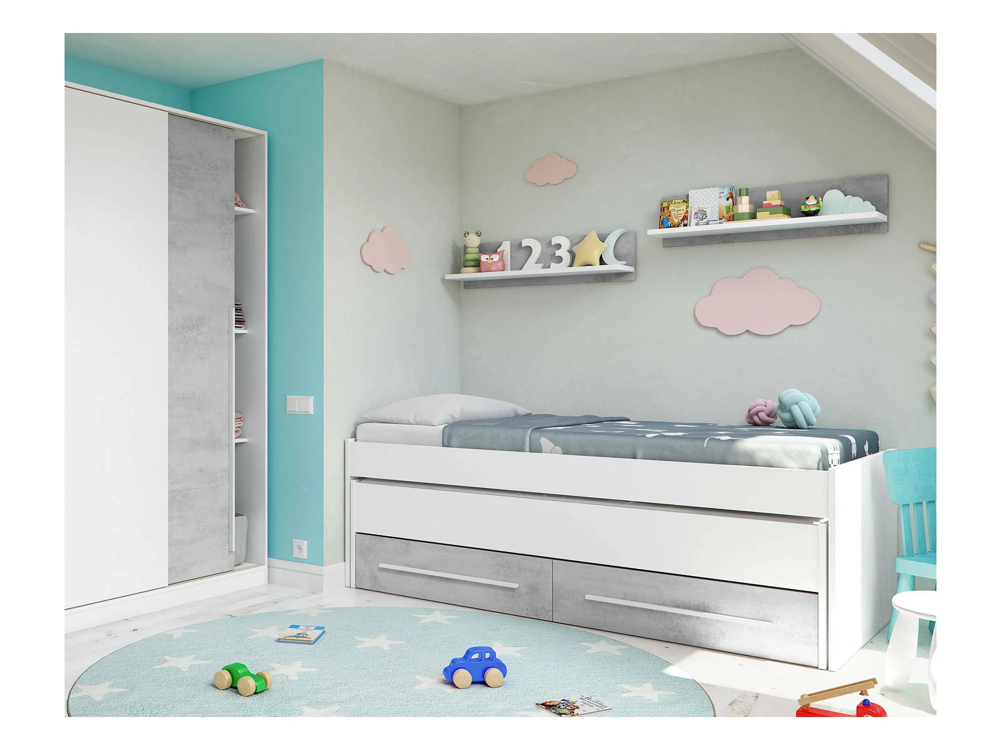 Lit simple Fairfield, Cadre de lit pour chambre, Lit simple avec lit extractible et 2 tiroirs et étagère, 199x96h65 cm, Blanc et Ciment