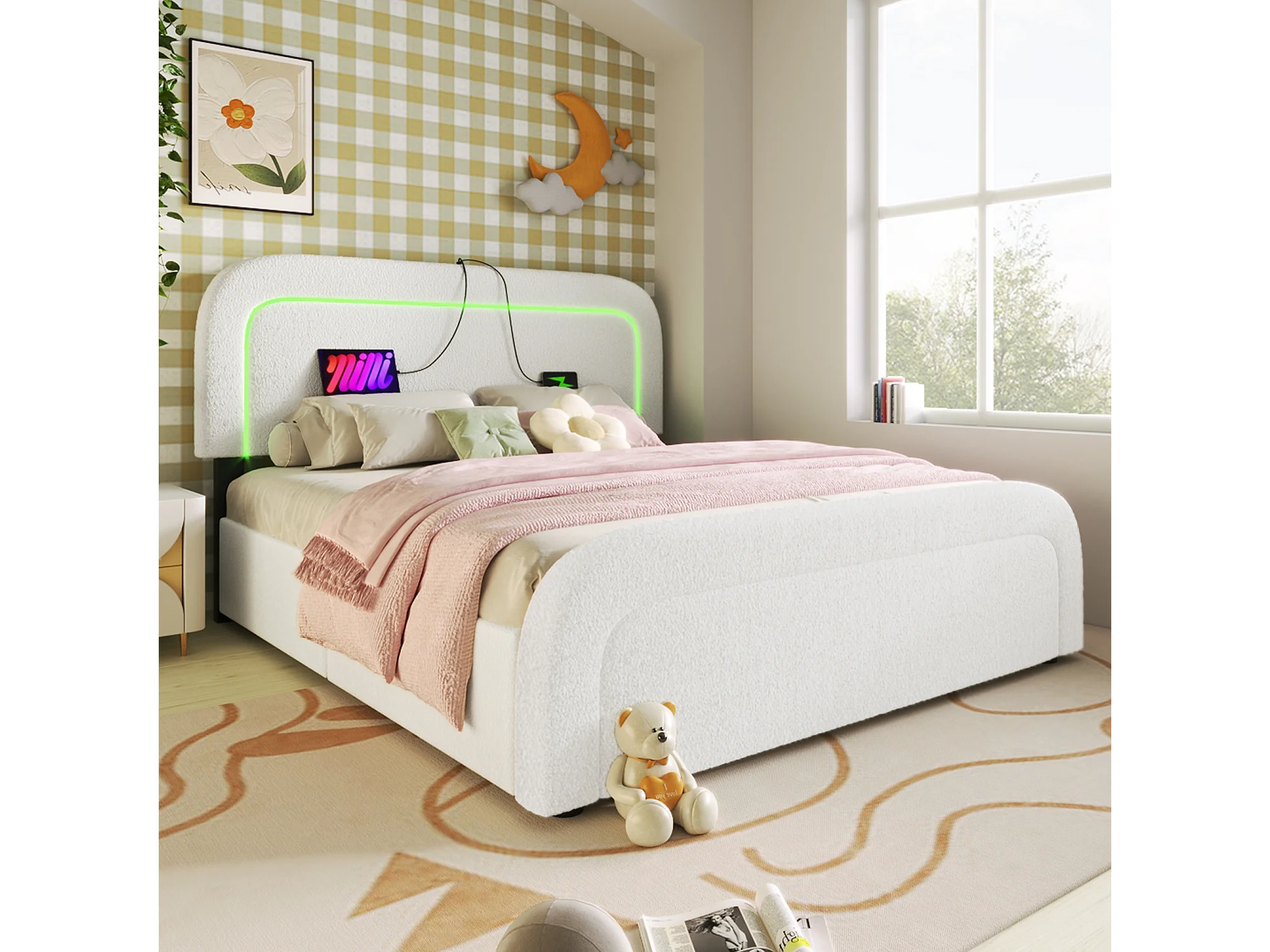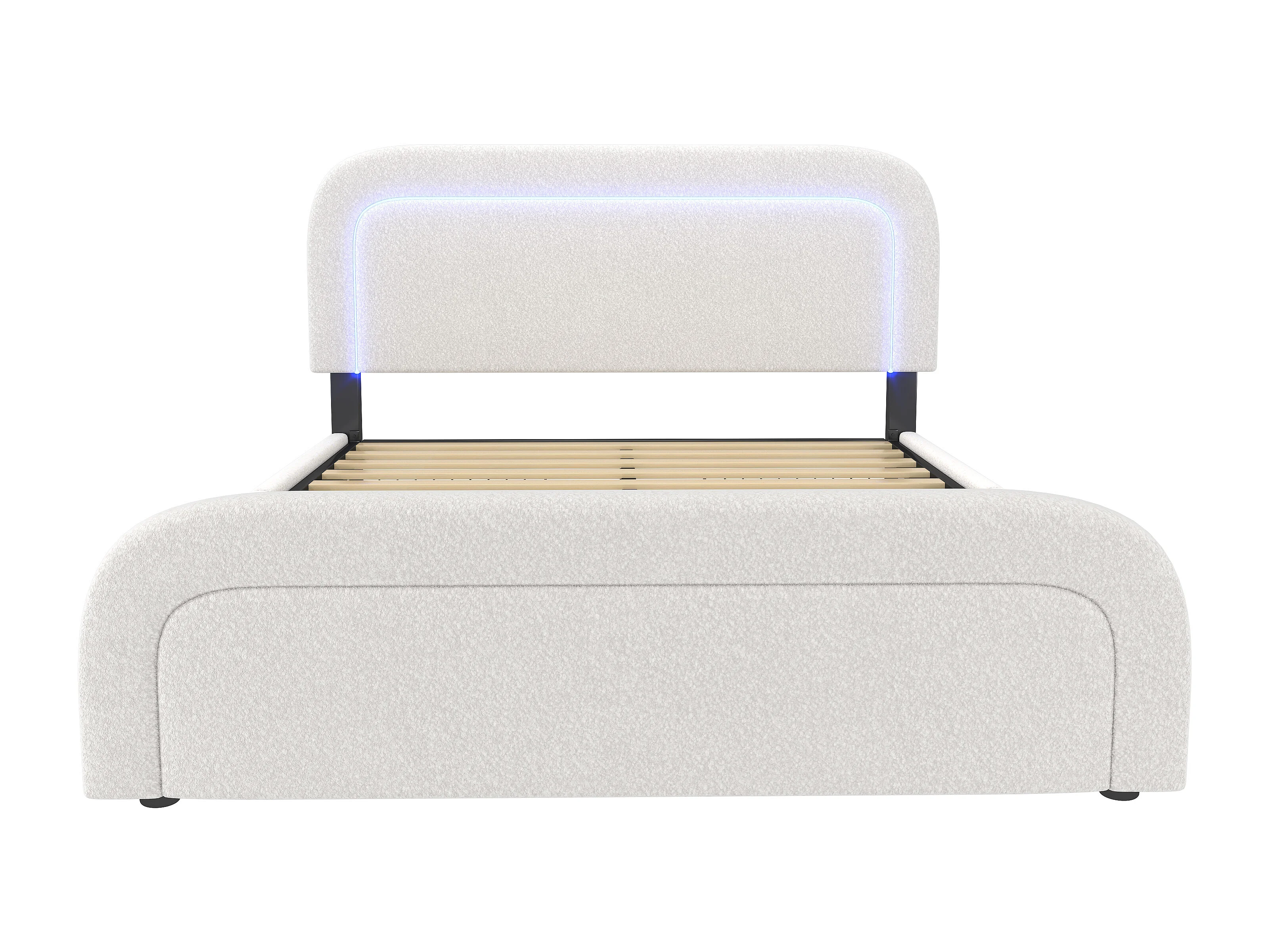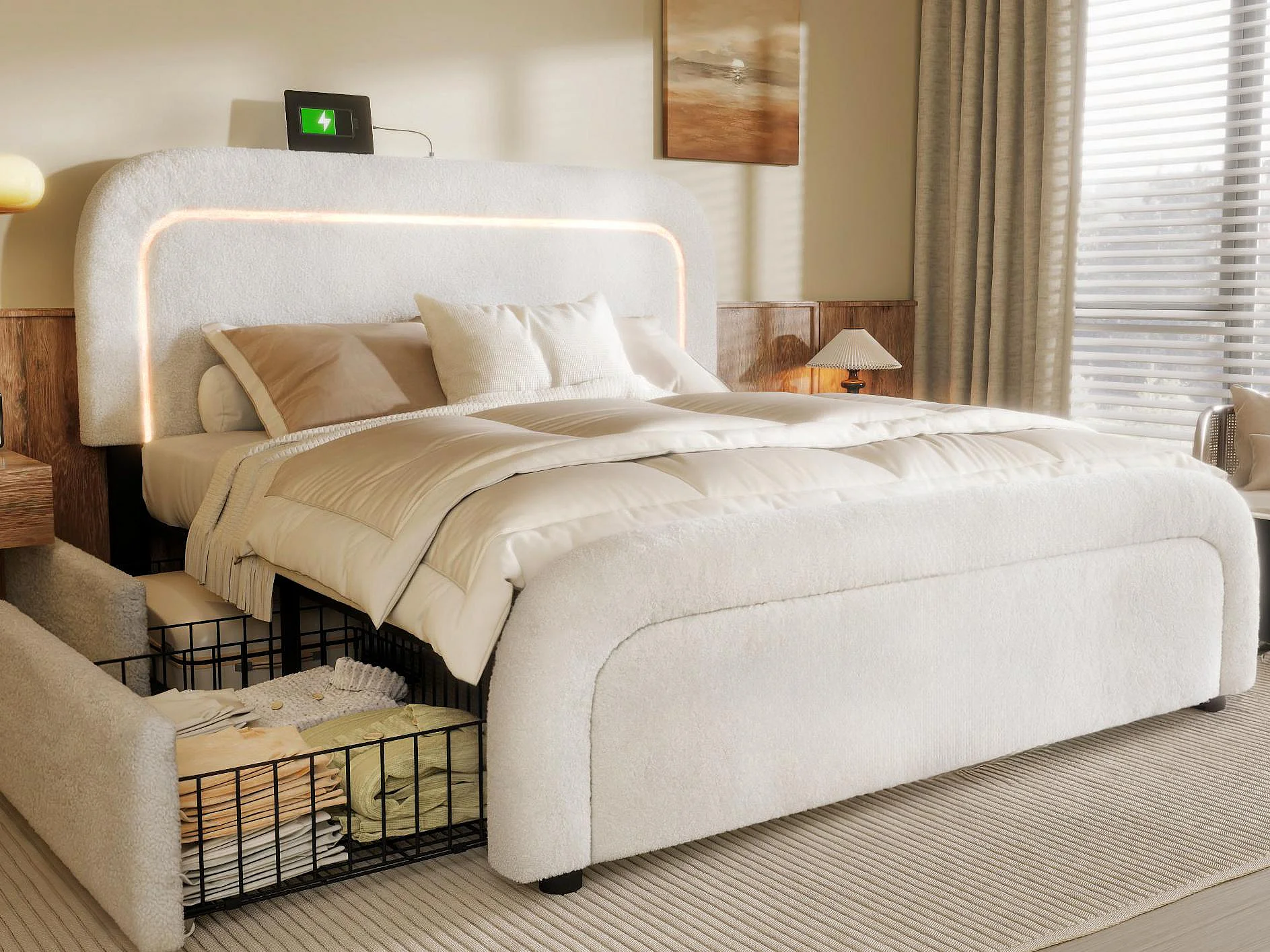 Lit double rembourré en sherpa avec 4 tiroirs - 140x200cm - avec LED et ports de charge - Blanc