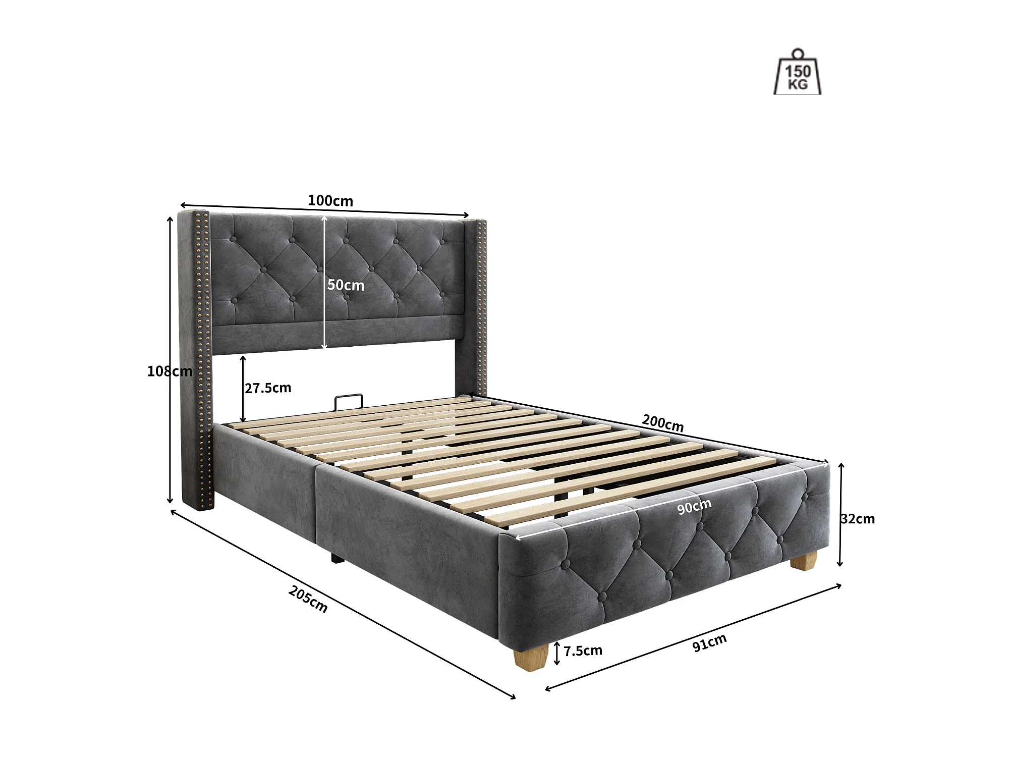 Lit 90x200cm rembourré en velours - avec sommier à lattes - Gris