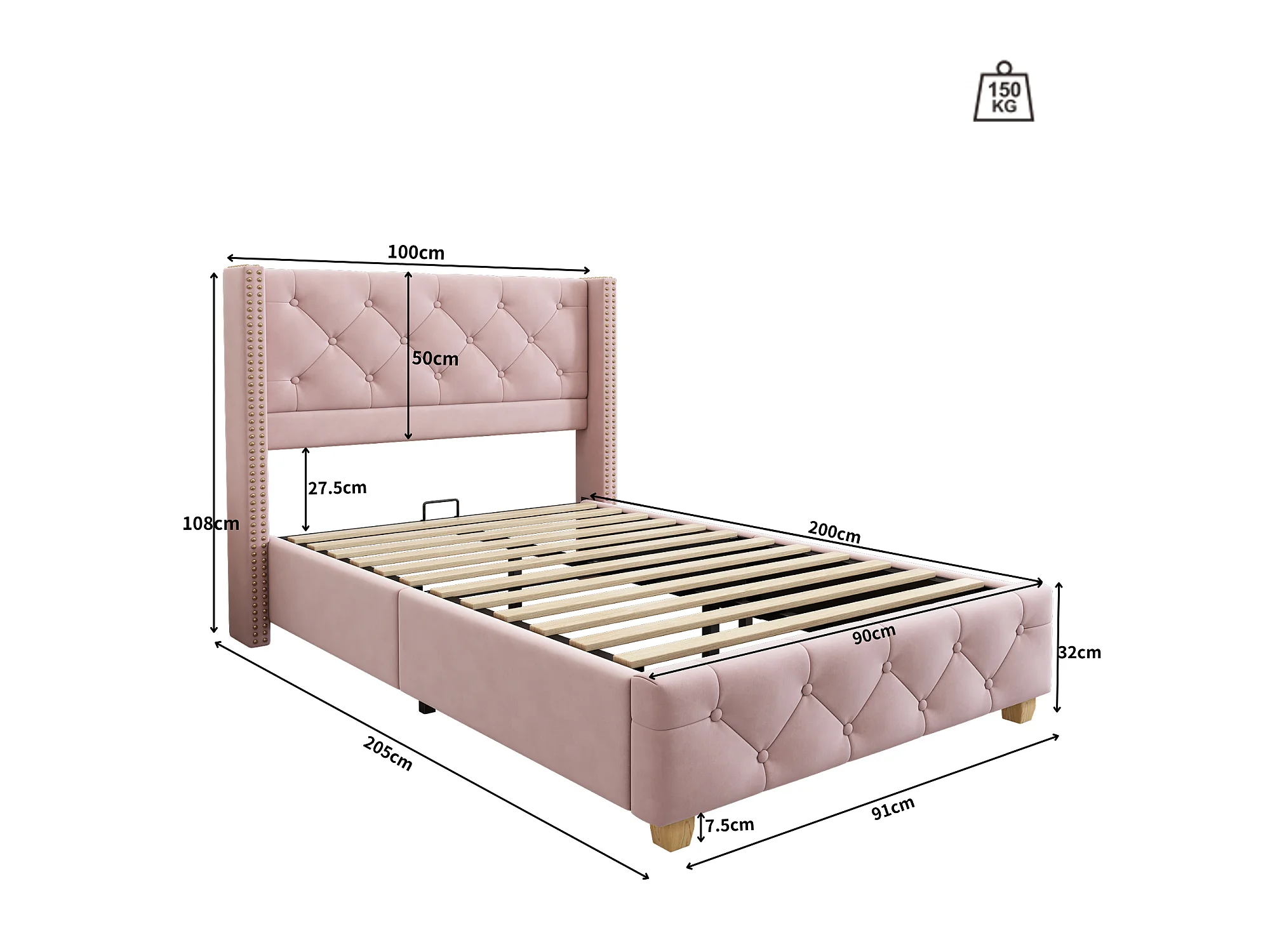 Lit 90x200cm rembourré en velours - avec sommier à lattes - Rose