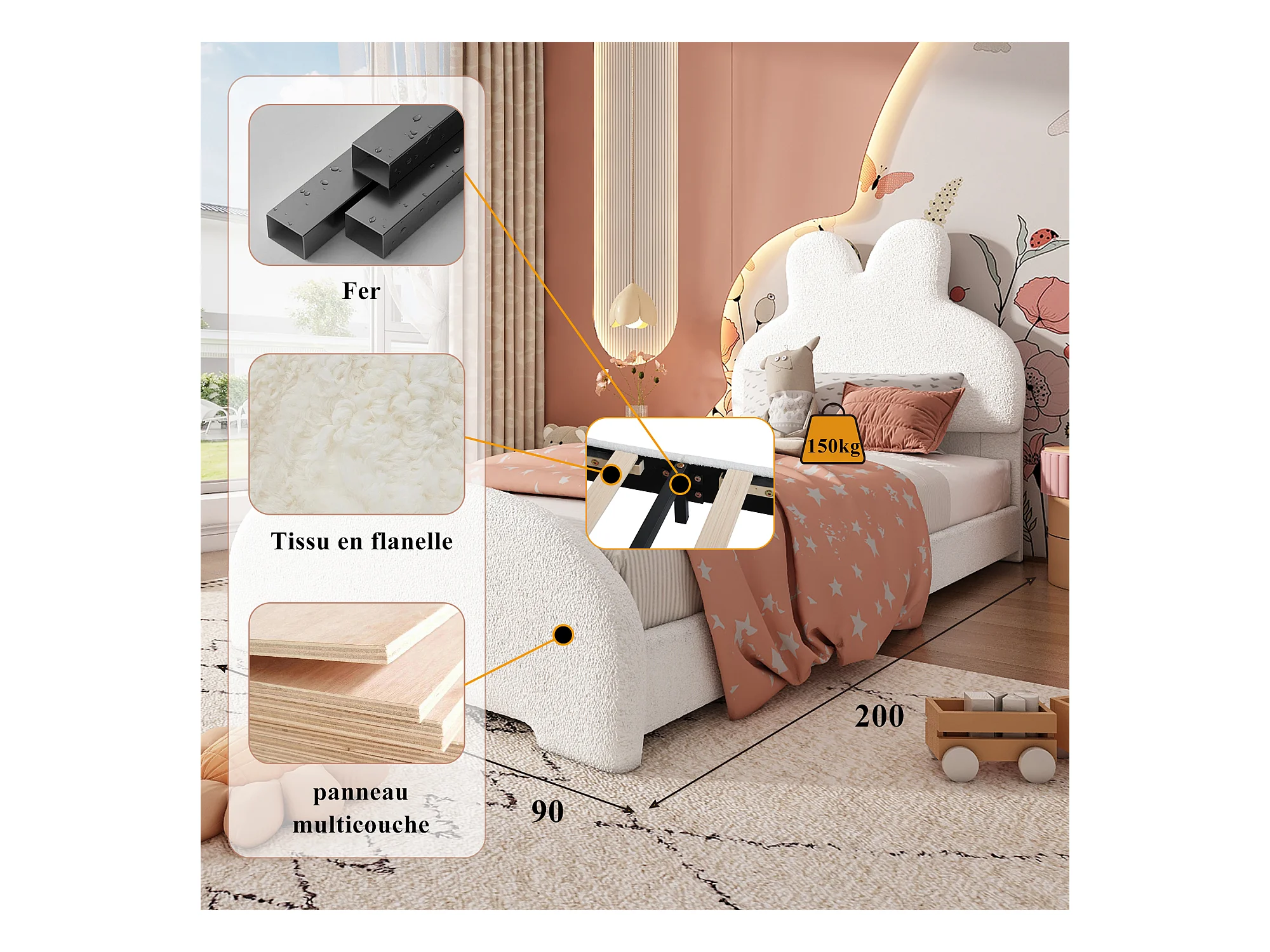 Lit simple rembourré enfant - 90 x 200 cm - tête de lit en oreilles de lapin - style cartoon - velours - blanc