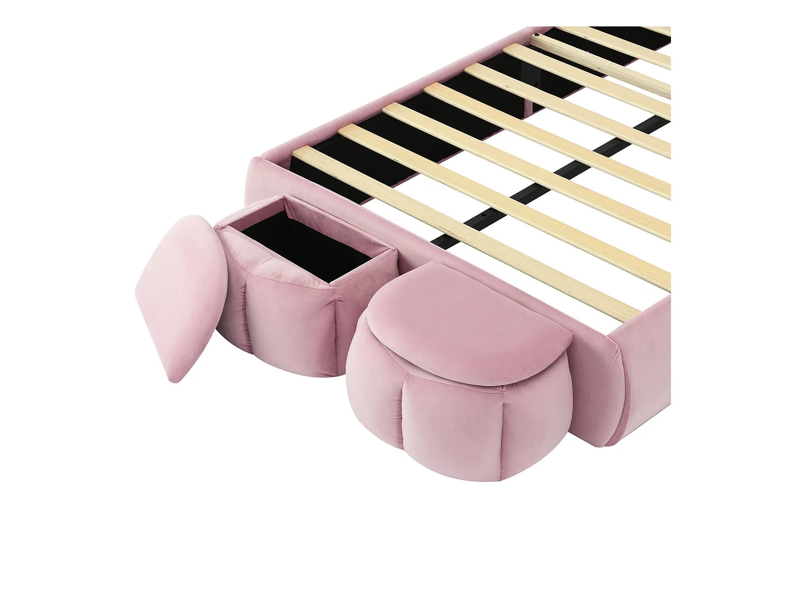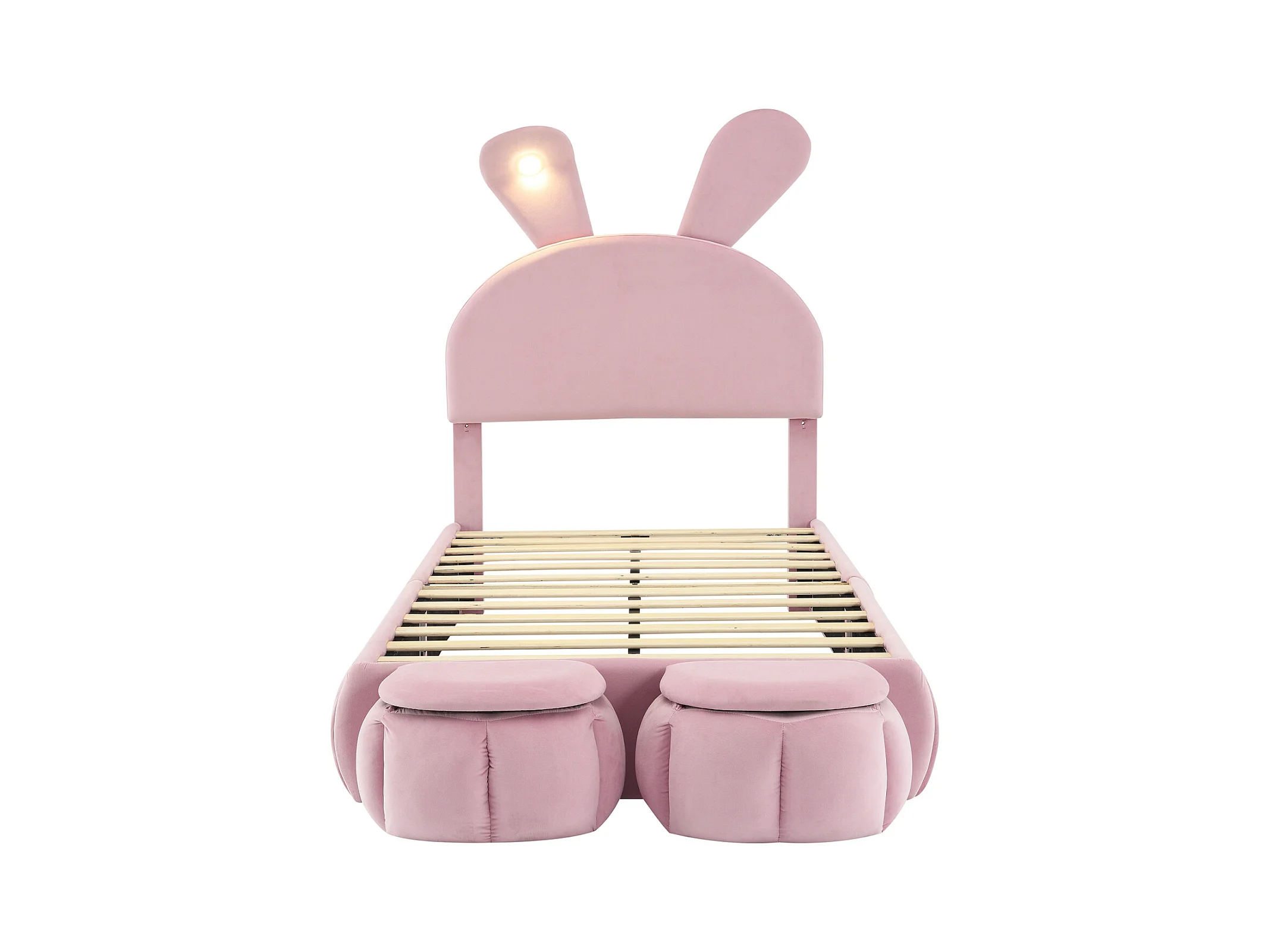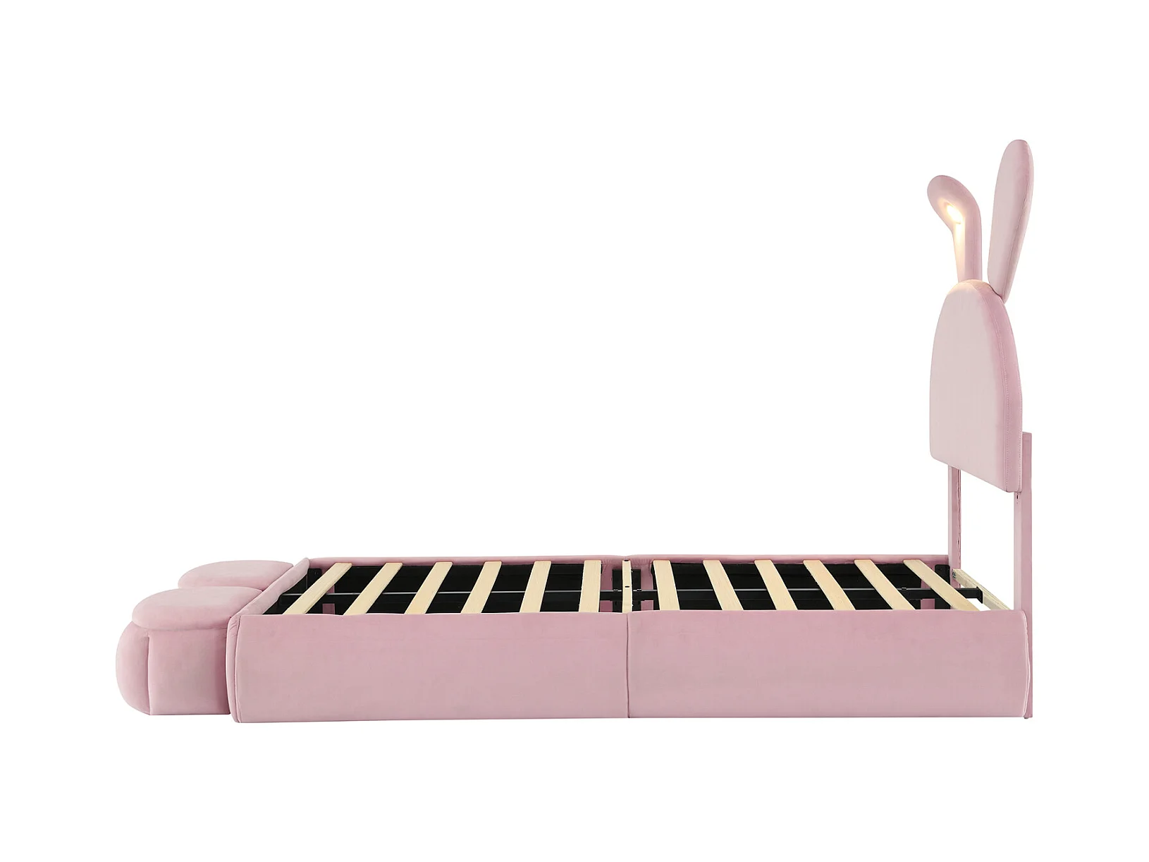 Lit simple rembourré, oreilles de lapin (lumière variable, bandes chaudes), 2 tabourets, lattes de bois, velours, rose, 90x200cm