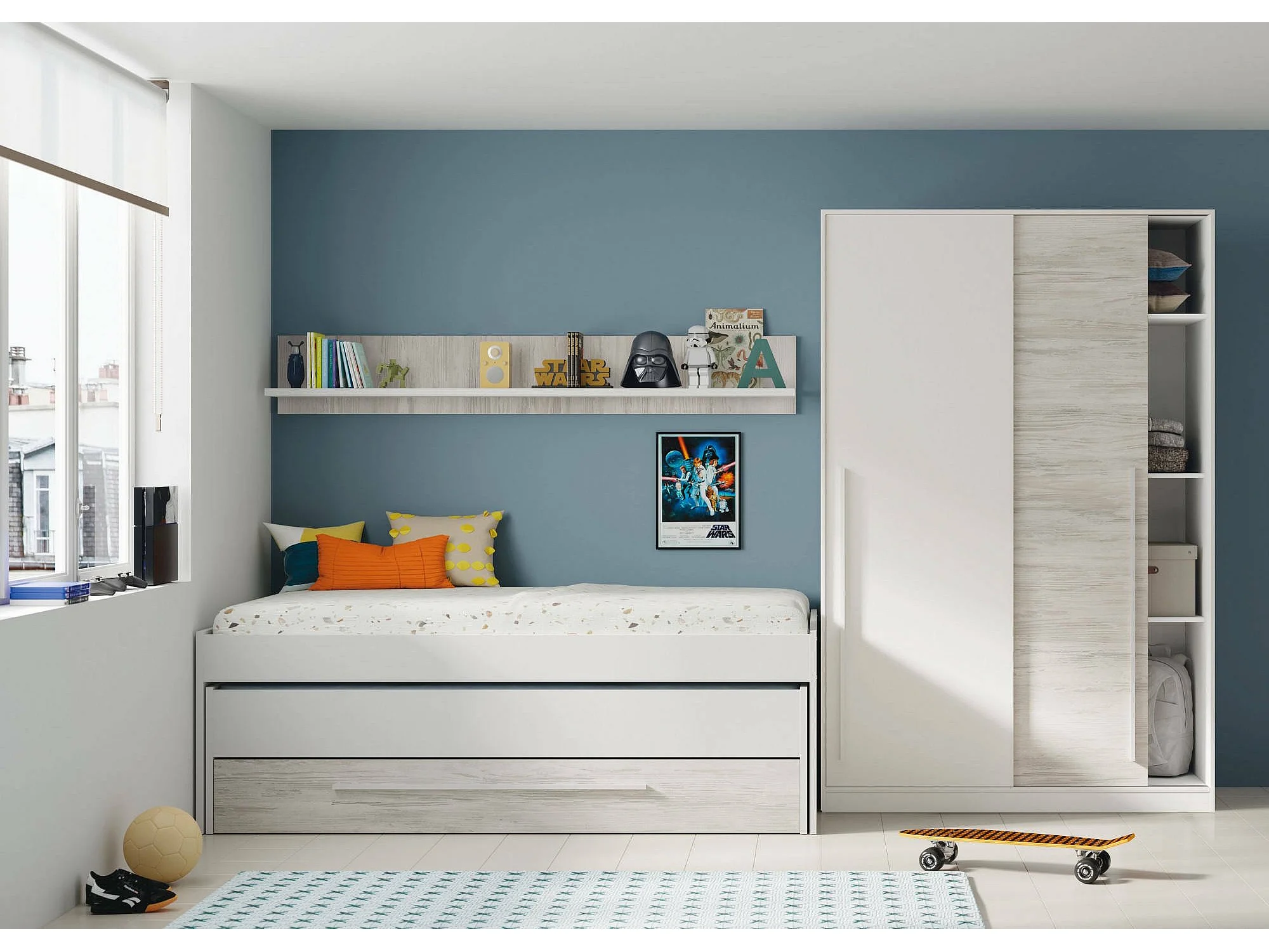 Lit simple Sunnyvale, Cadre de lit pour chambre à coucher, Lit simple avec lit extractible et tiroir et étagère assortie, 199x96h65 cm, Blanc